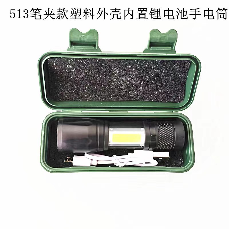 • 513S 펜 홀더 플라스틱 손전등 + USB 라인 + 녹색 플라스틱 선물 상자