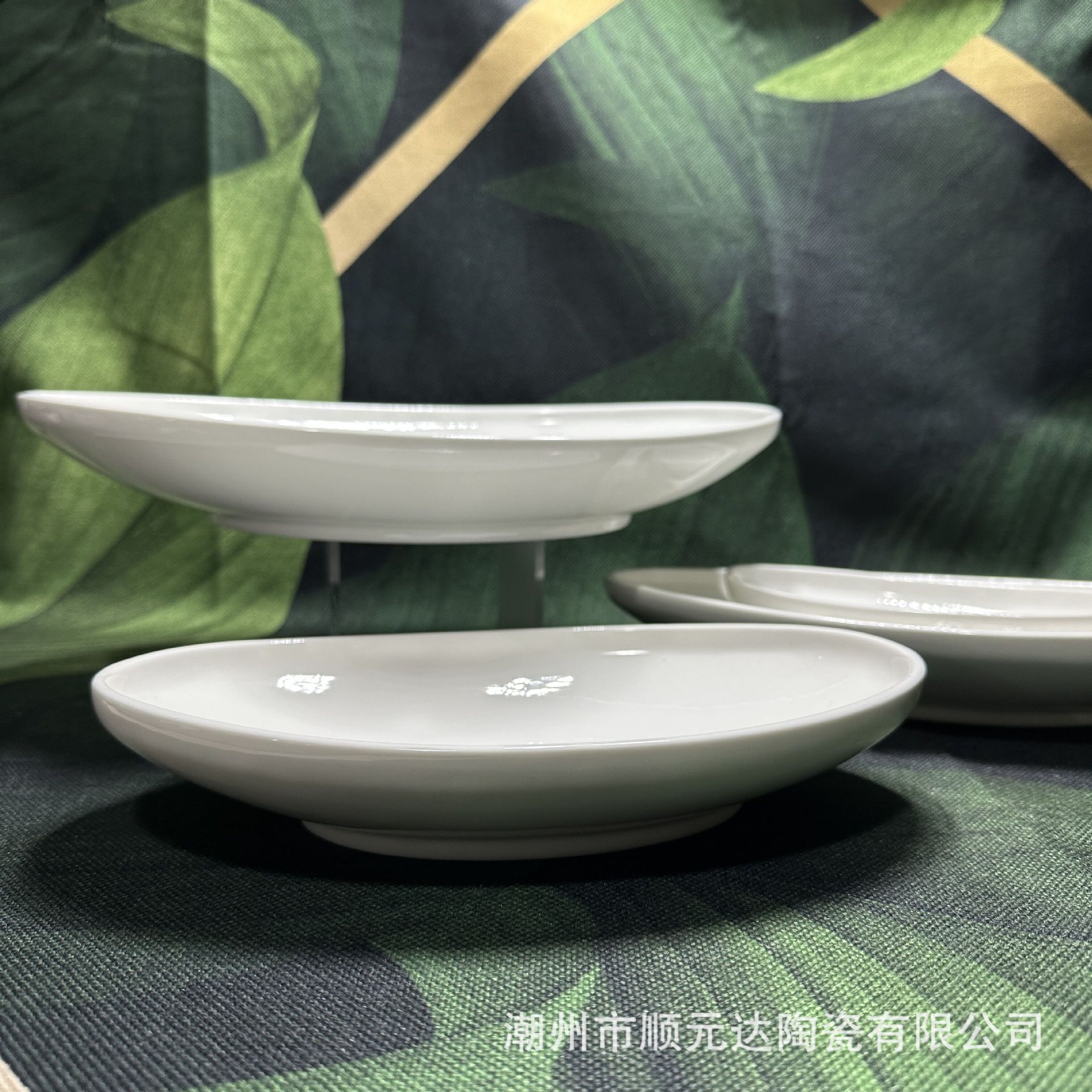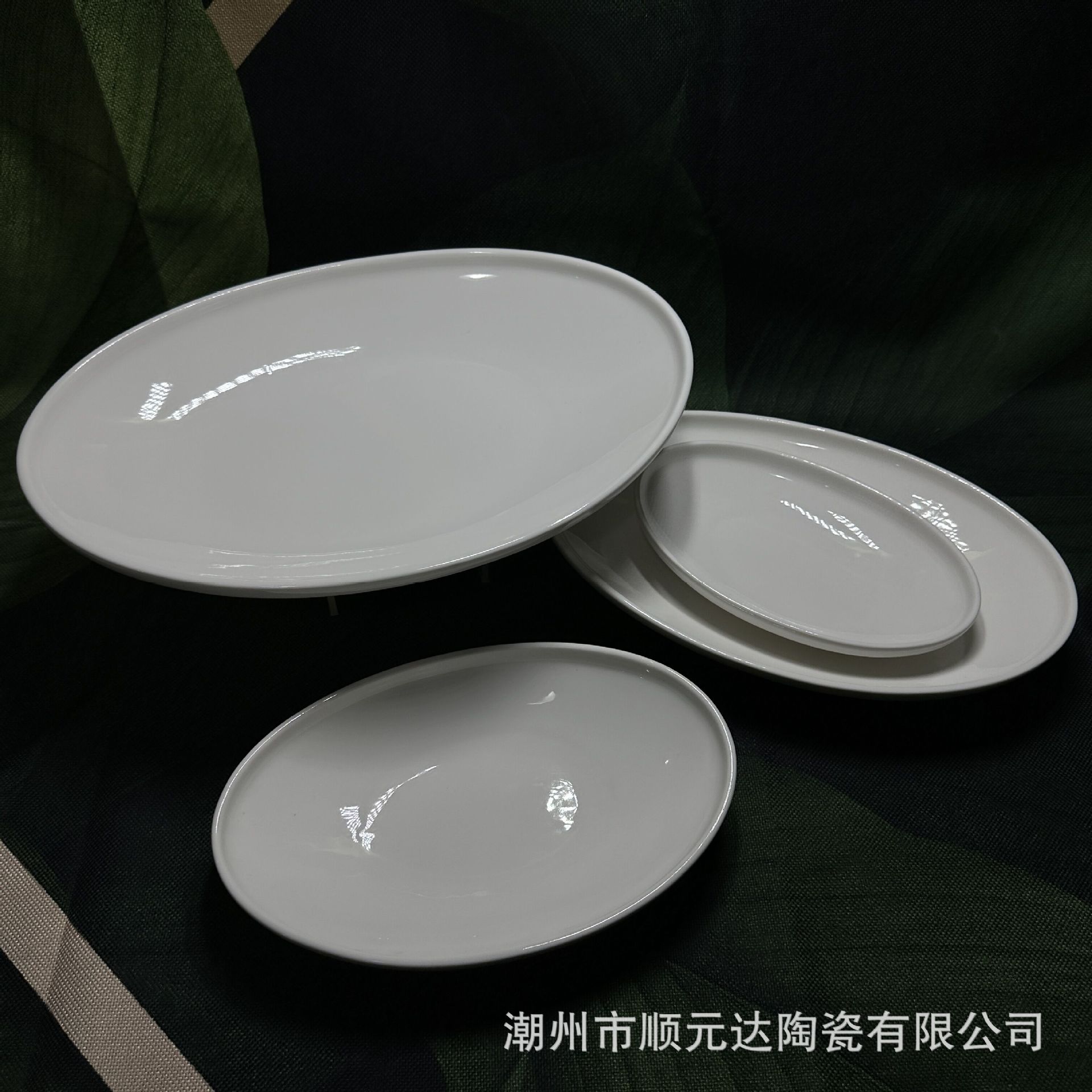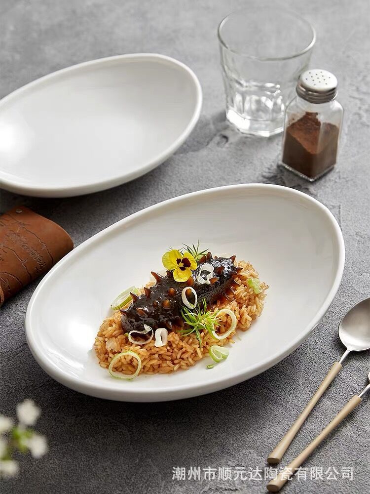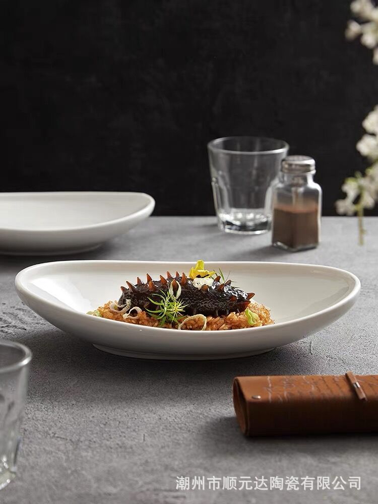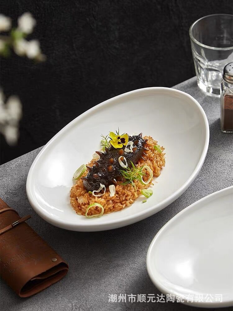 호텔 퓨어 화이트 세라믹 타원형 풋 플레이트 레스토랑 클럽 컨캐브 모양 차가운 요리 차가운 접시 접시 식기스토어 가기