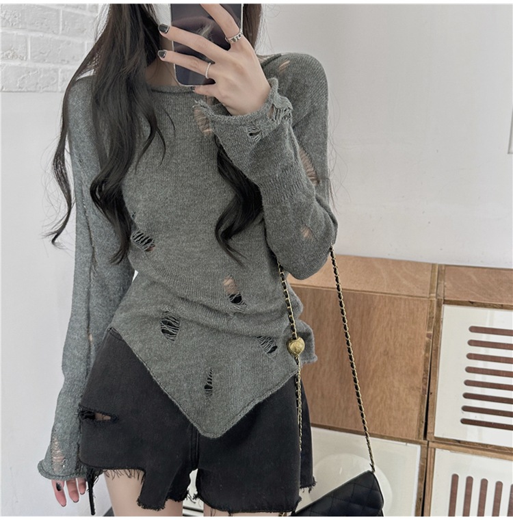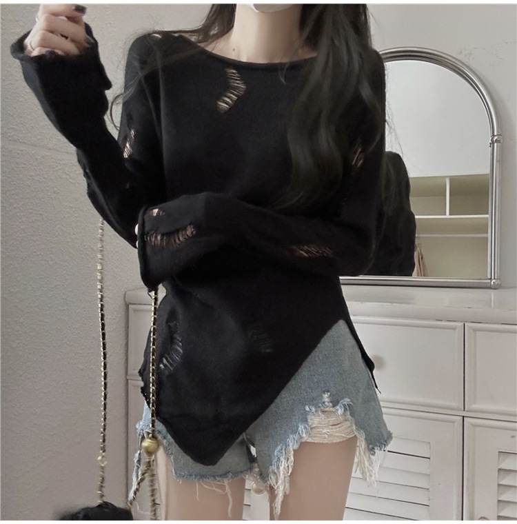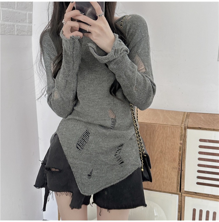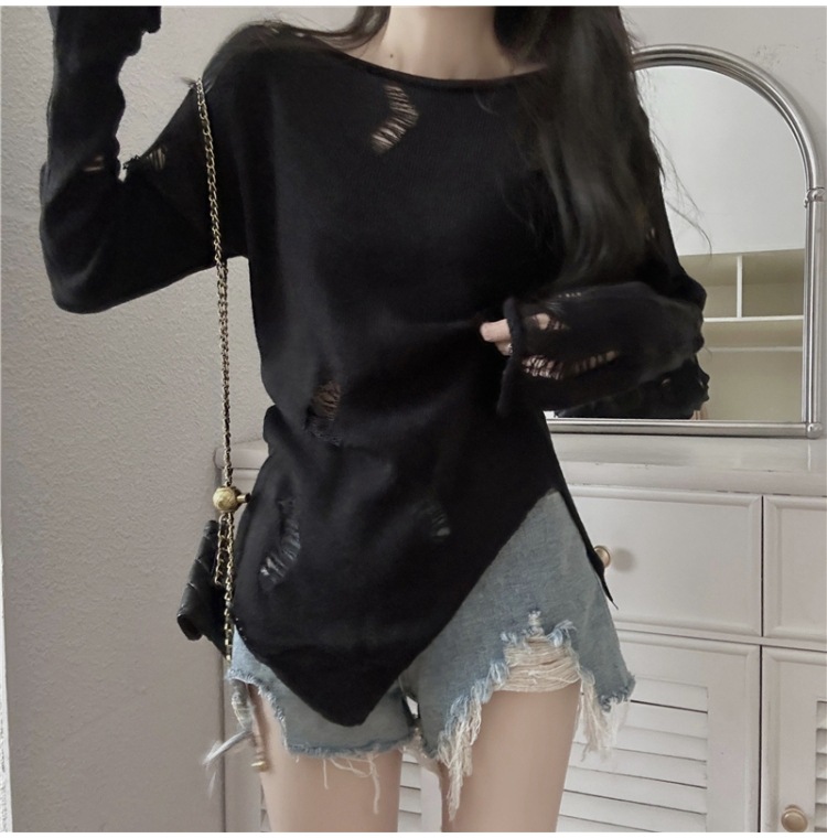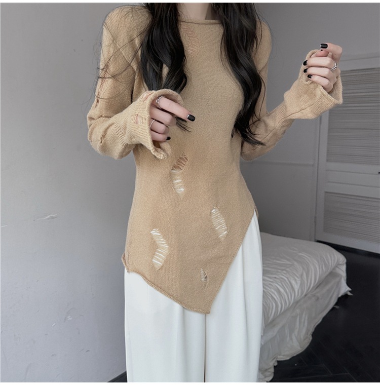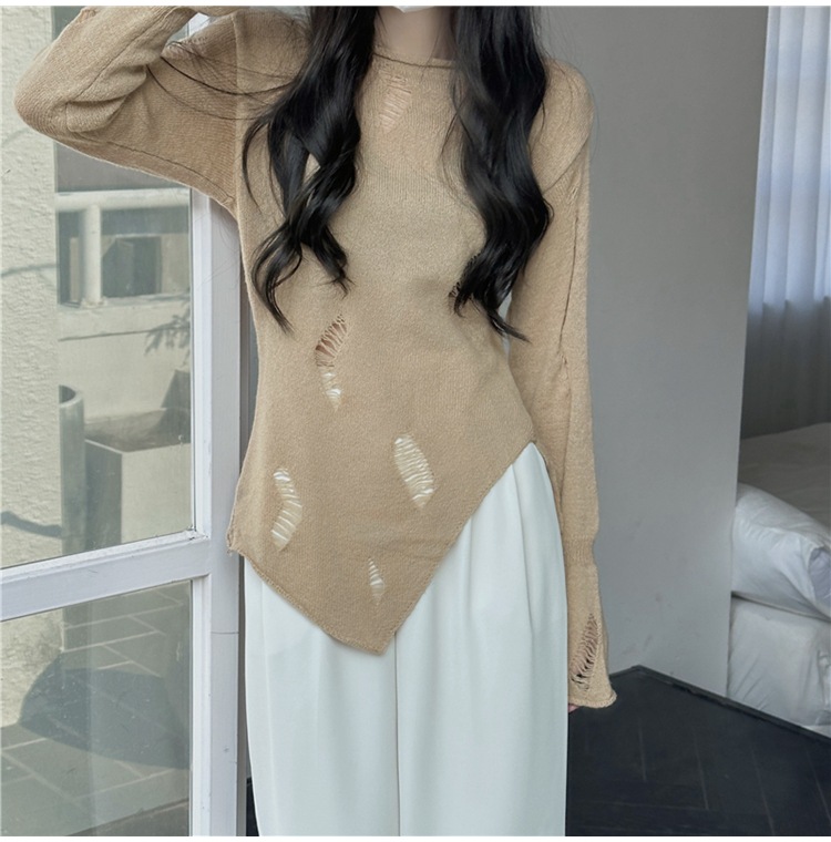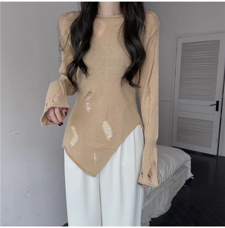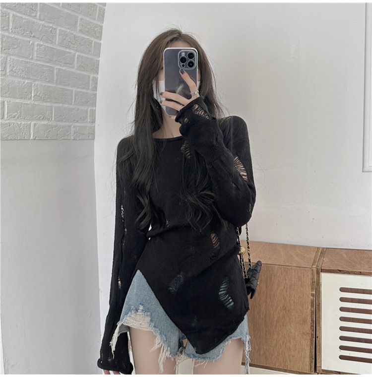 불규칙한 중공 니트웨어 여성용 가을 얇은 명주 그물 선 스크린 블라우스 중간 길이 느슨한 스플릿 시크 셔츠 탑