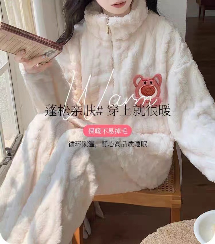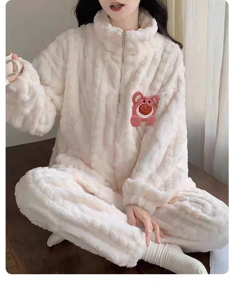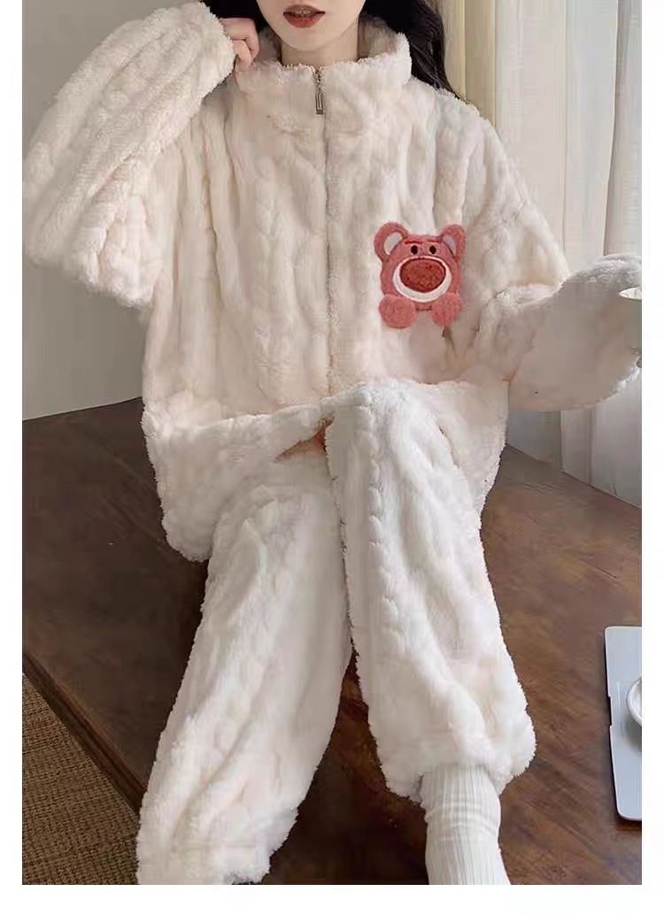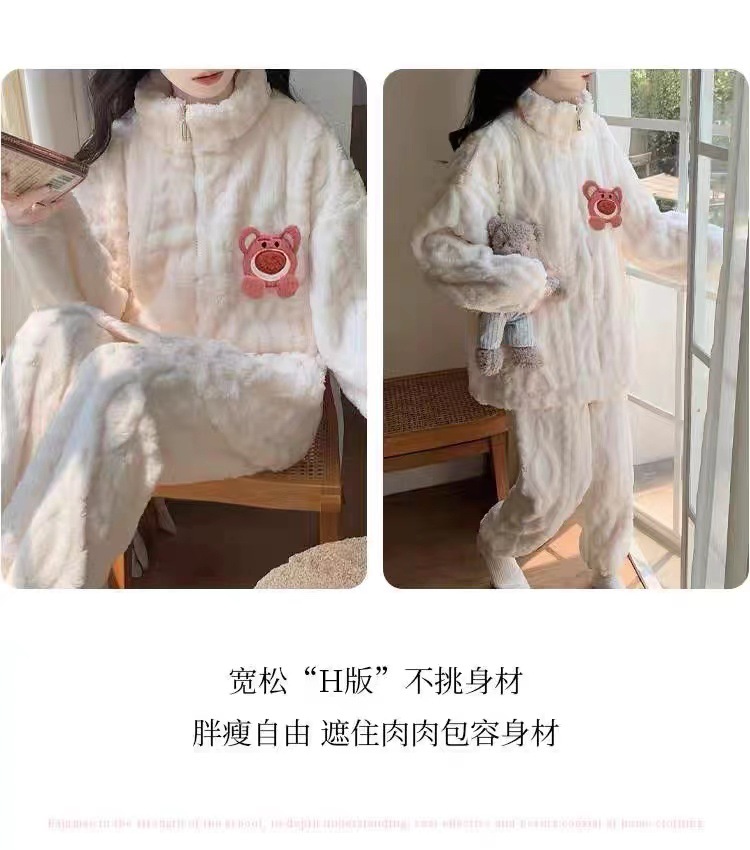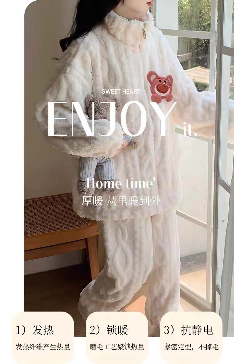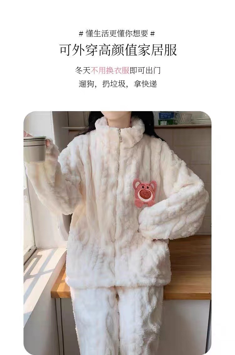 산호 양털 잠옷 여자의 봄 가을과 겨울 두꺼운 따뜻한 귀여운 플란넬 가정 옷 공주 스타일 세트 핑크 곰스토어 가기