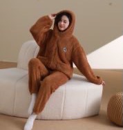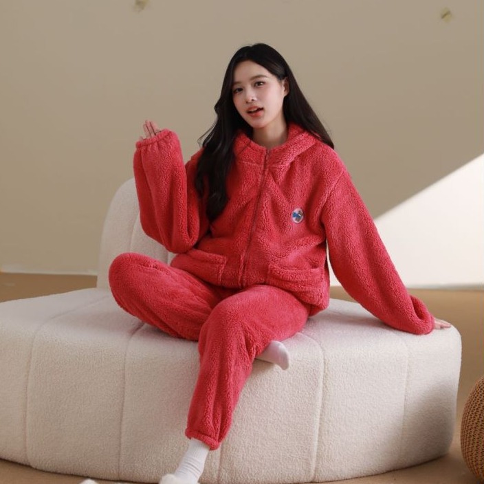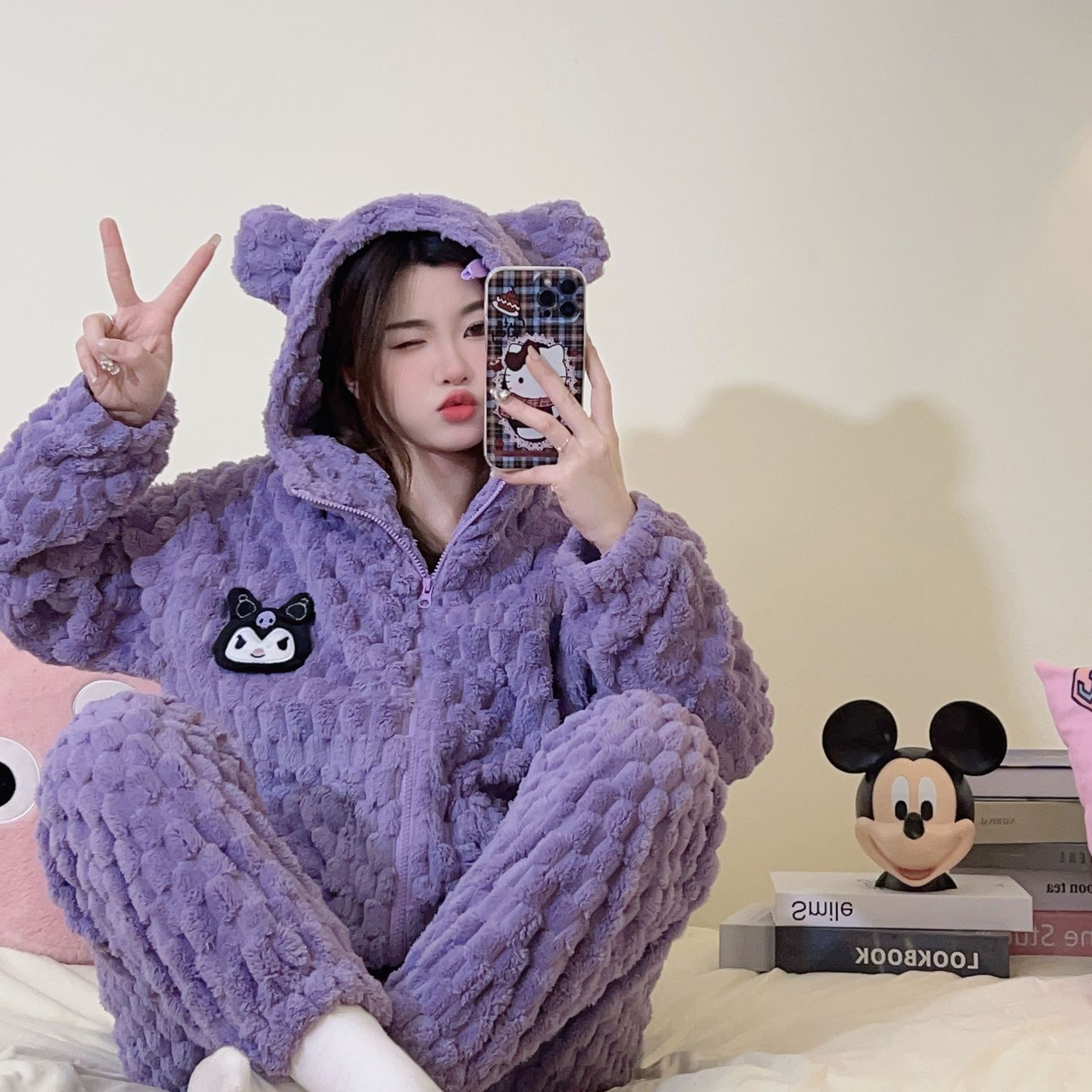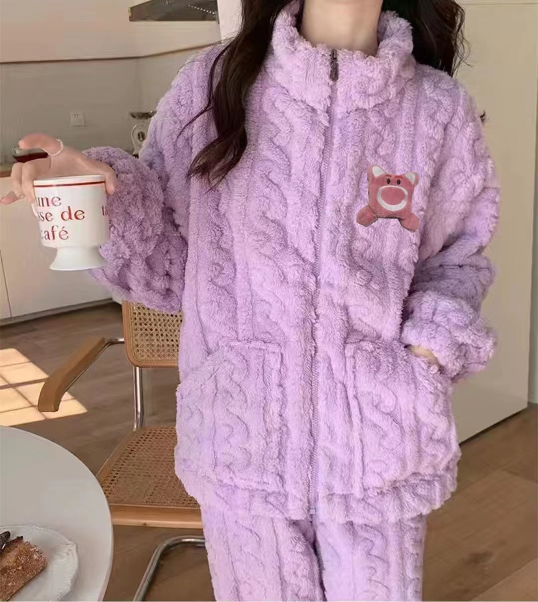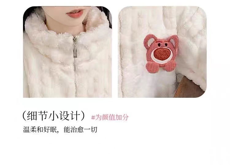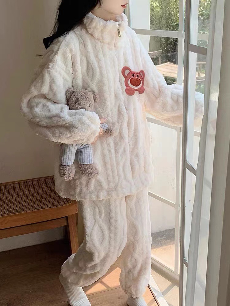 산호 양털 잠옷 여자의 봄 가을과 겨울 두꺼운 따뜻한 귀여운 플란넬 가정 옷 공주 스타일 세트 핑크 곰스토어 가기