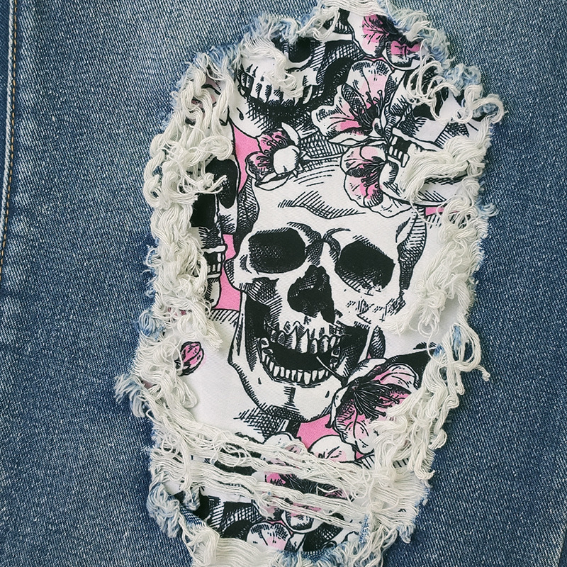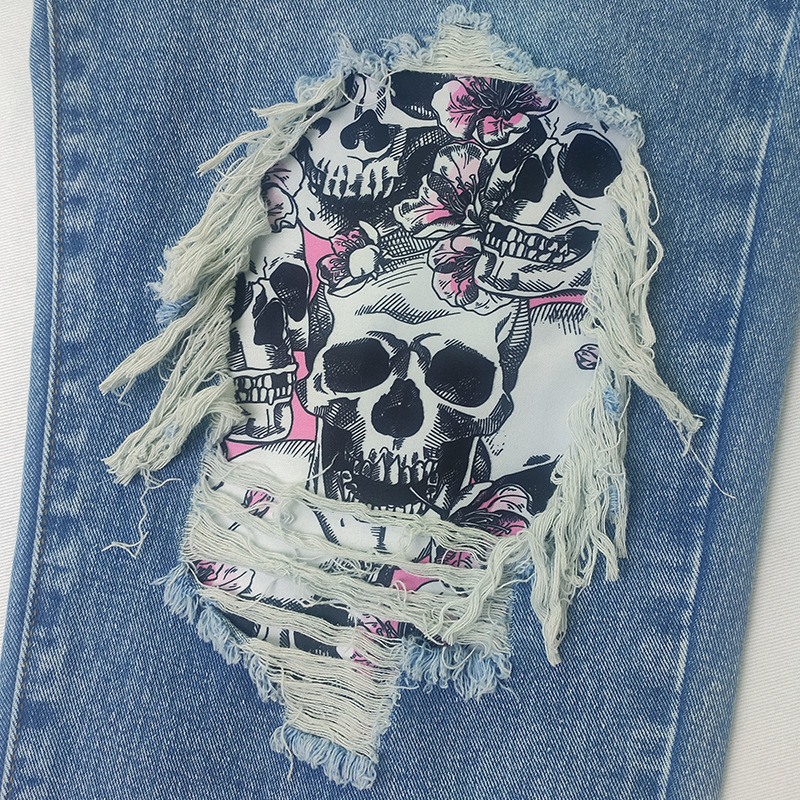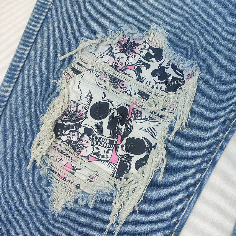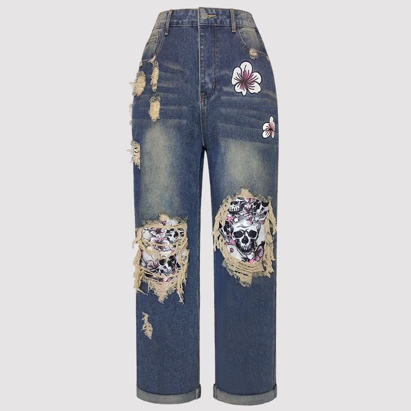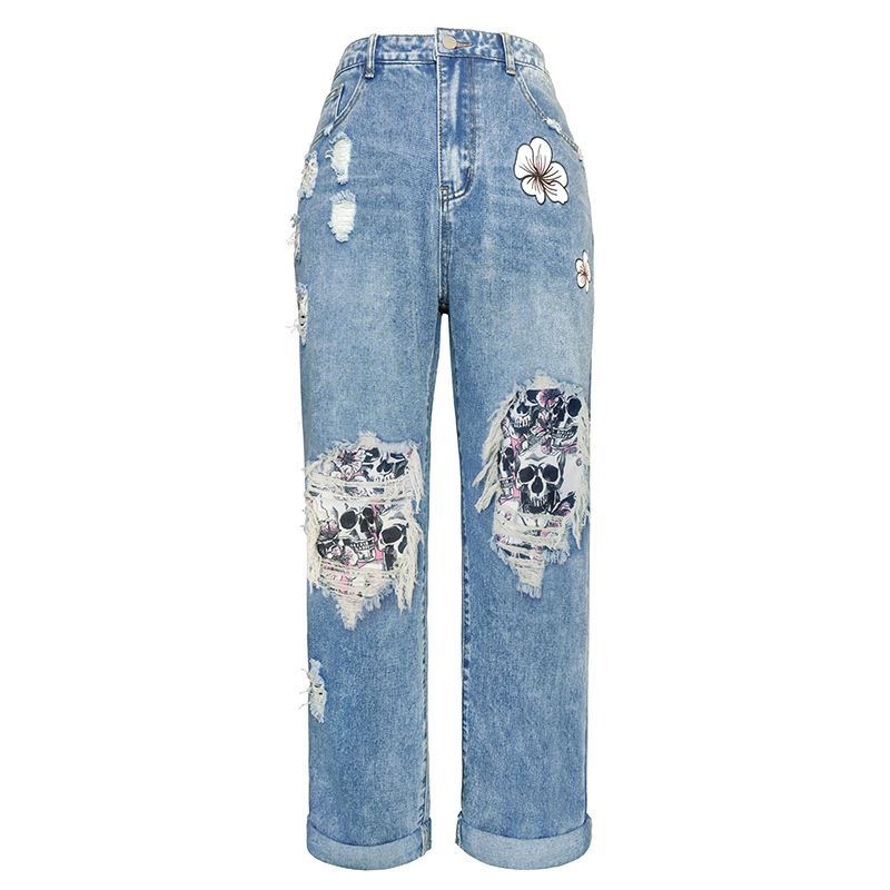 외국 무역 여자의 청바지 찢어진 유행 해골 아마존 새로운 유럽과 미국 스트레이트 컬 플러스 사이즈 바지스토어 가기