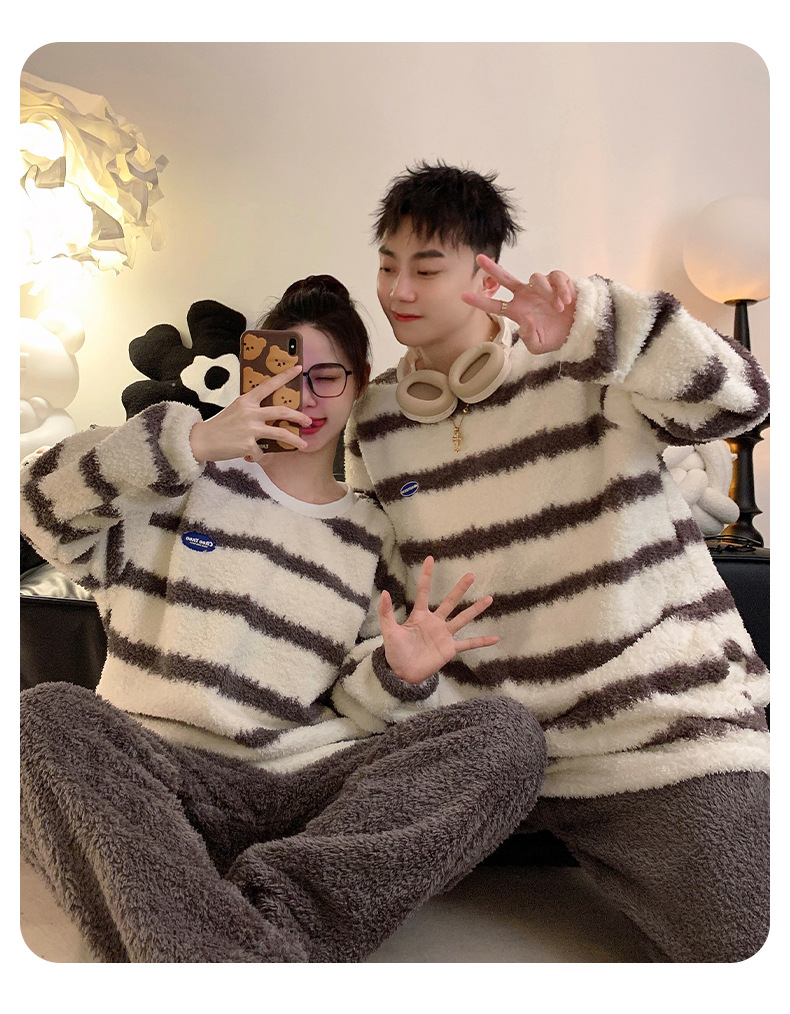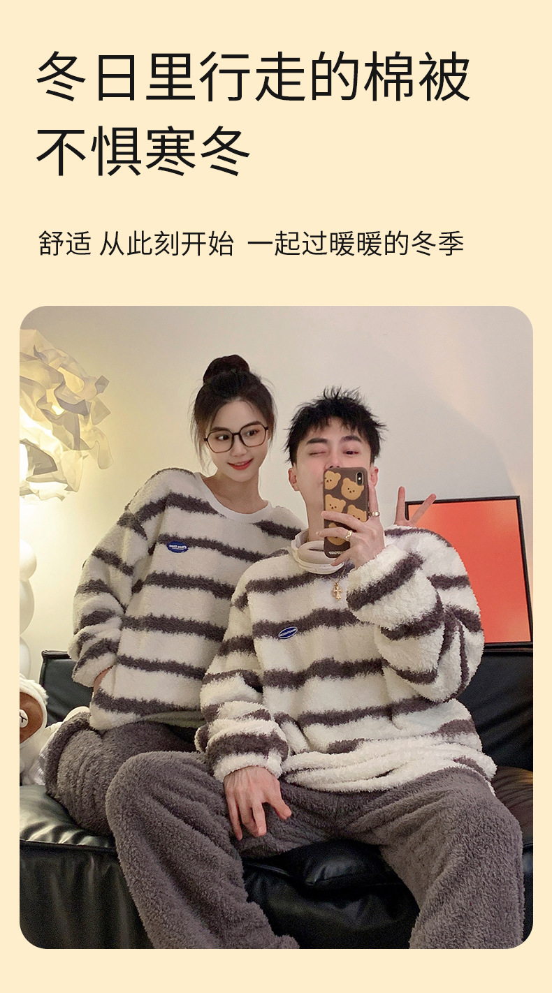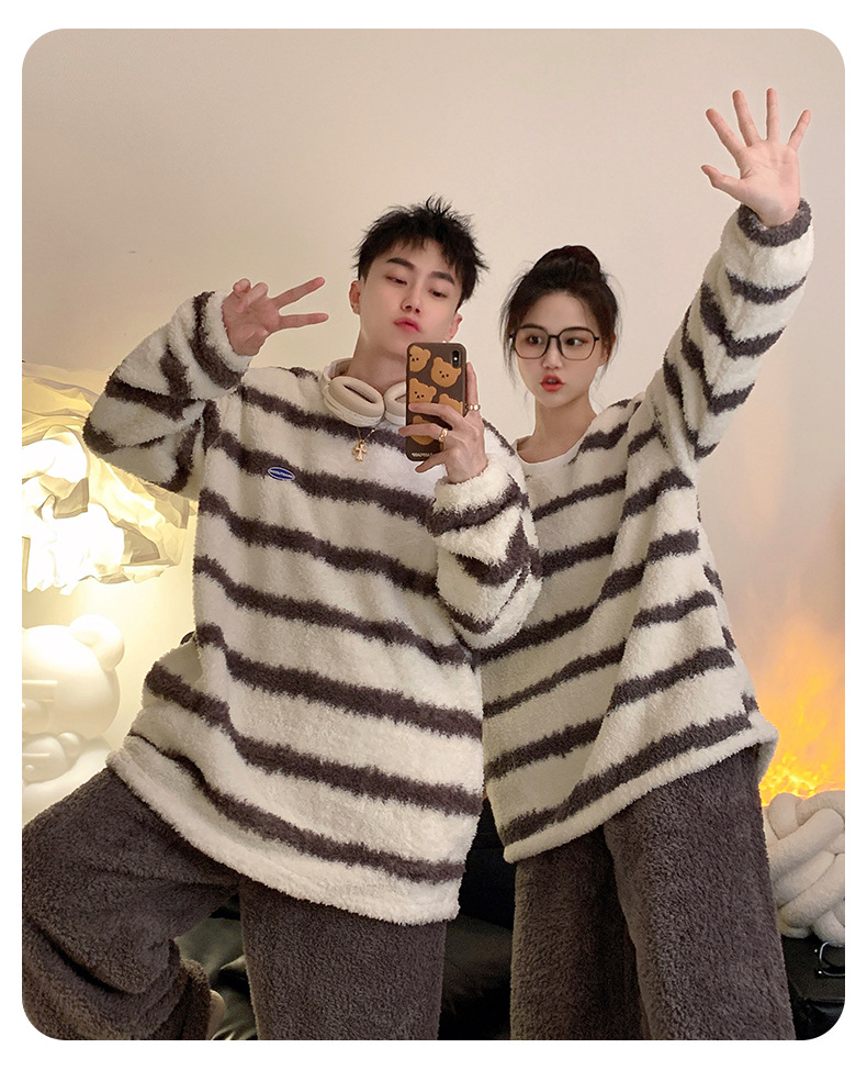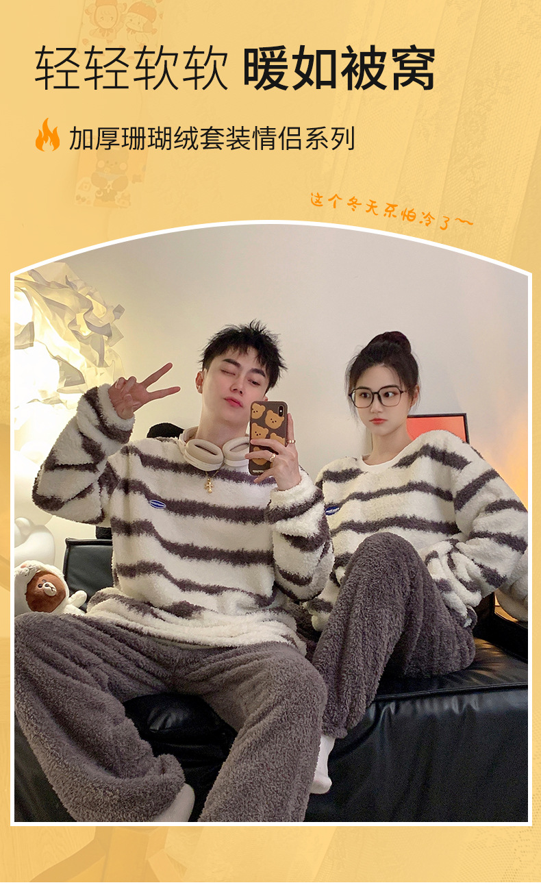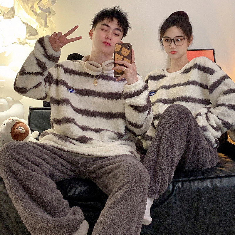 줄무늬 봉제 커플 잠옷 기모 두꺼운 가을과 겨울 산호 양털 남녀 인터넷 플란넬 홈 옷스토어 가기