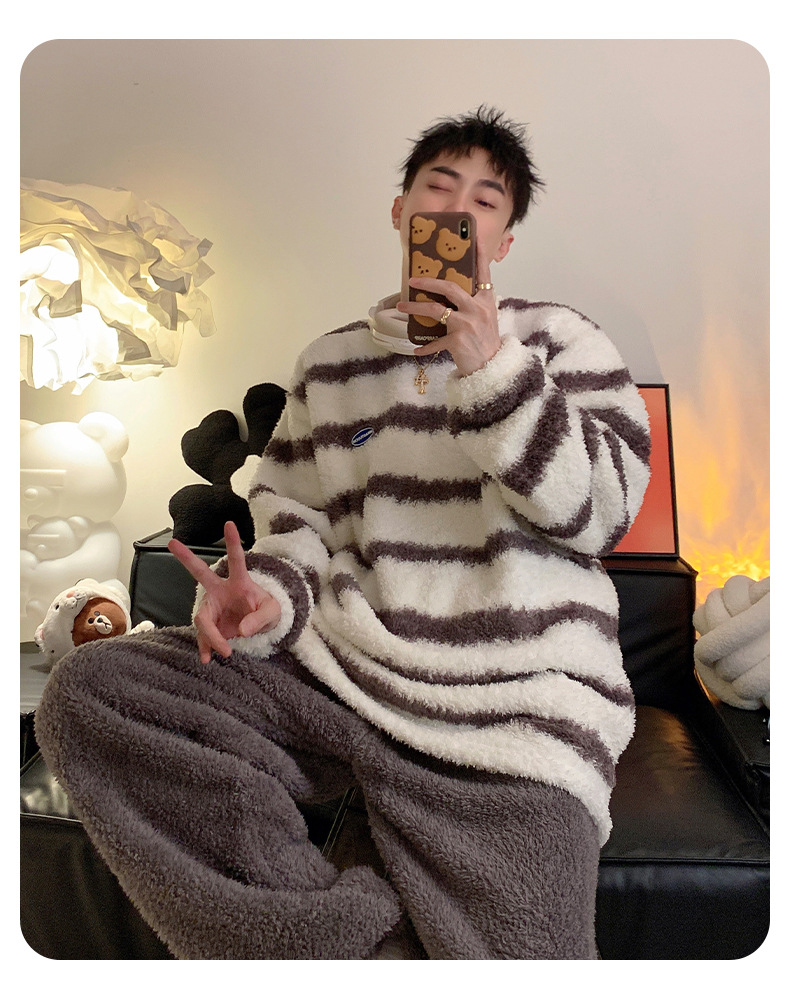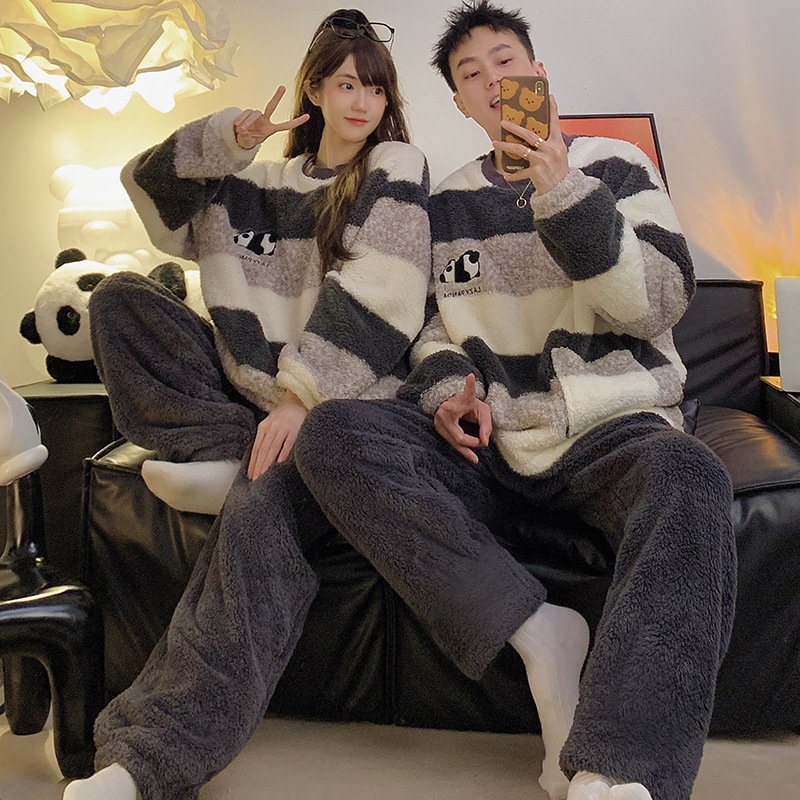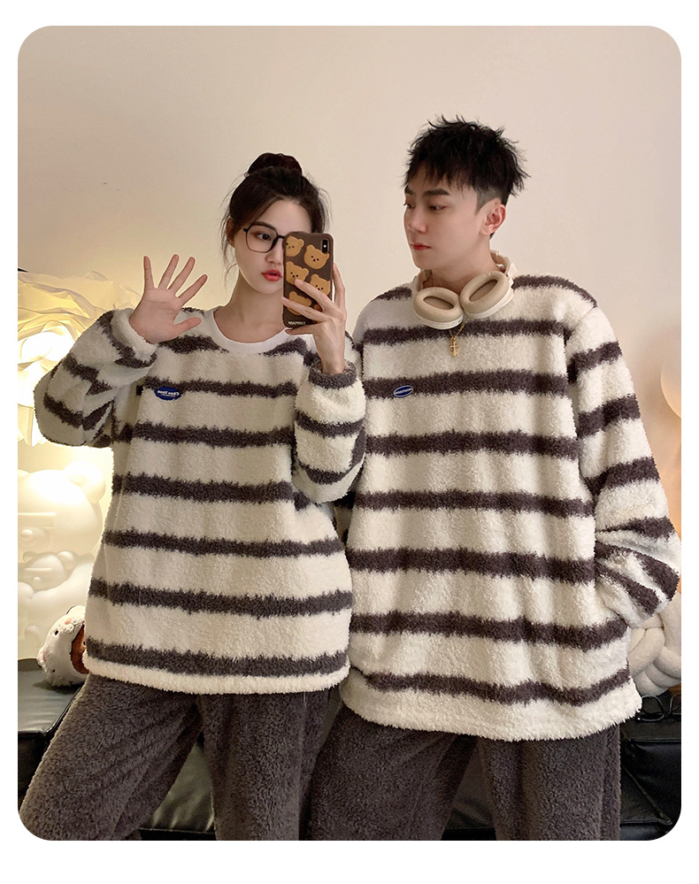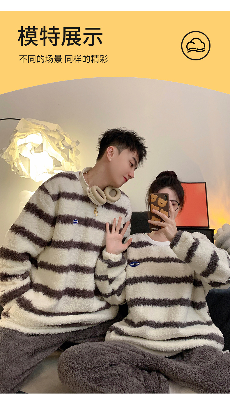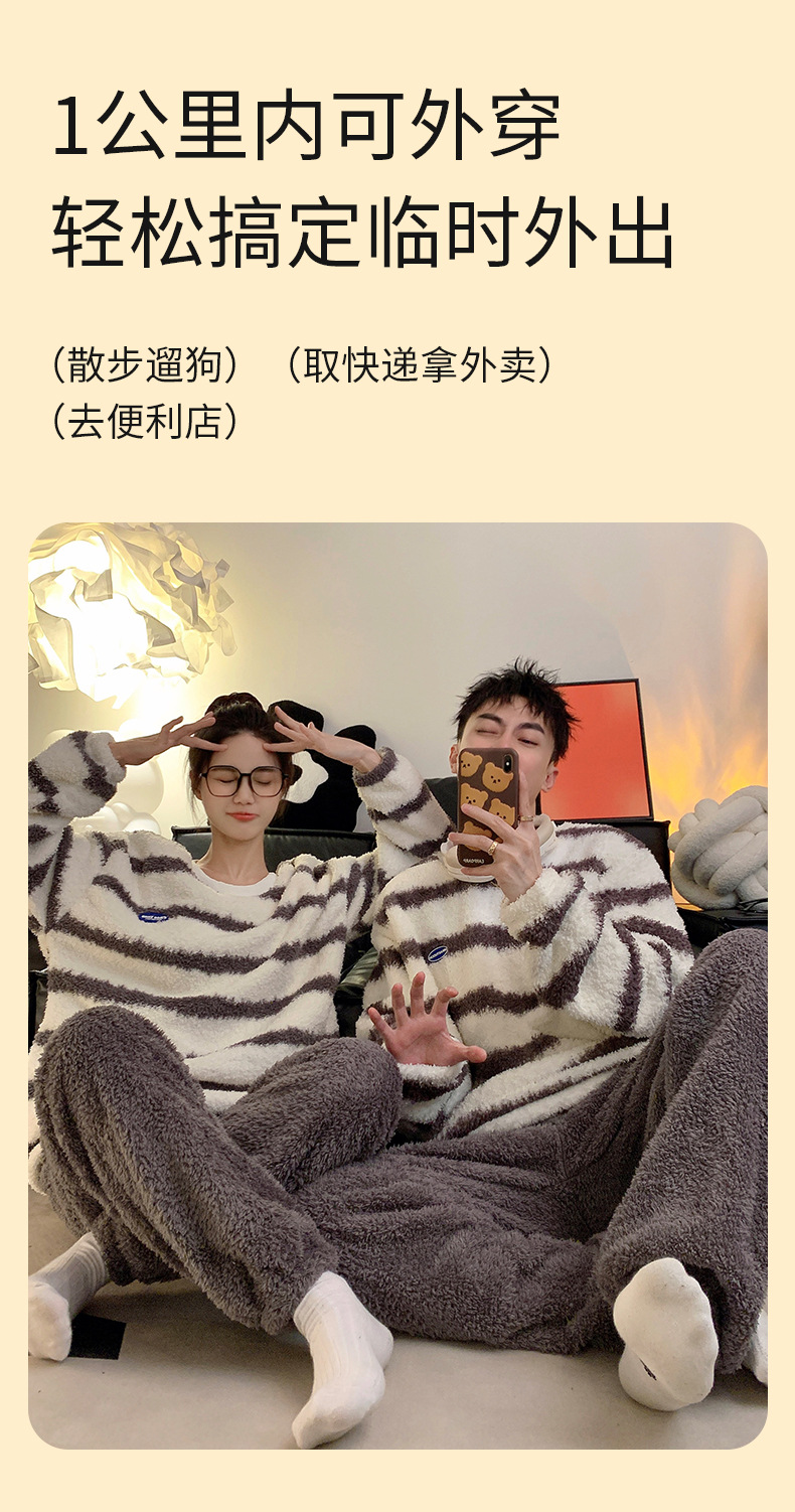 줄무늬 봉제 커플 잠옷 기모 두꺼운 가을과 겨울 산호 양털 남녀 인터넷 플란넬 홈 옷스토어 가기