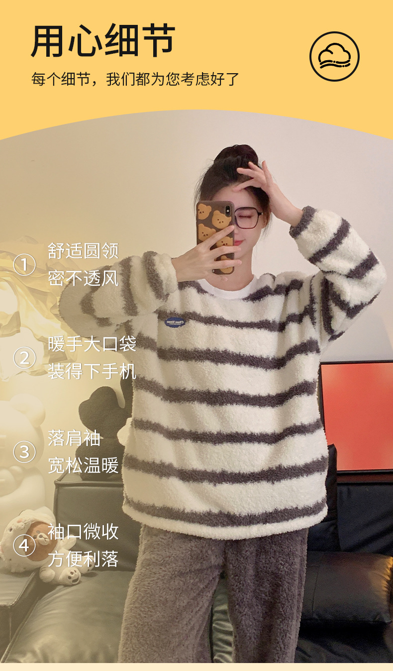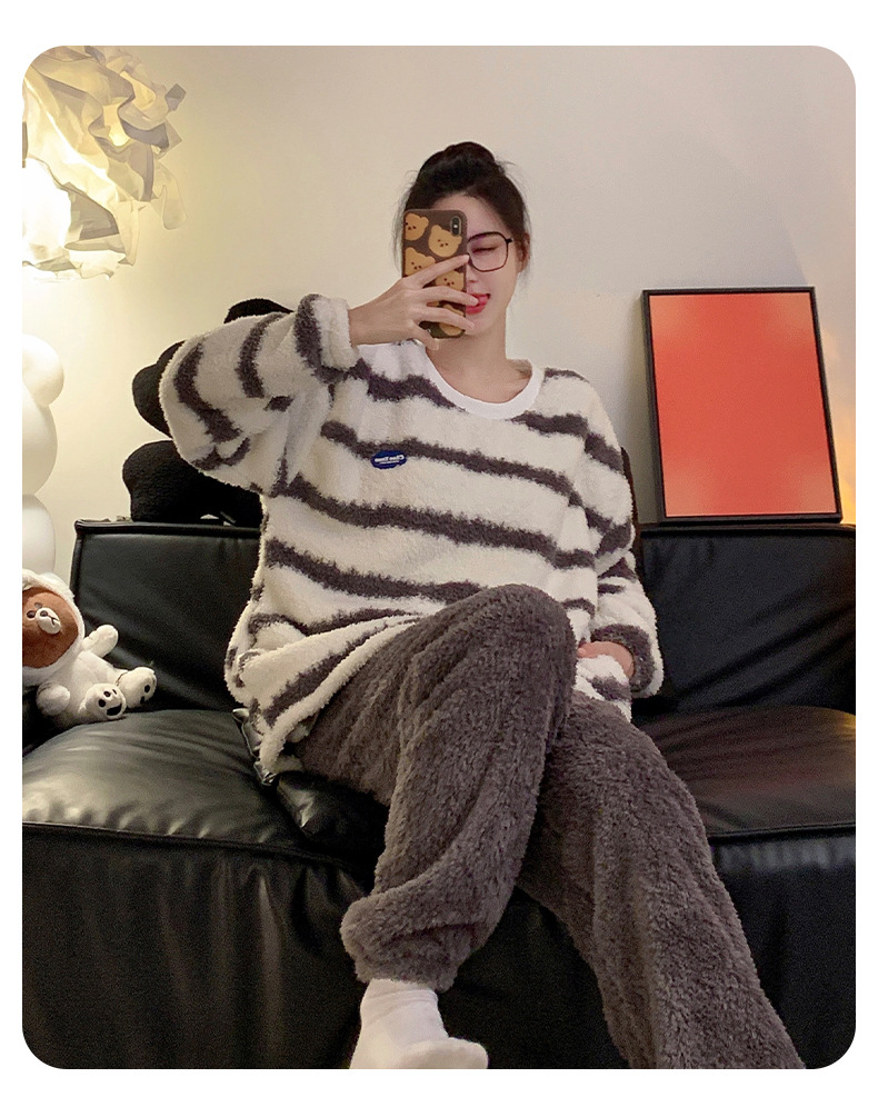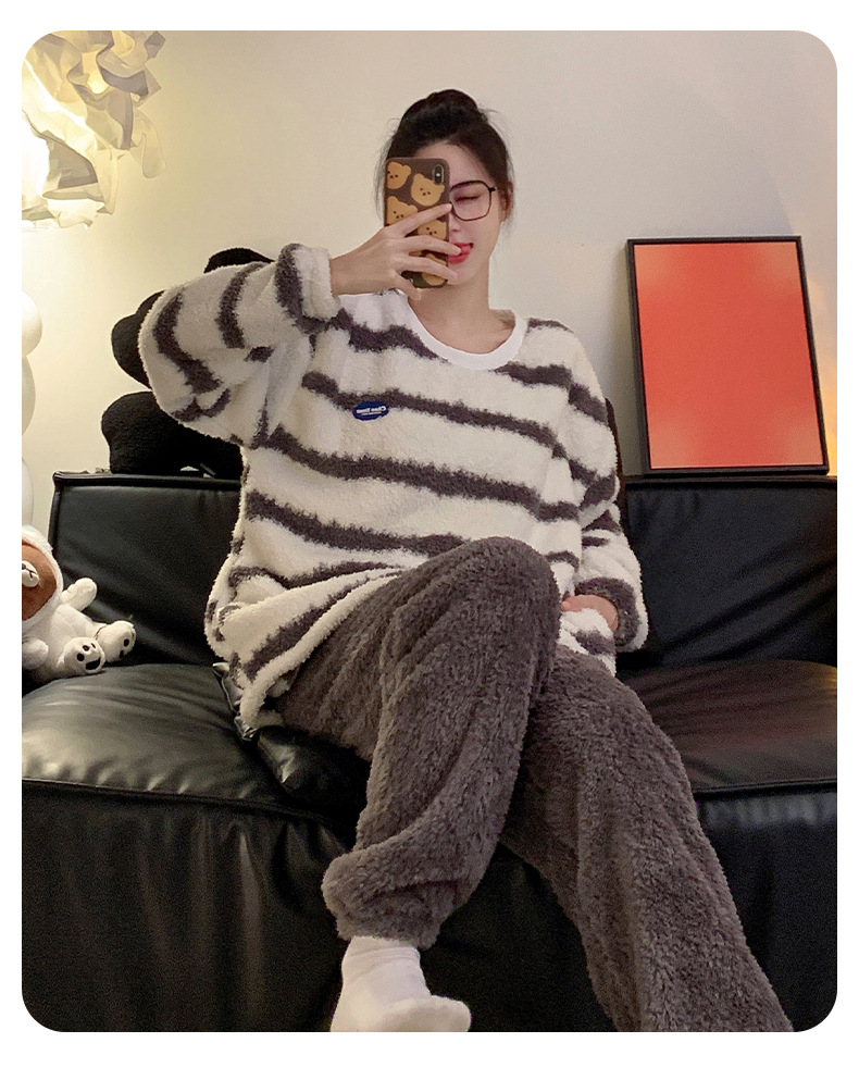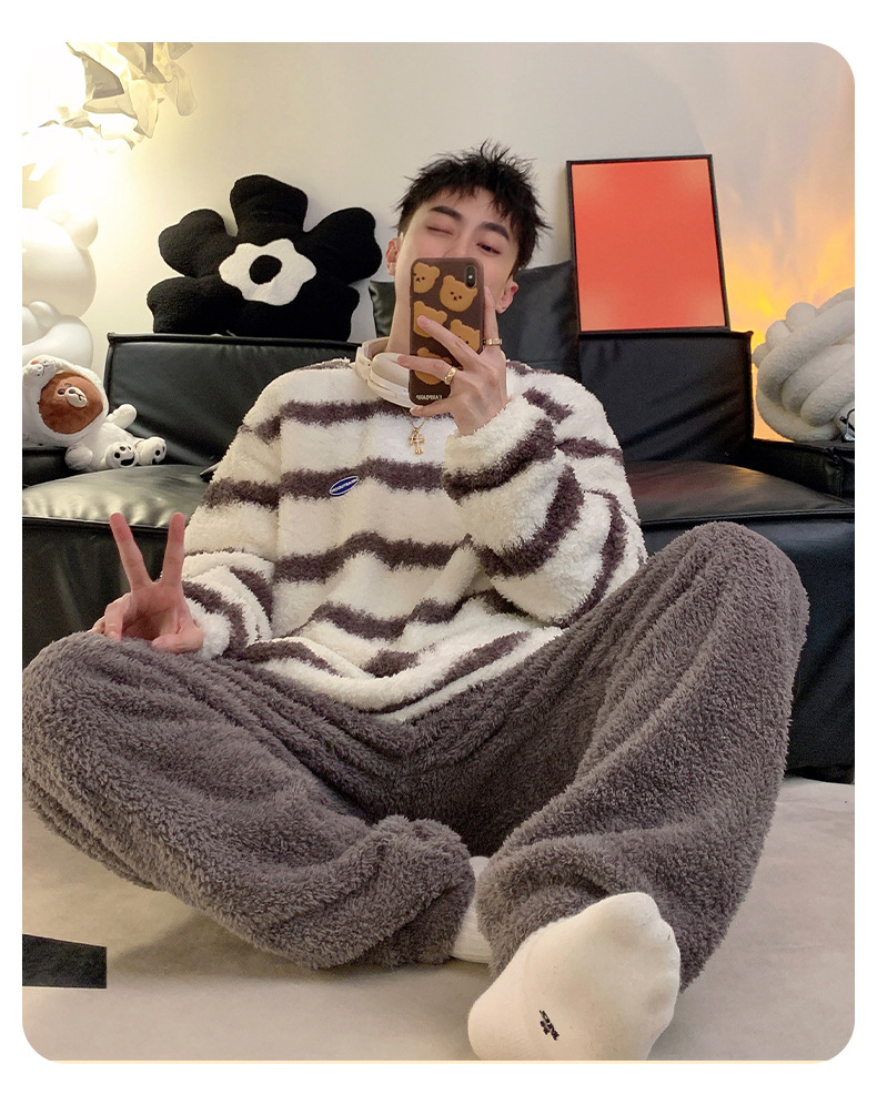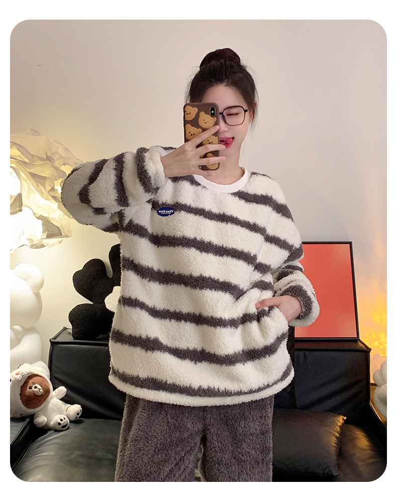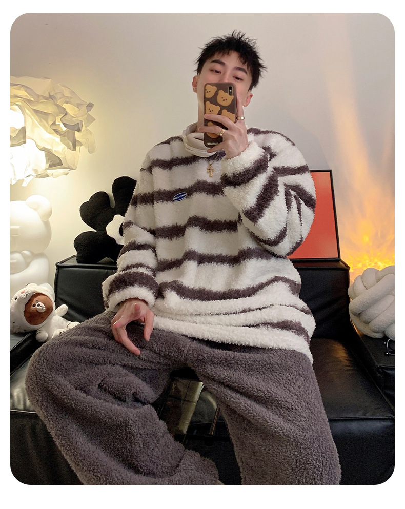 줄무늬 봉제 커플 잠옷 기모 두꺼운 가을과 겨울 산호 양털 남녀 인터넷 플란넬 홈 옷스토어 가기
