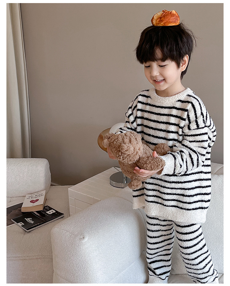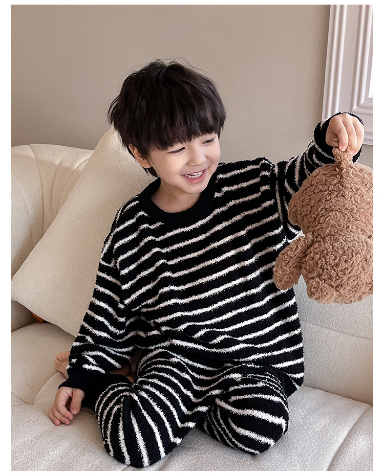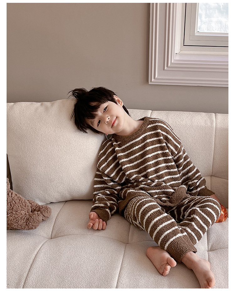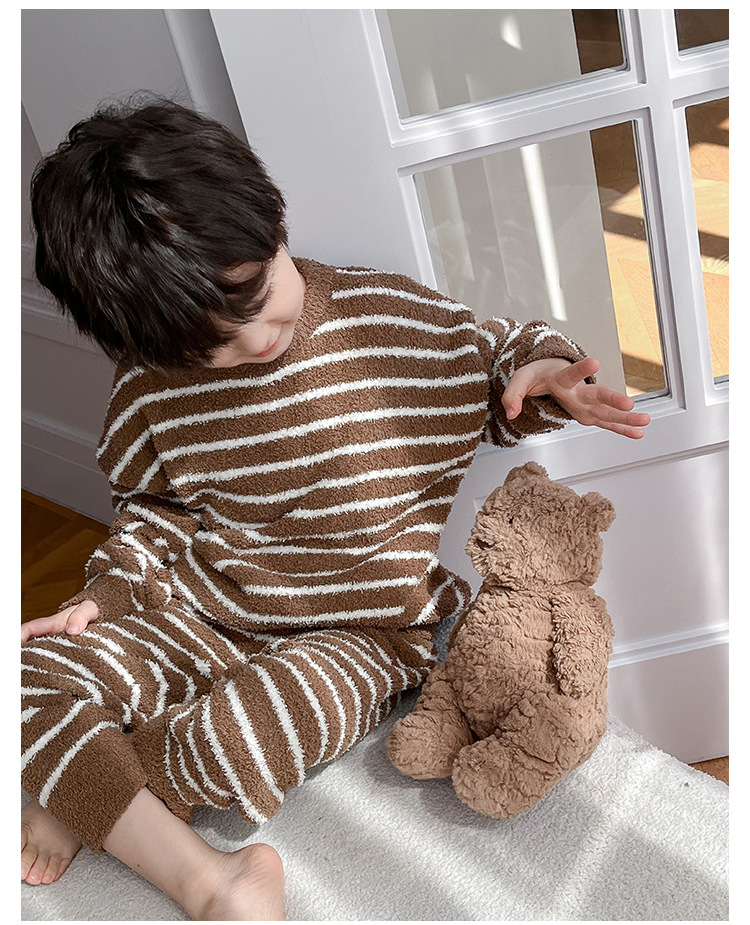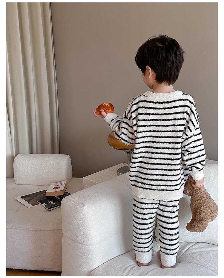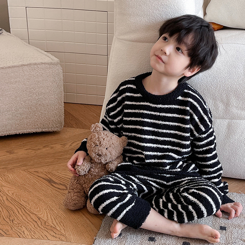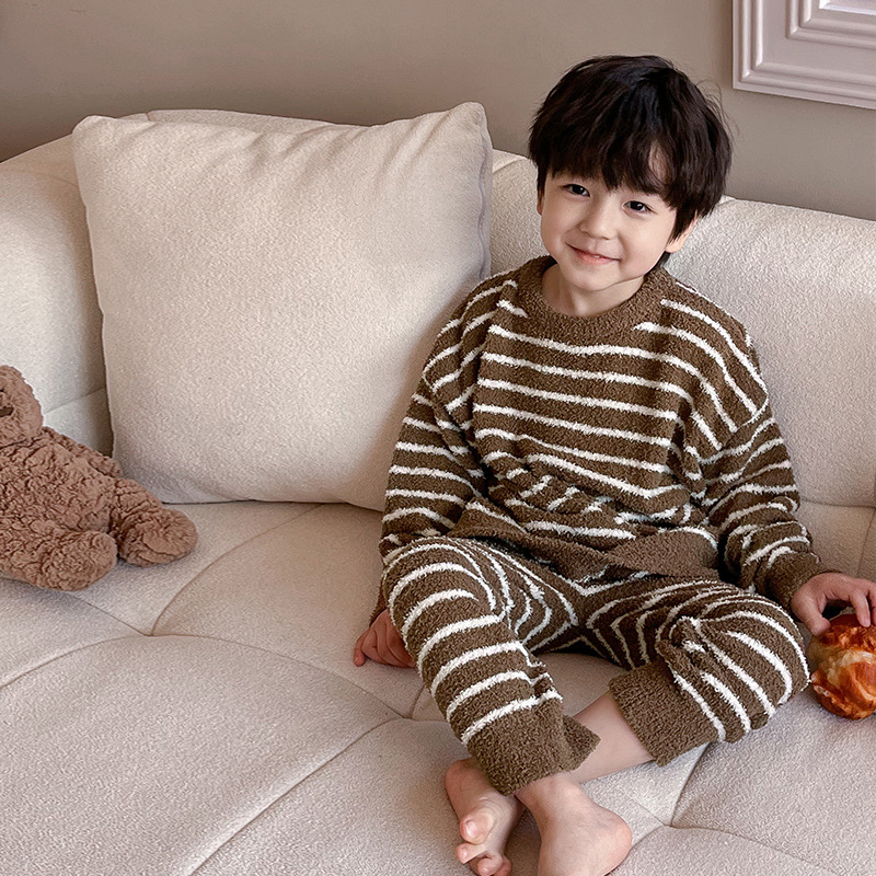 【클리어런스 특가】아동용 겨울 한국 스타일 아기 홈웨어 두꺼운 산호 벨벳 줄무늬 남아 잠옷 세트스토어 가기