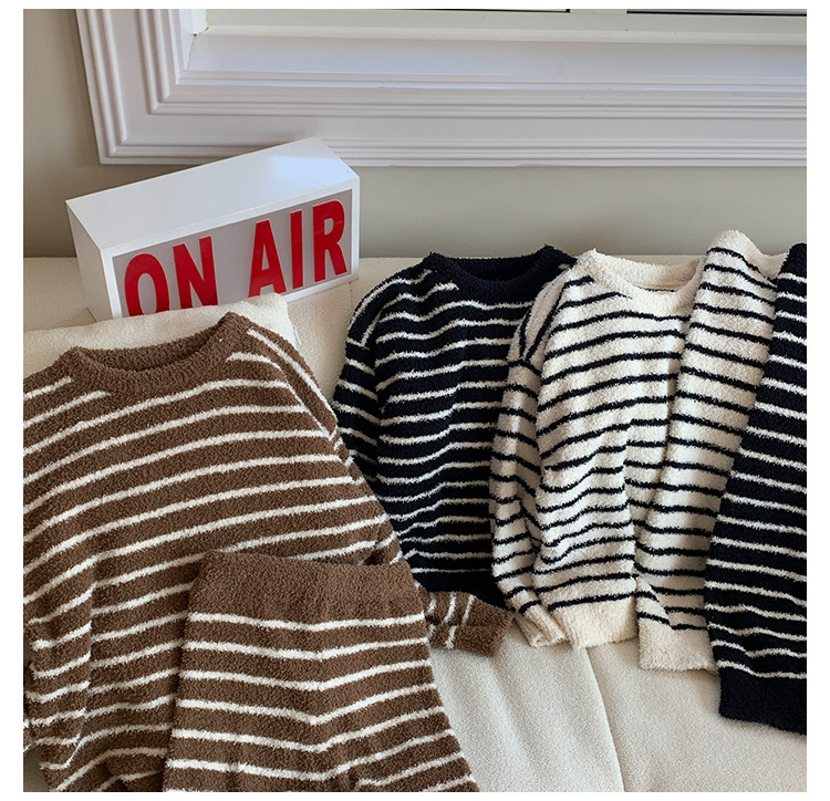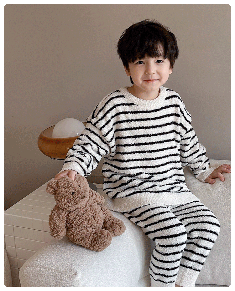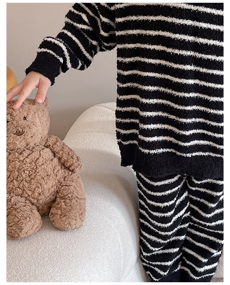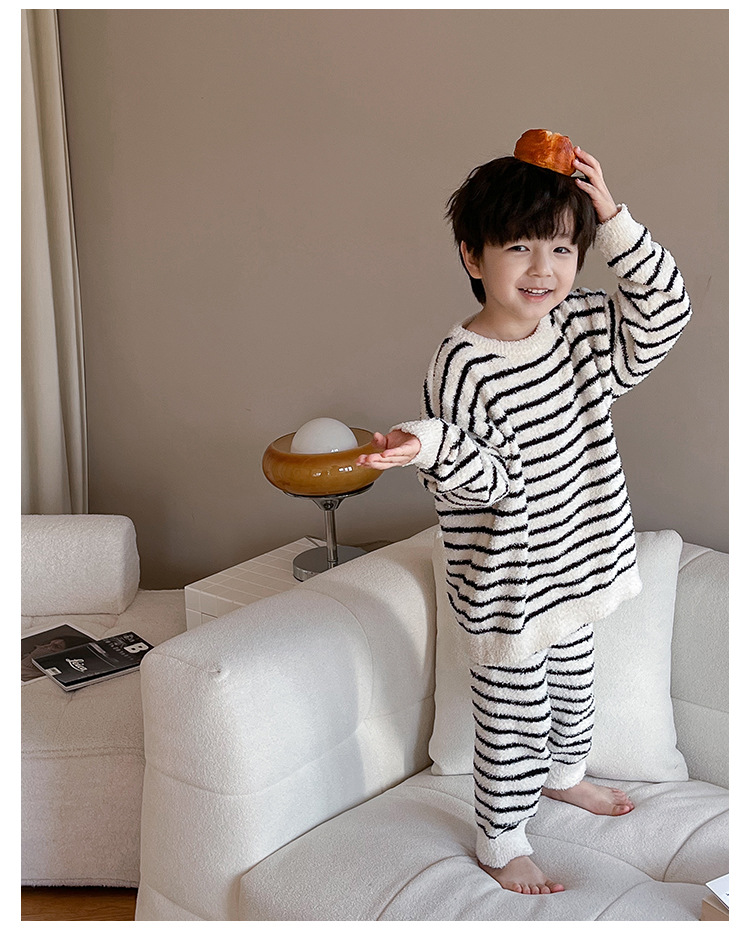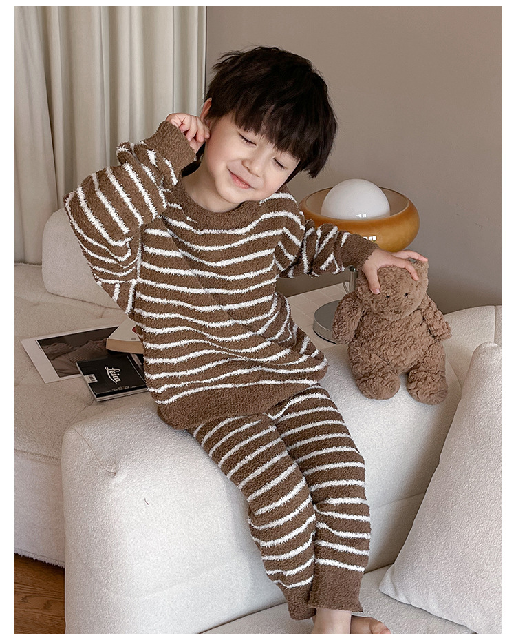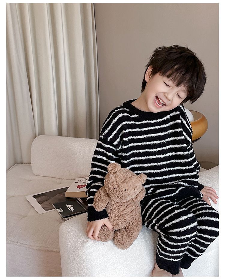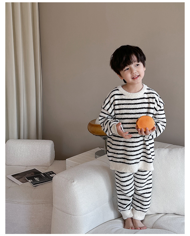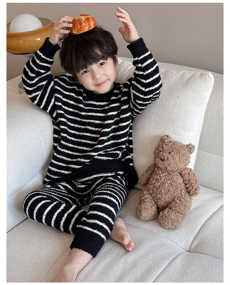 【클리어런스 특가】아동용 겨울 한국 스타일 아기 홈웨어 두꺼운 산호 벨벳 줄무늬 남아 잠옷 세트스토어 가기