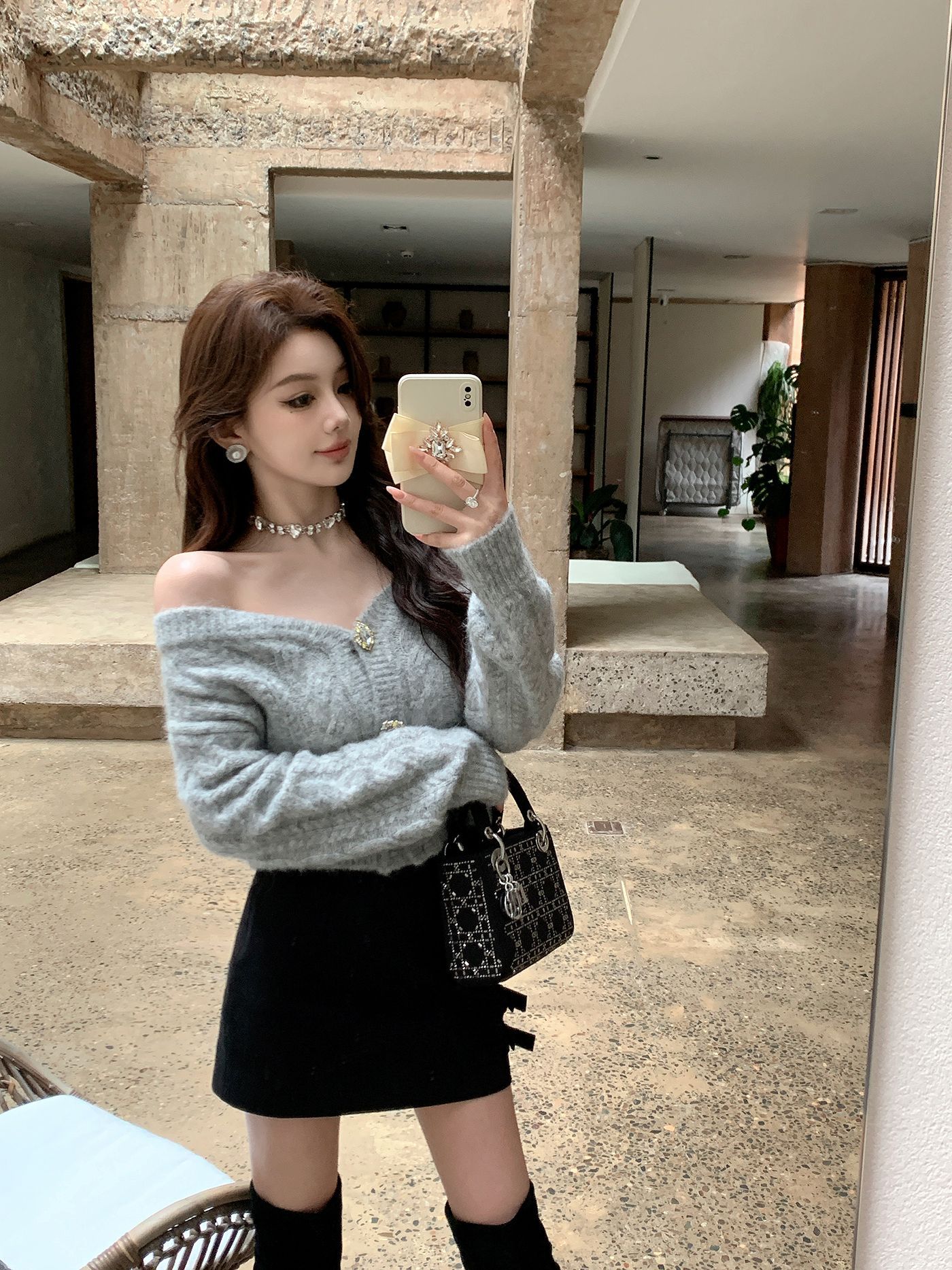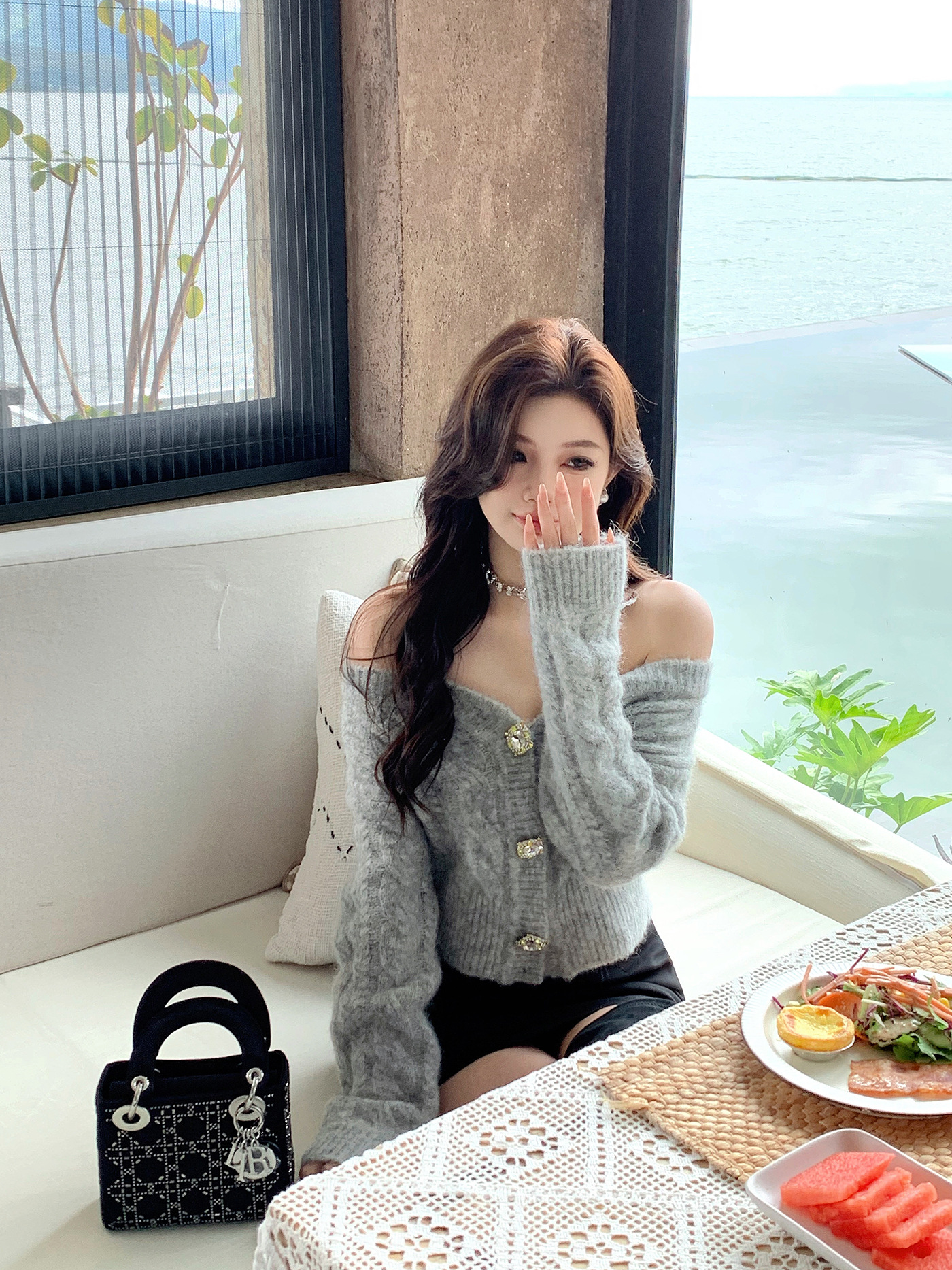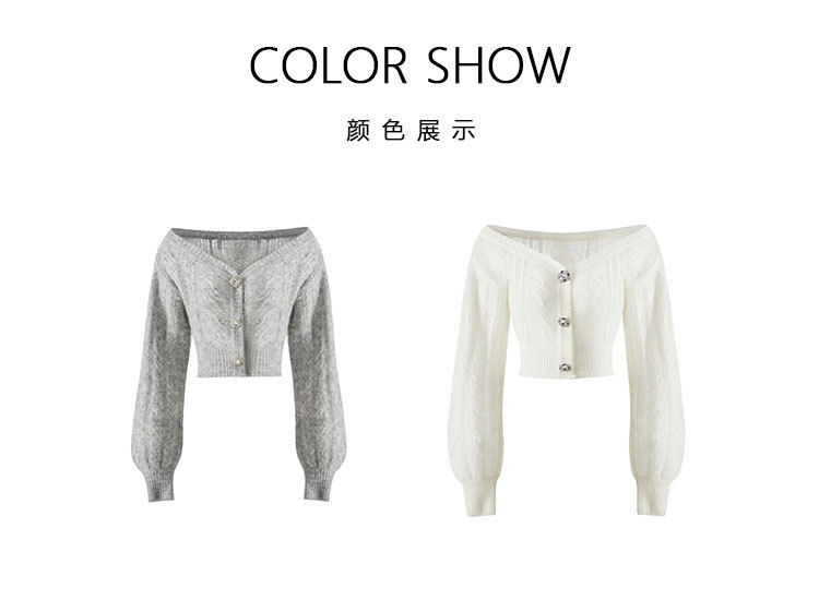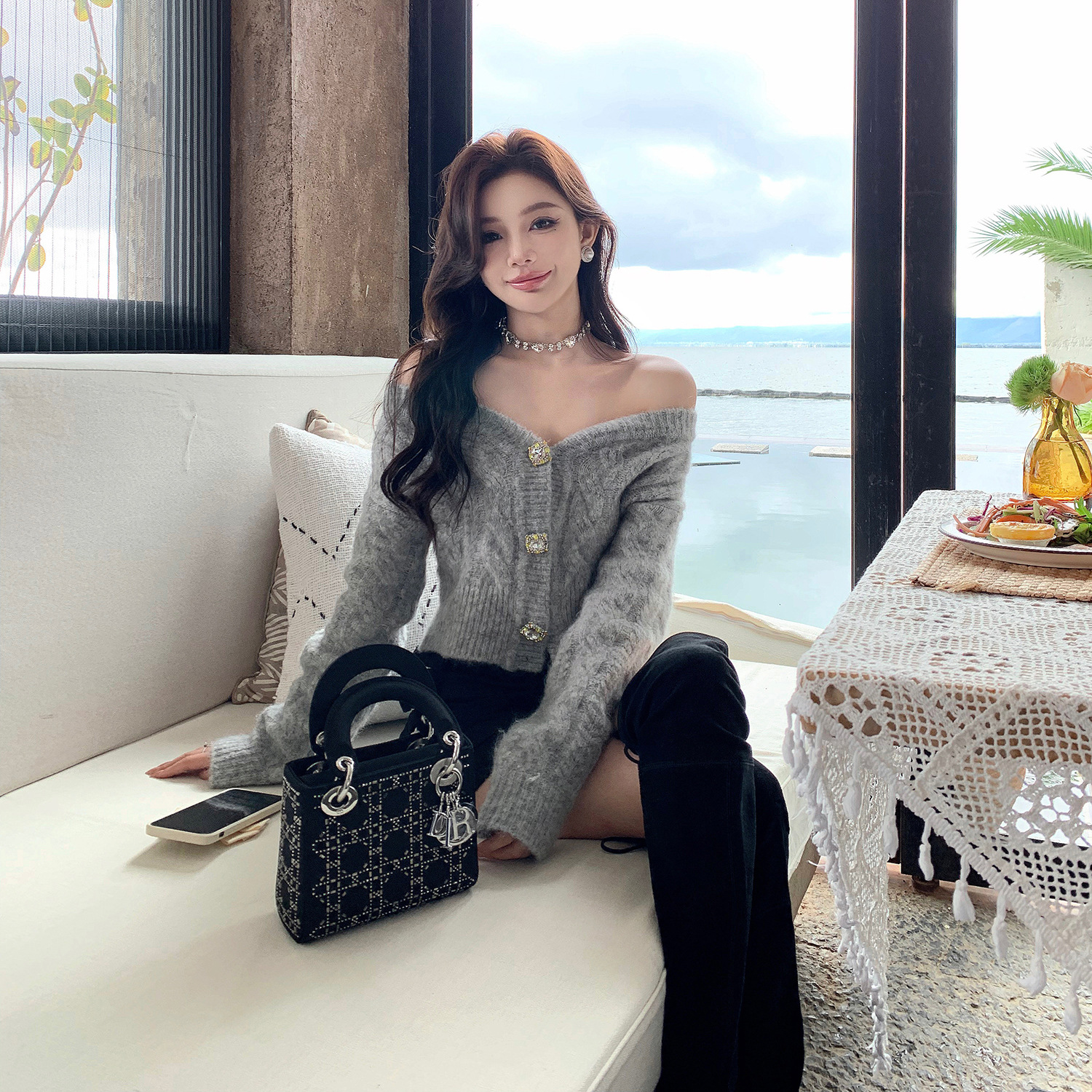 디자인감 있는 가을 겨울 신상품, 부드러운 스타일의 모헤어 원숄더 스웨터 가디건, 부드럽고 촉감 좋은 짧은 루즈핏 상의스토어 가기