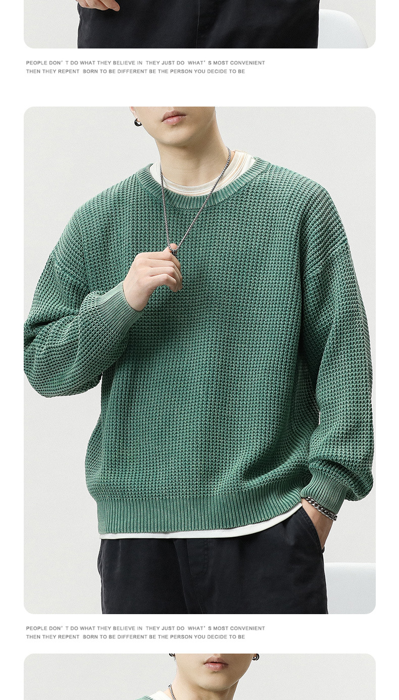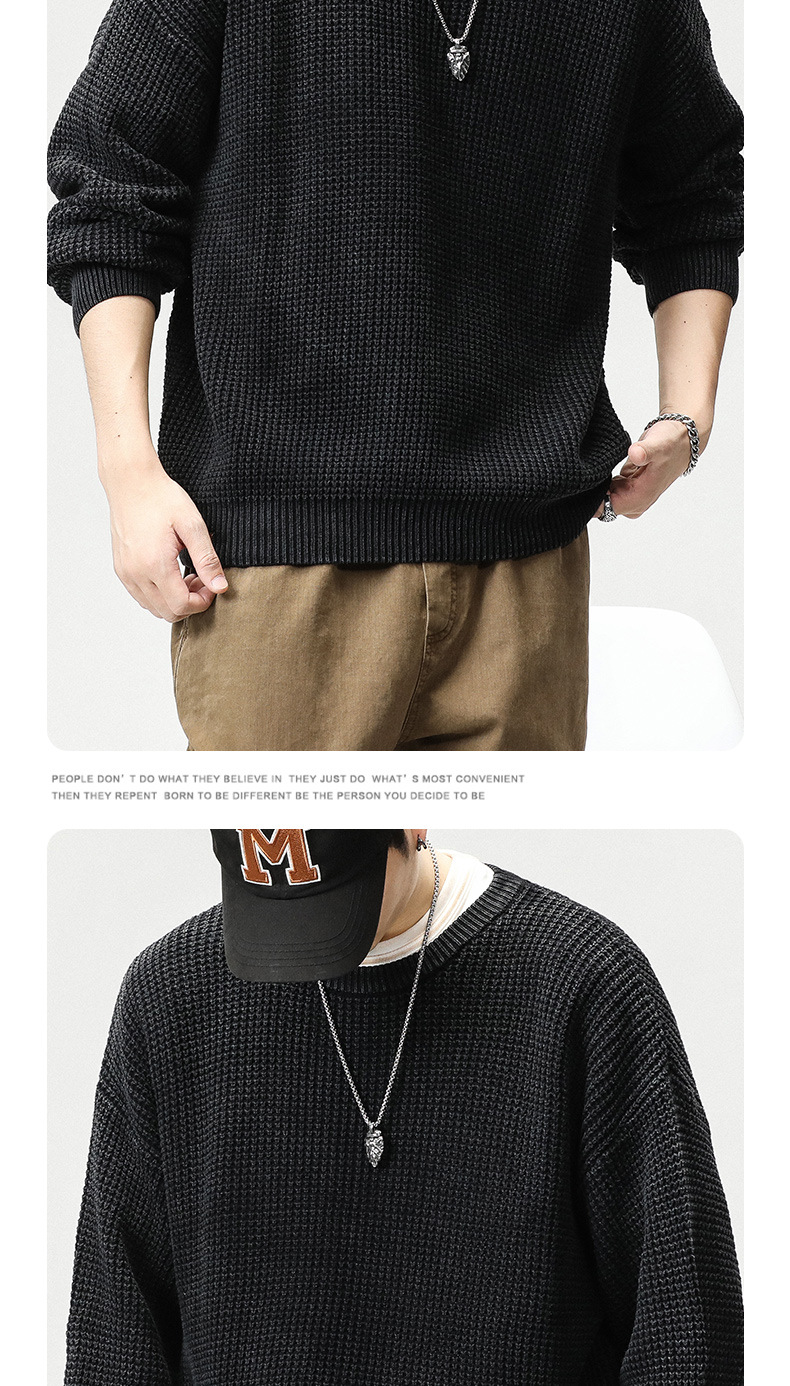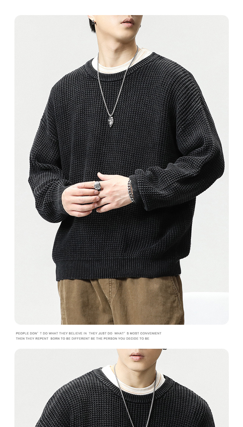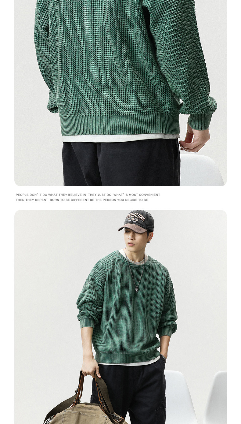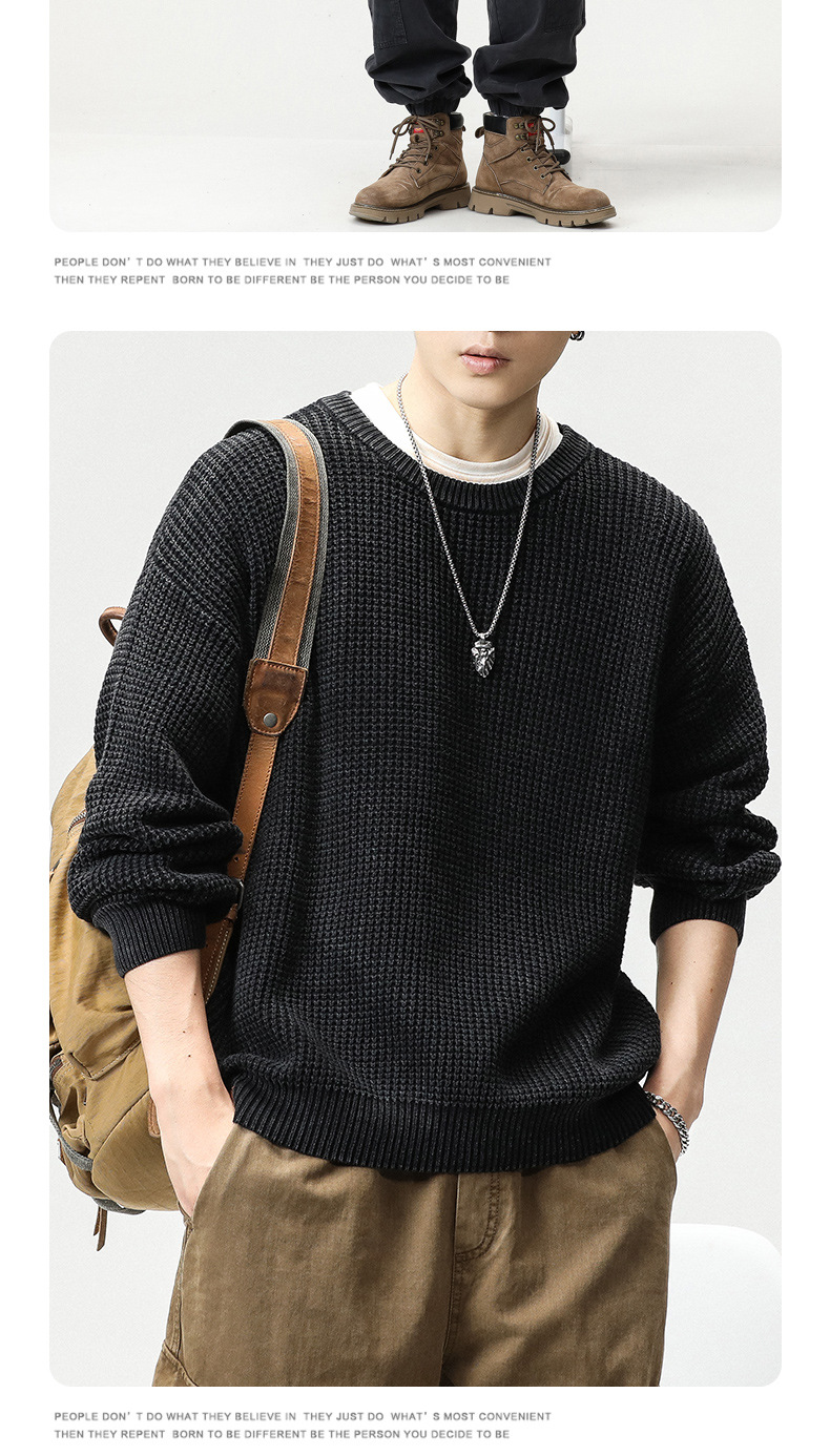 日系复古重磅圆领毛衣男粗针水洗针织衫华夫格男潮牌