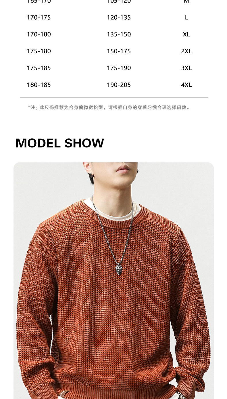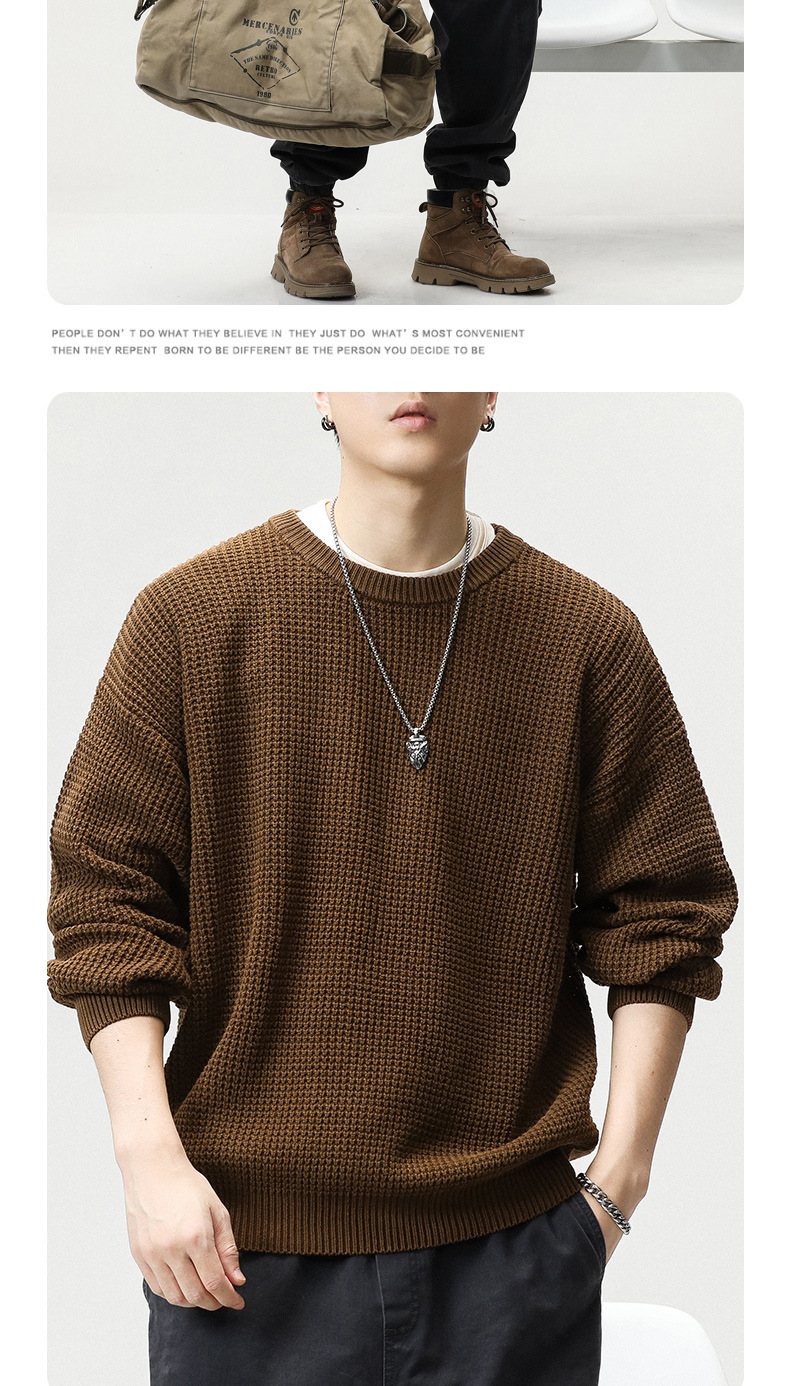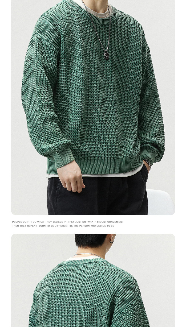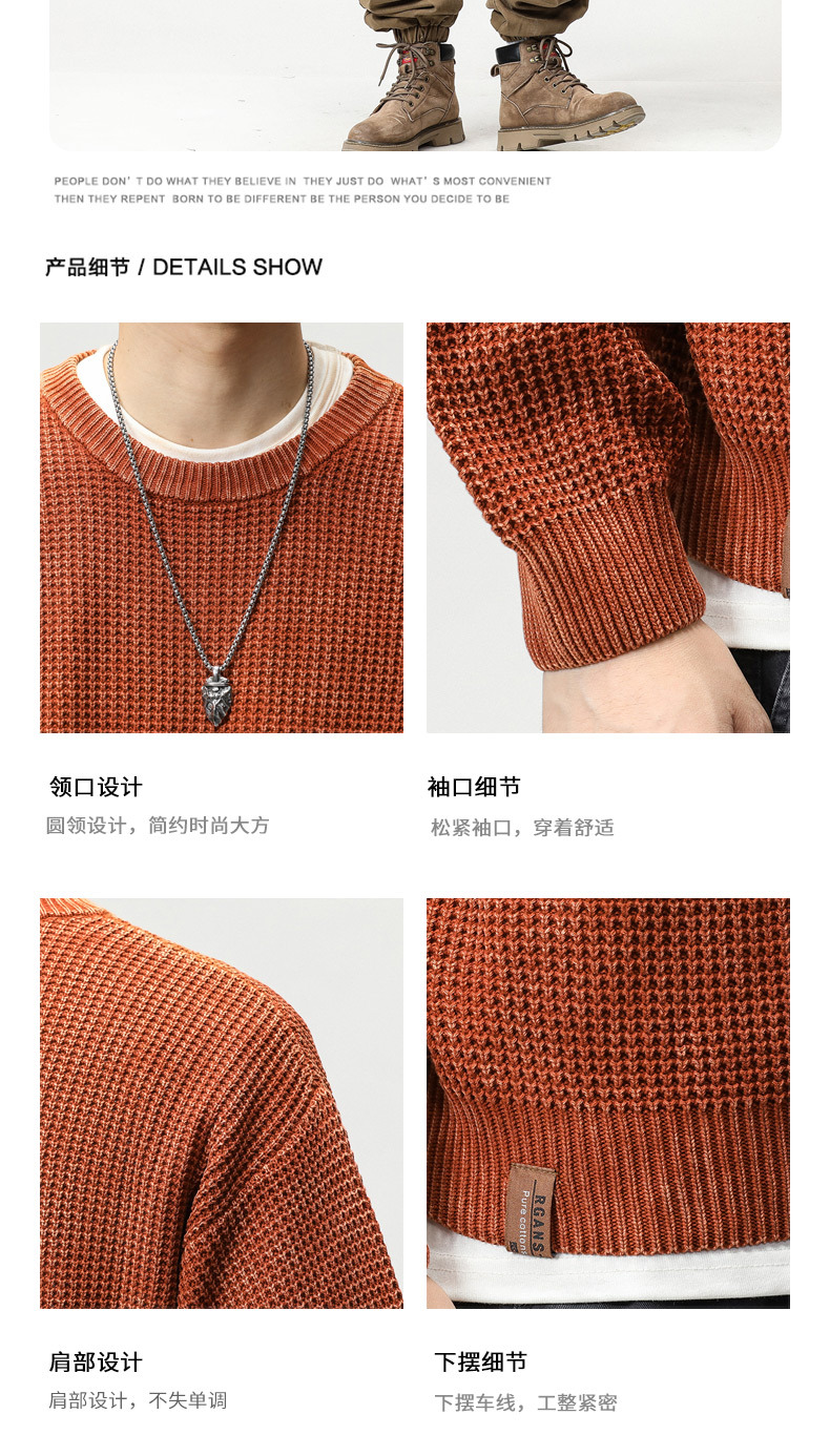 日系复古重磅圆领毛衣男粗针水洗针织衫华夫格男潮牌