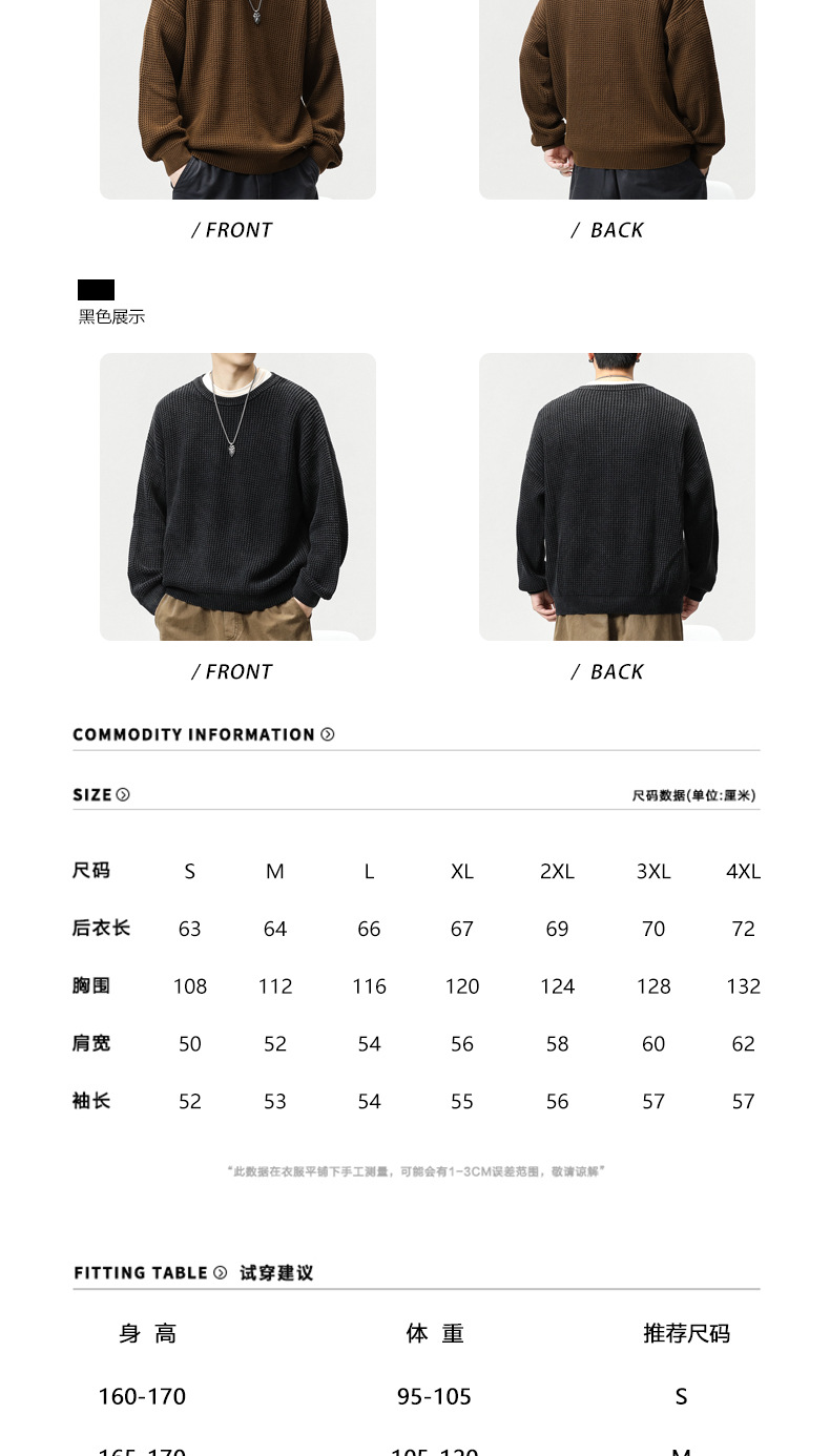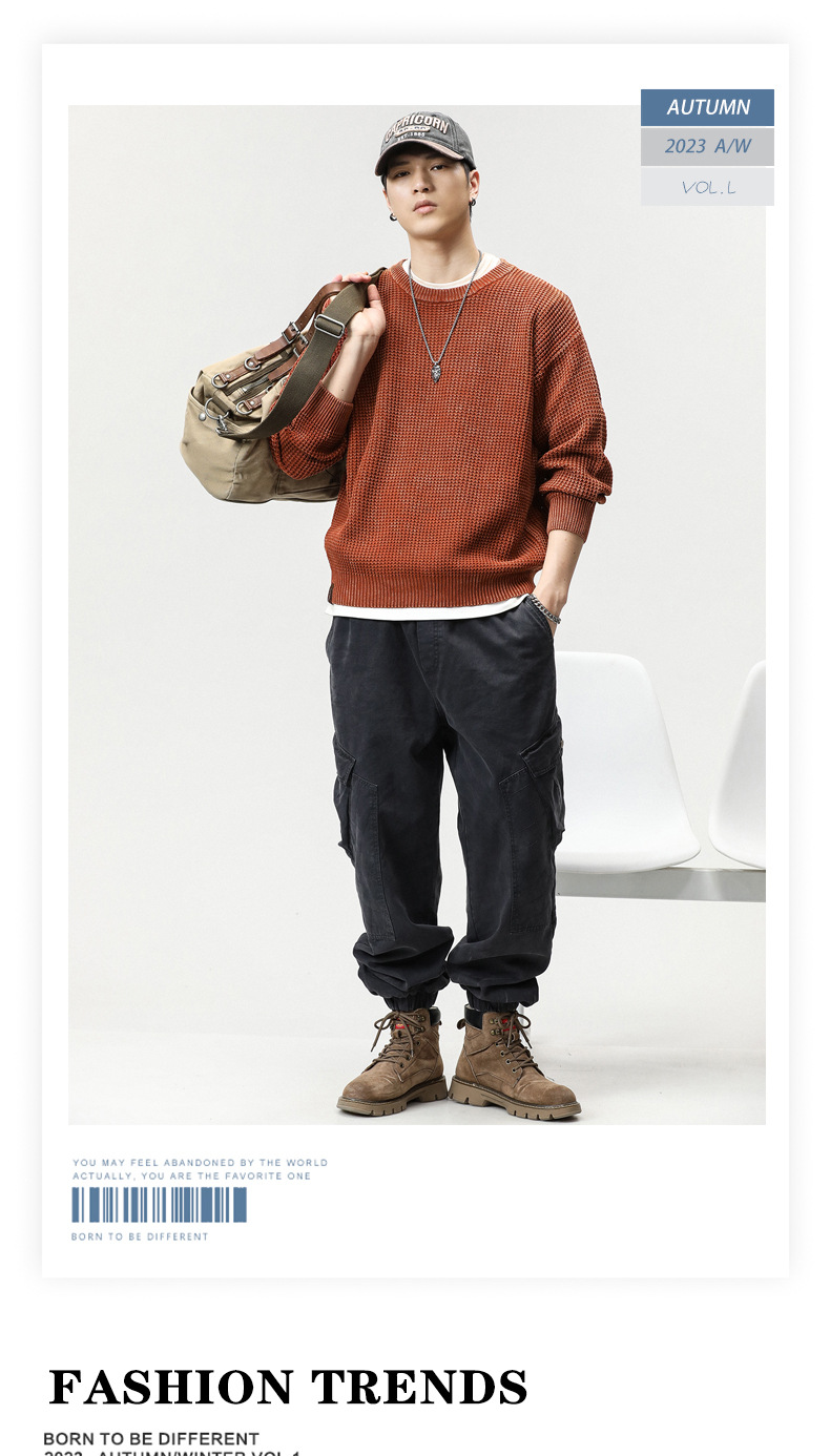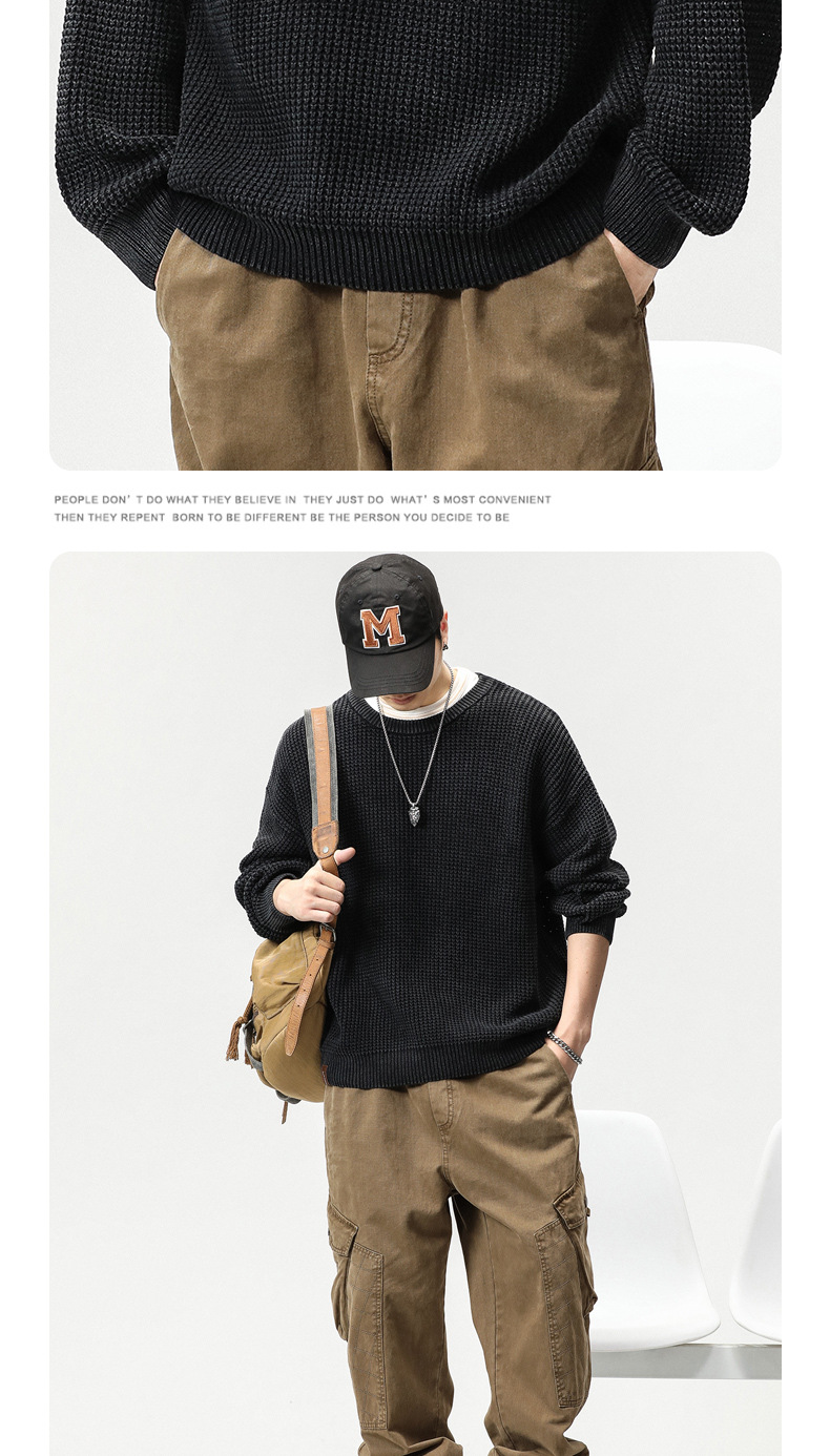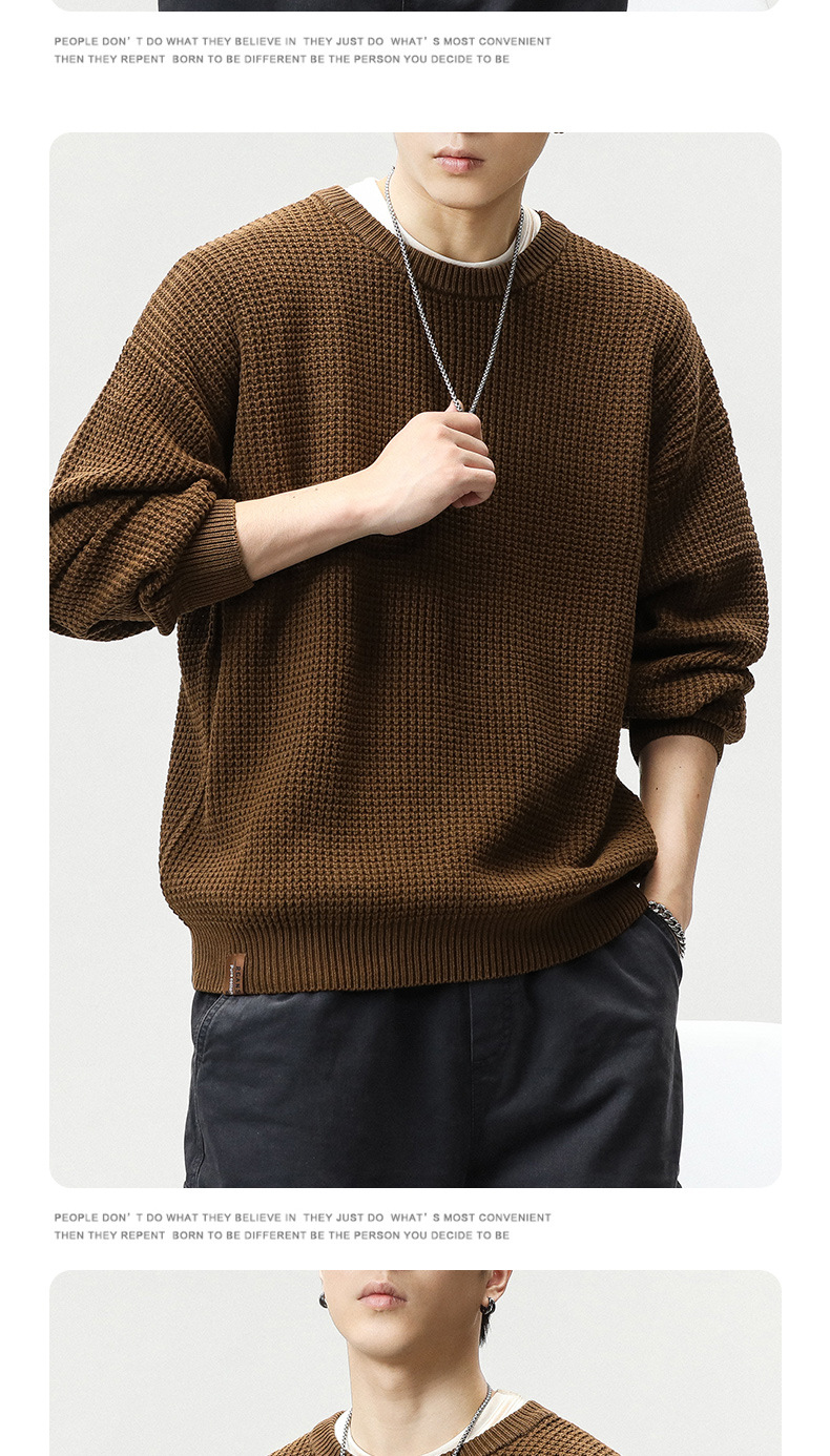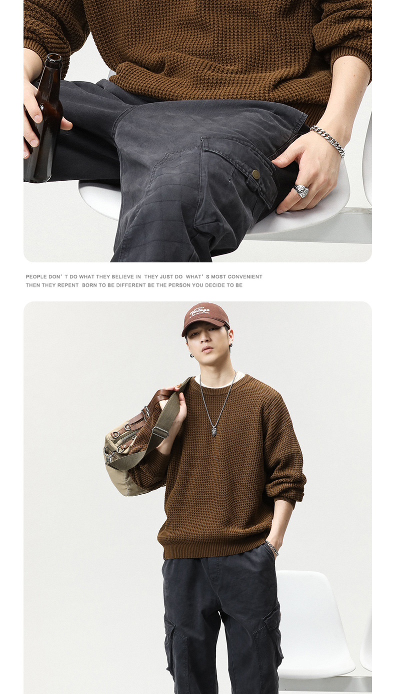 日系复古重磅圆领毛衣男粗针水洗针织衫华夫格男潮牌