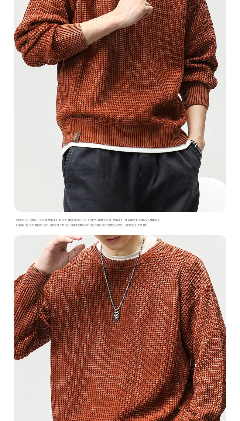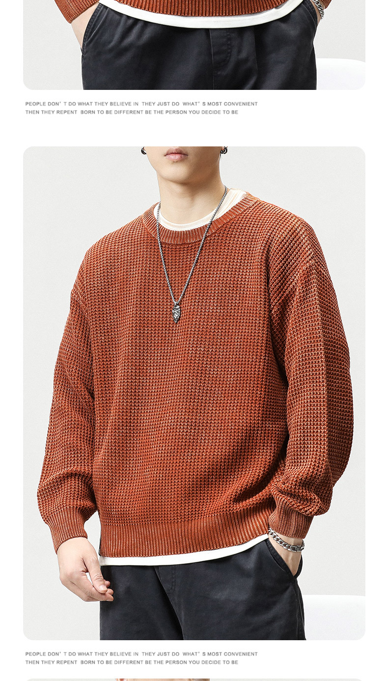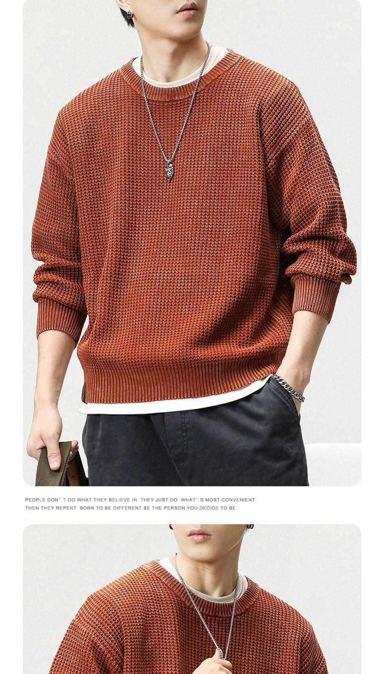 일본식 레트로 헤비 웨이트 크루넥 스웨터 남성용 두꺼운 바늘 세척 니트웨어 와플 남성용 트렌디 브랜드스토어 가기