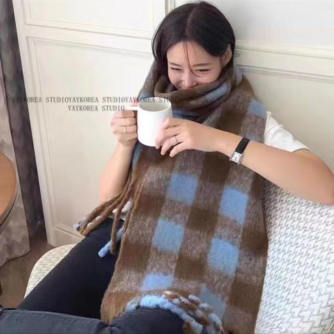 스카프 한국 스타일 분위기 있는 블루 브라운 모헤어 라이트 럭셔리 고급스러운 여성용 겨울 커플 블루 스카프 숄스토어 가기