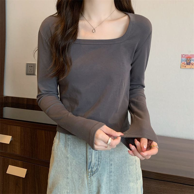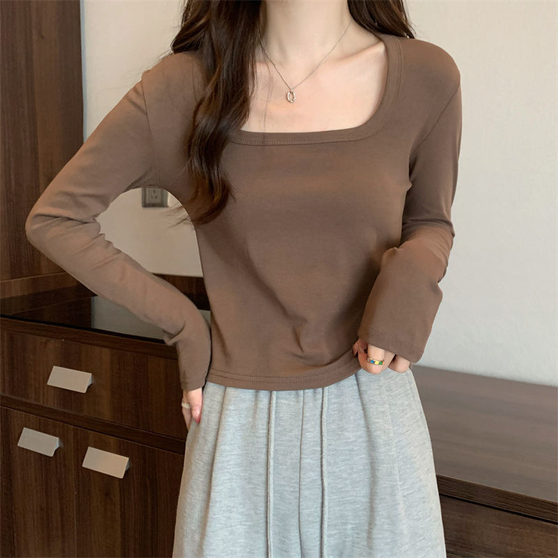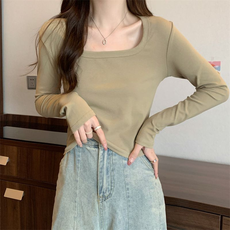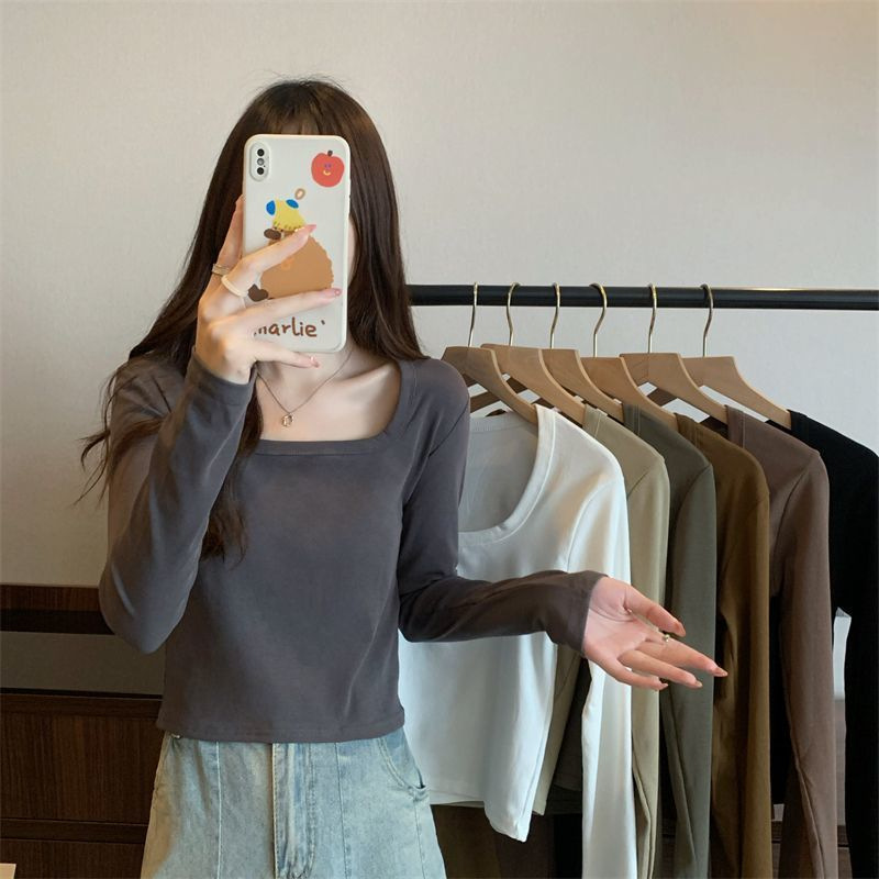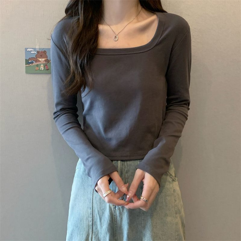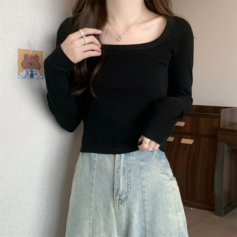 2023 새로운 가을 스퀘어 칼라 탑 여성용 긴팔 슬림핏 올매치 쇼트 티셔츠스토어 가기