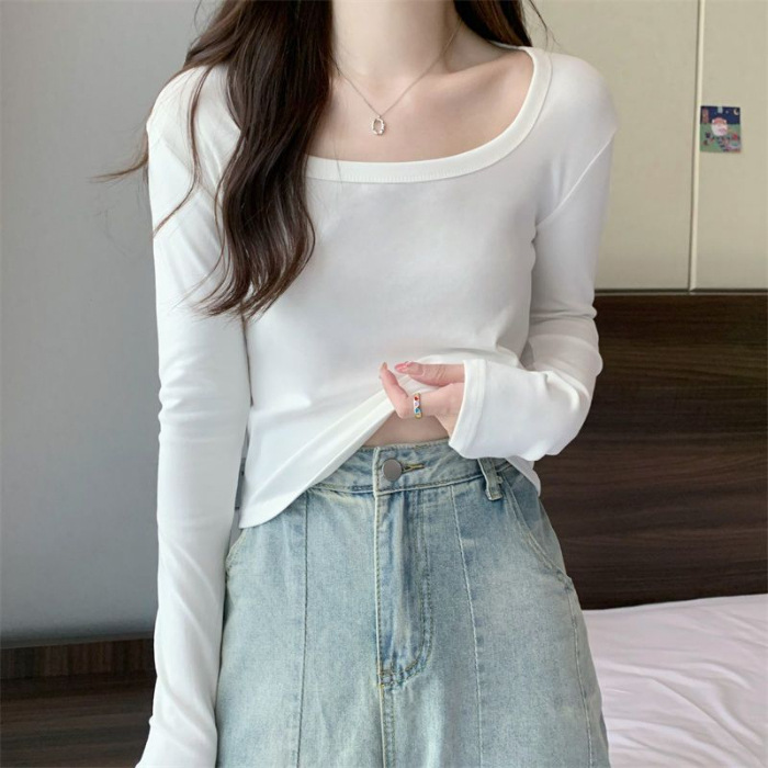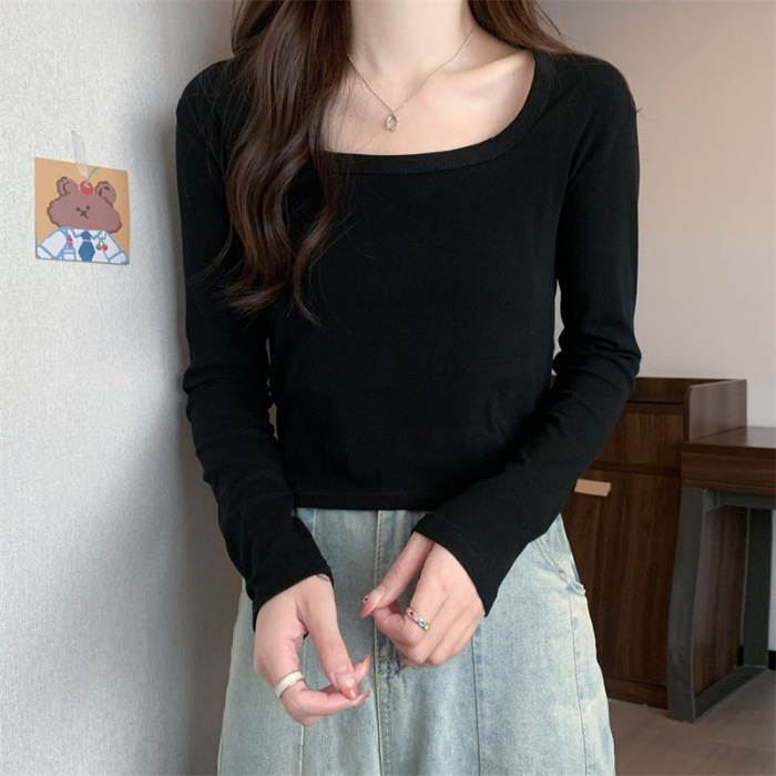 2023 새로운 가을 스퀘어 칼라 탑 여성용 긴팔 슬림핏 올매치 쇼트 티셔츠