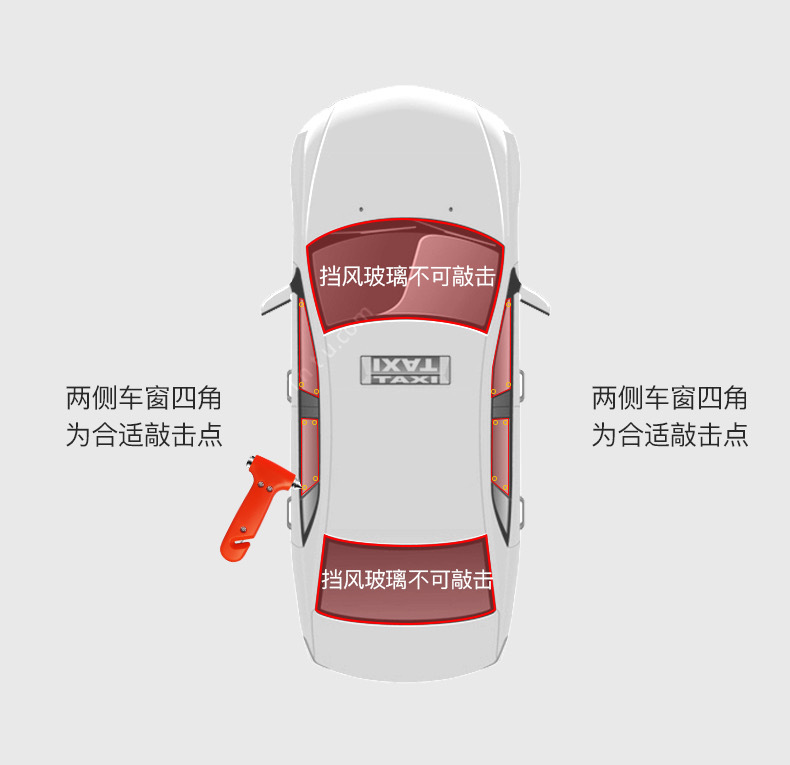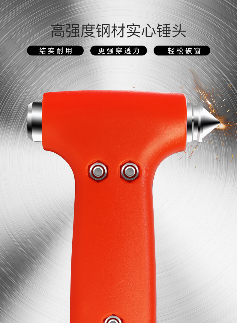 当汽车发生意外,(比如:汽车侧翻、坠河等),需要离车逃生时,可以用救生锤尾部的割刀割断保险带,再用尖头救生锤打破车窗玻璃,然后跳车逃生。它是乘客生命最后一道保护屏障!