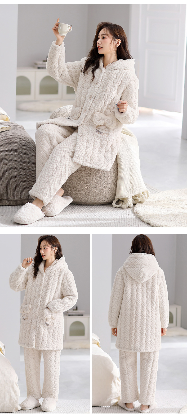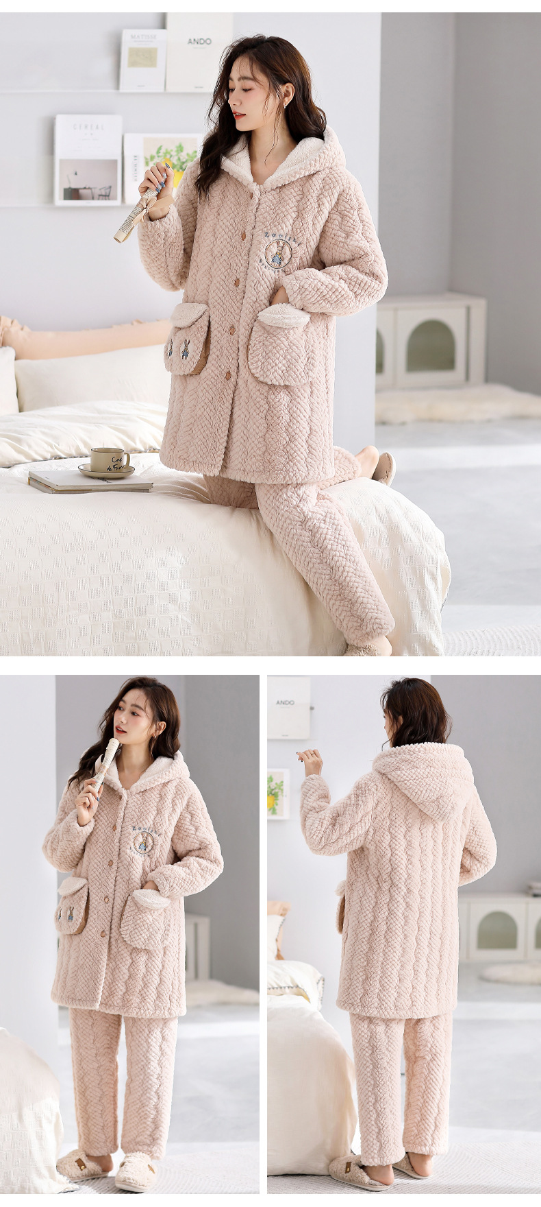 2024년 신상 여성용 겨울 잠옷, 3중 두꺼운 플리스 안감, 면혼방 코랄벨벳, 중간 길이, 따뜻한 홈웨어 세트