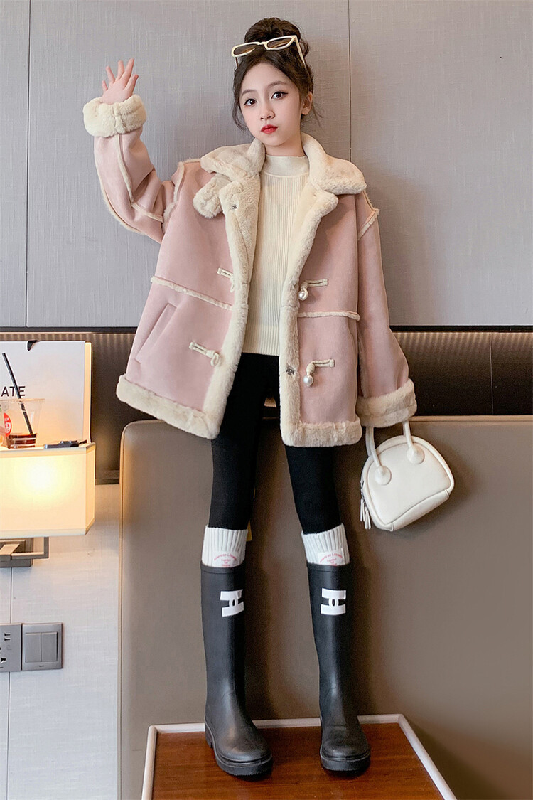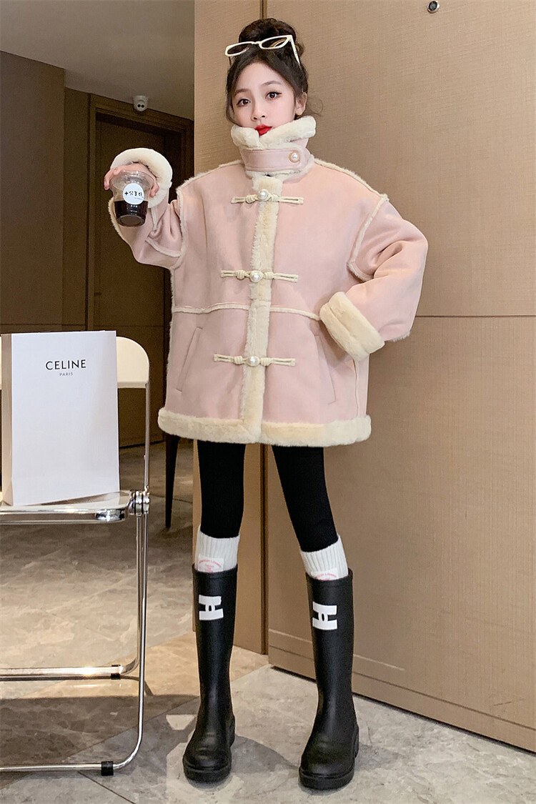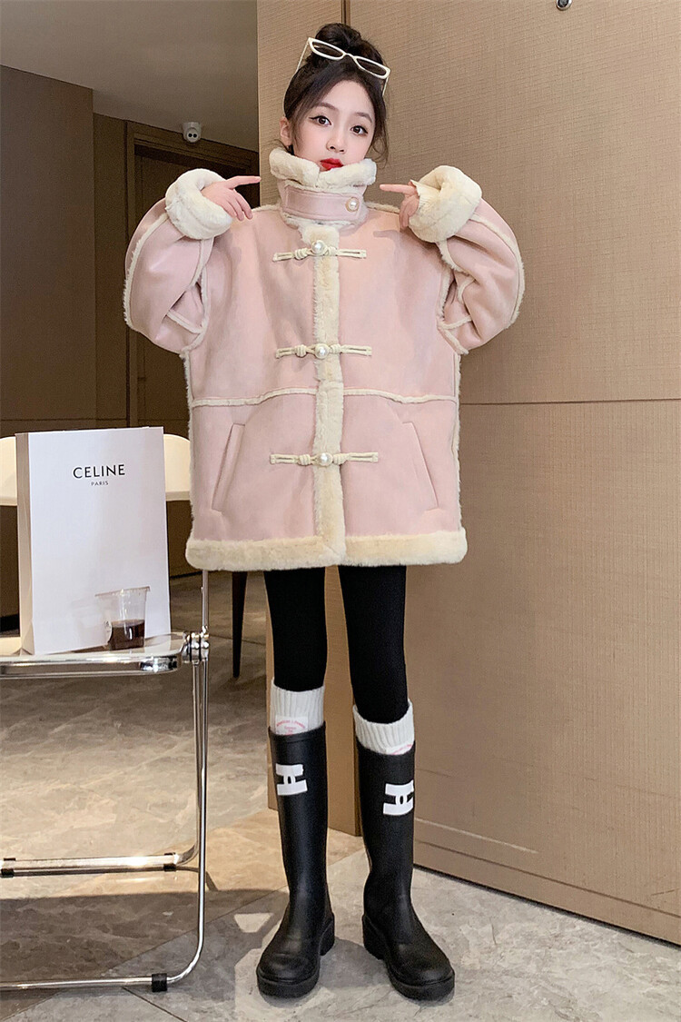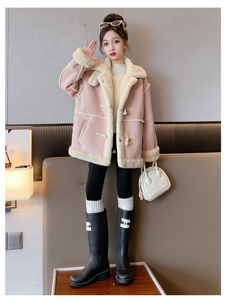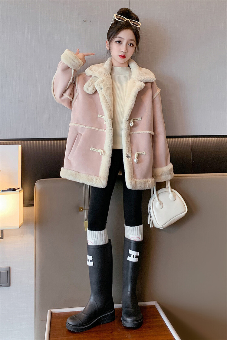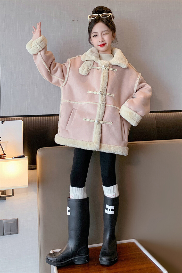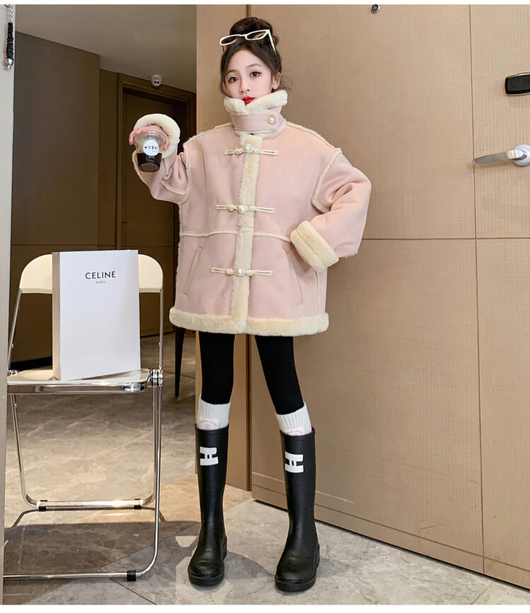 여아용 모피 일체형 한국 스타일 코트 2024 신상 중대형 아동 가을 겨울 패션 두꺼운 플리스 코트 해외 판매스토어 가기