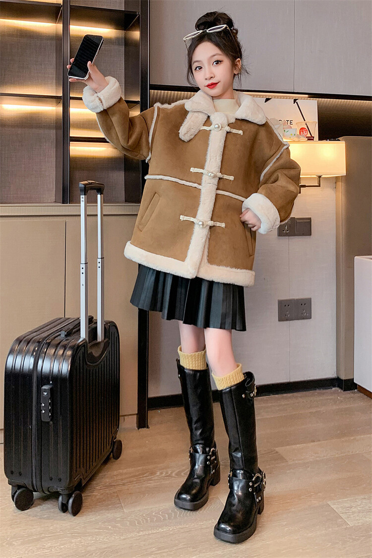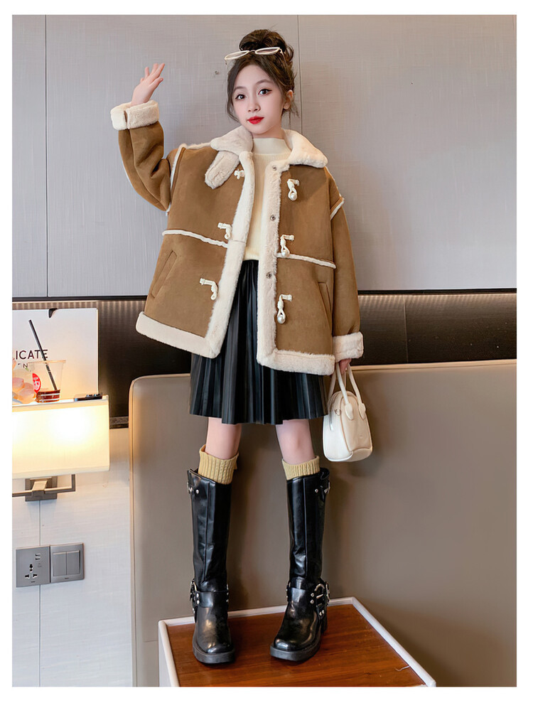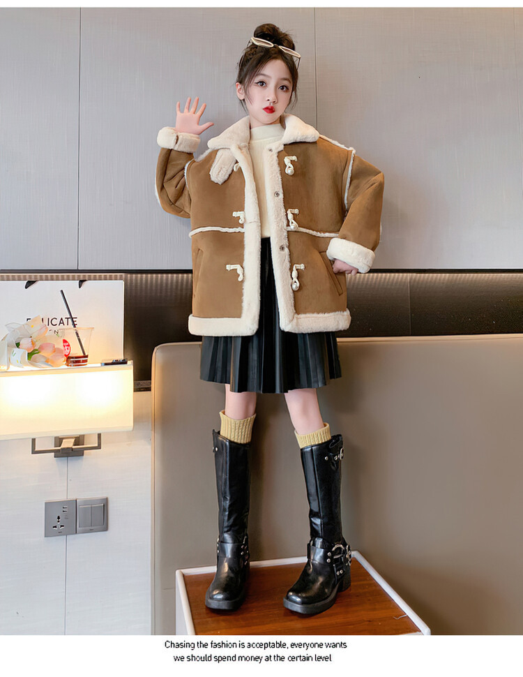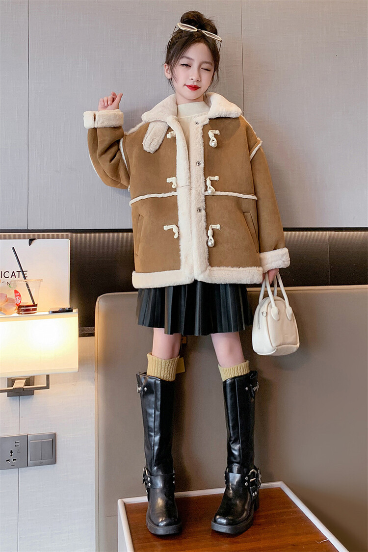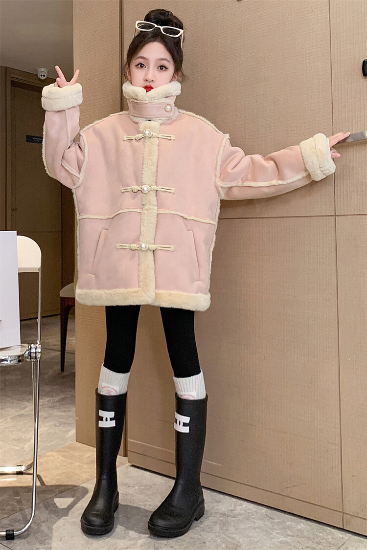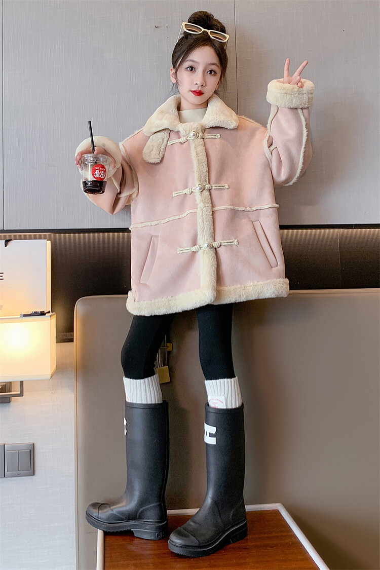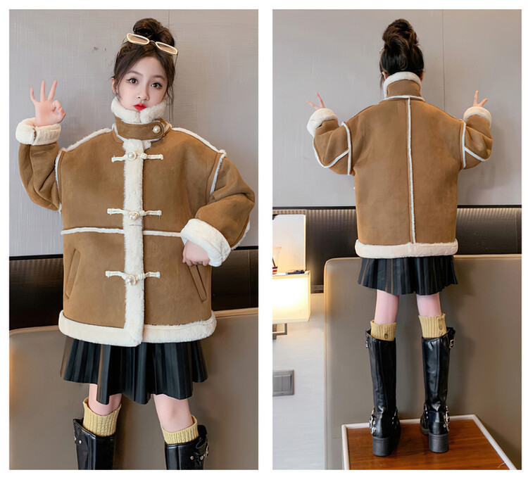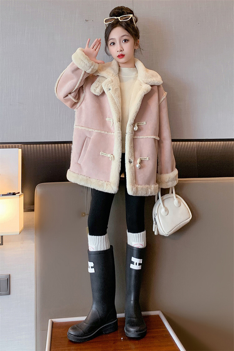 여아용 모피 일체형 한국 스타일 코트 2024 신상 중대형 아동 가을 겨울 패션 두꺼운 플리스 코트 해외 판매스토어 가기