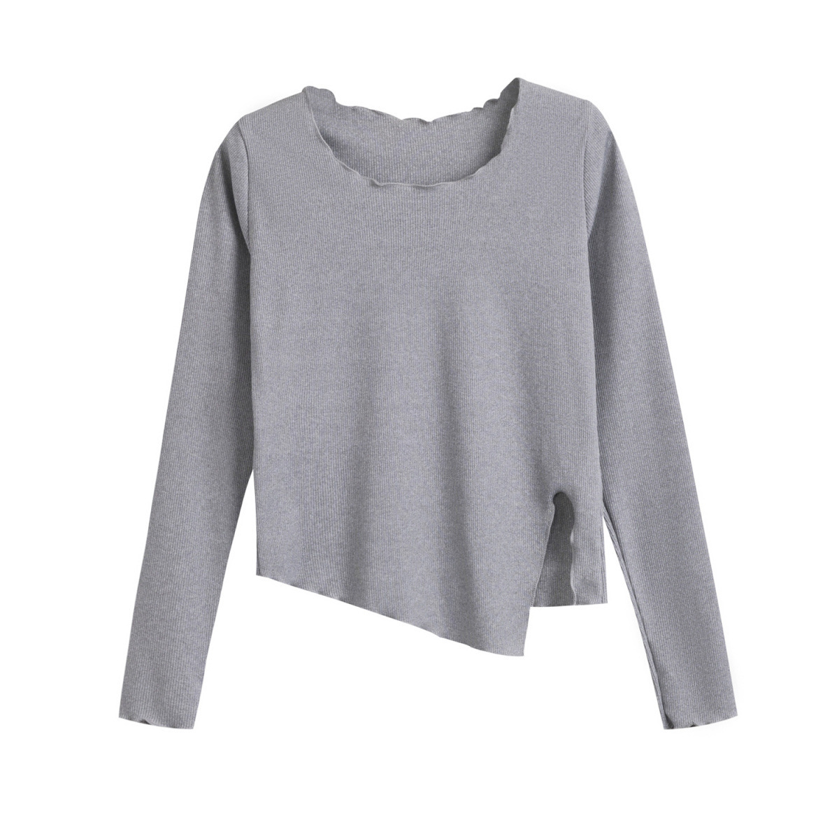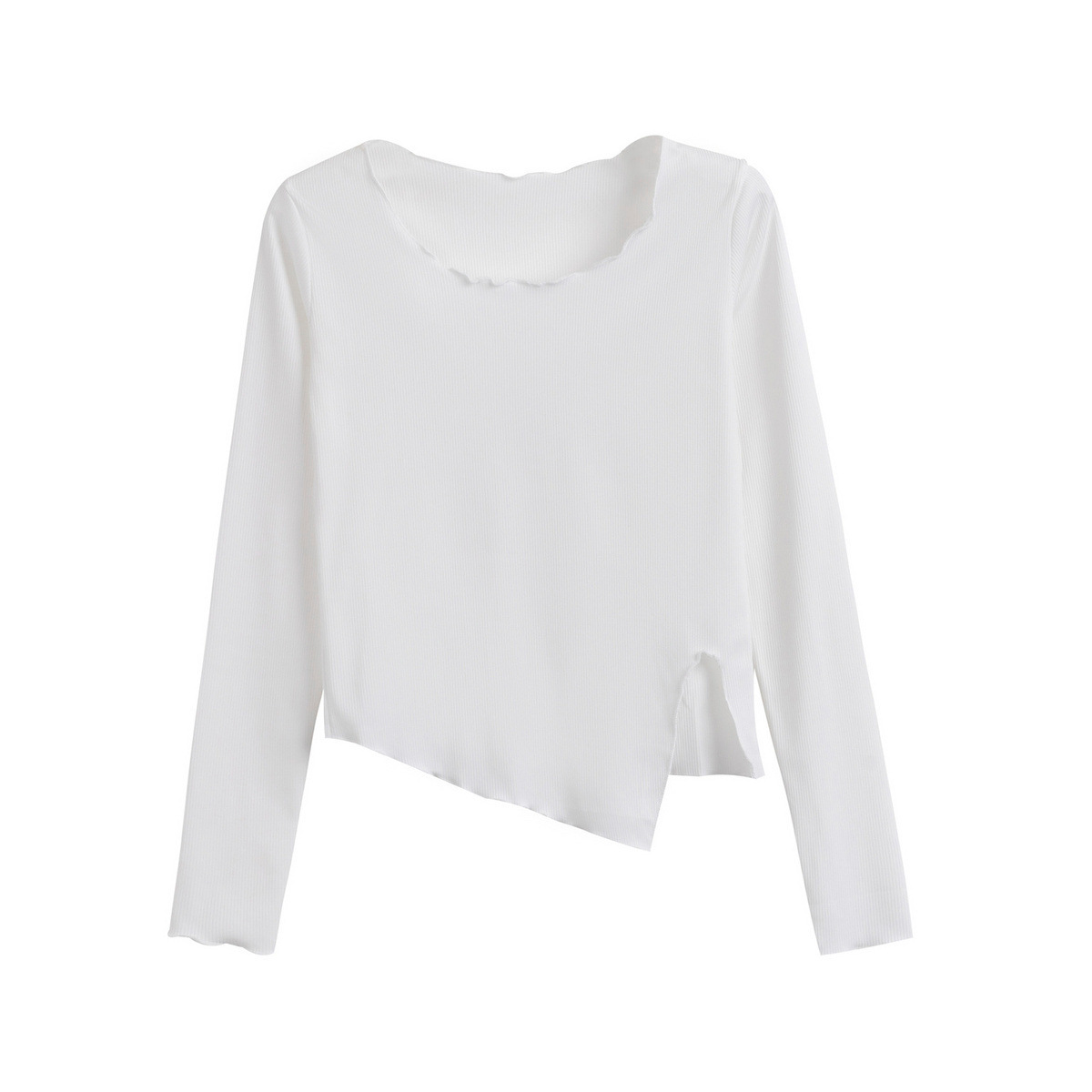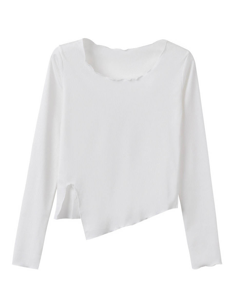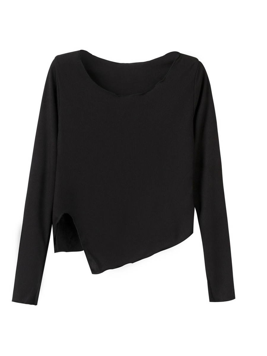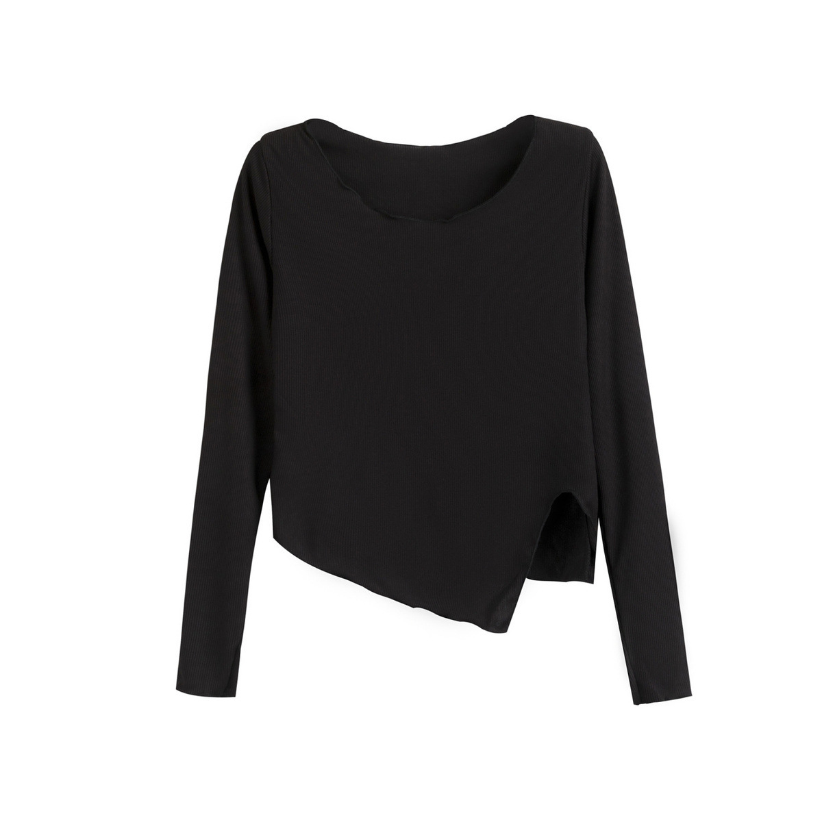 2023 새로운 가을 불규칙한 스플릿 슬림 짧은 밑단 긴 소매 티셔츠 여성