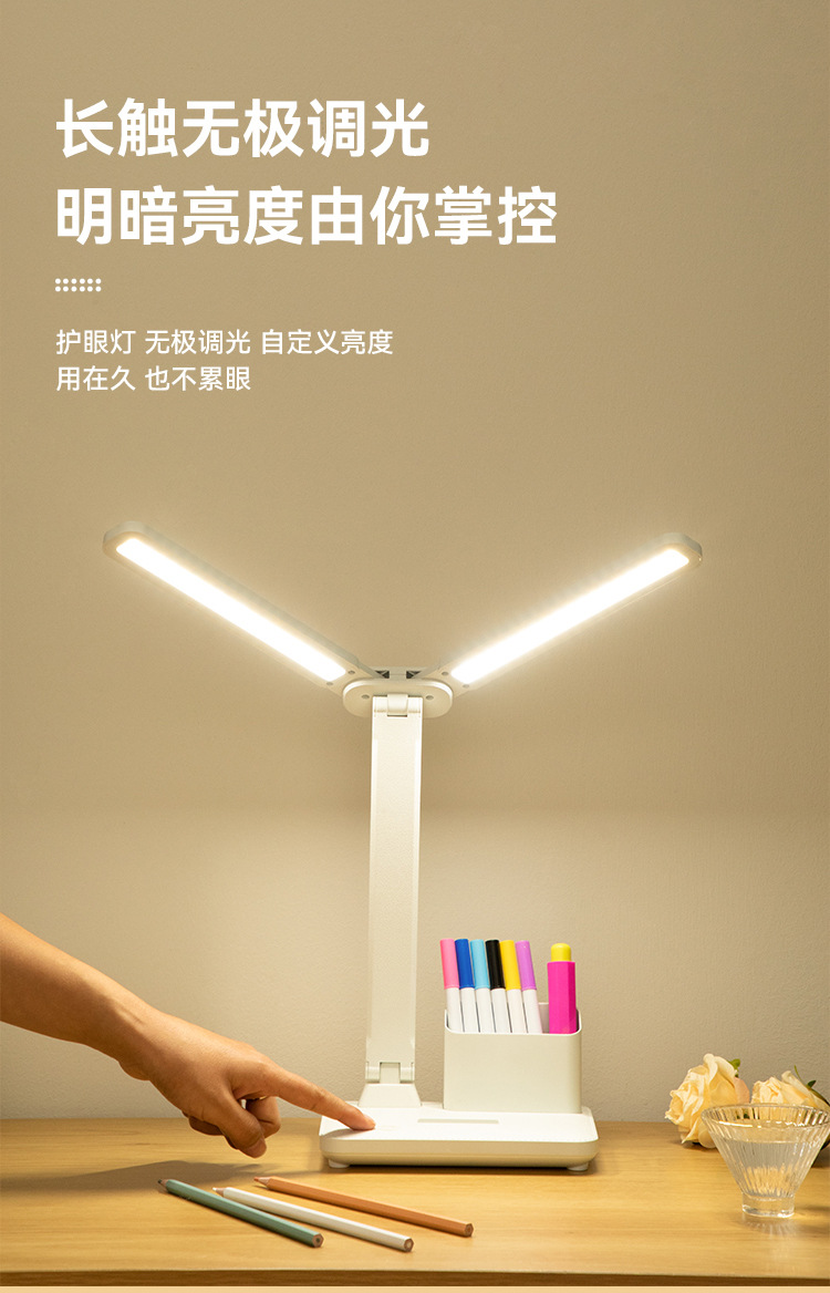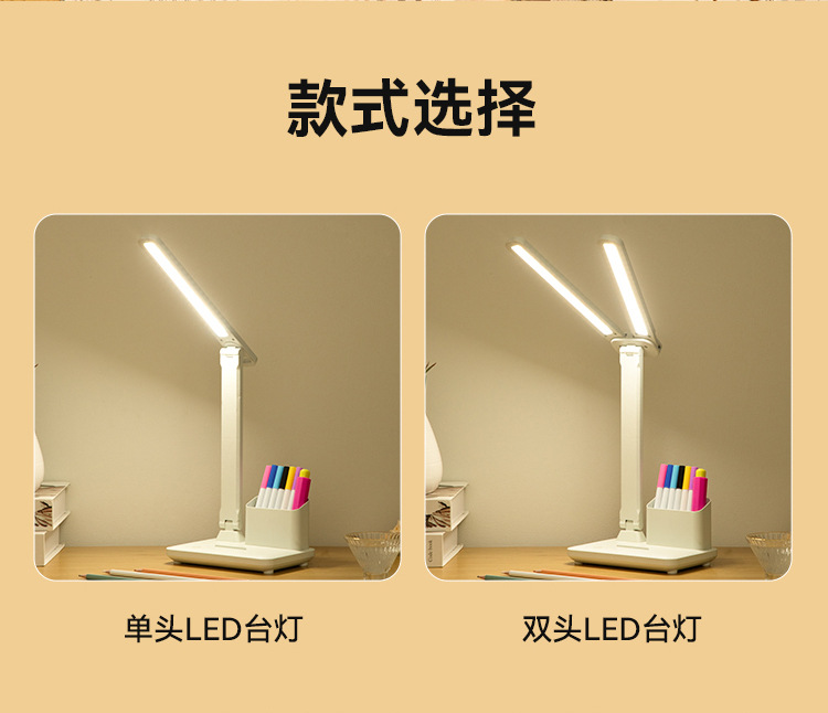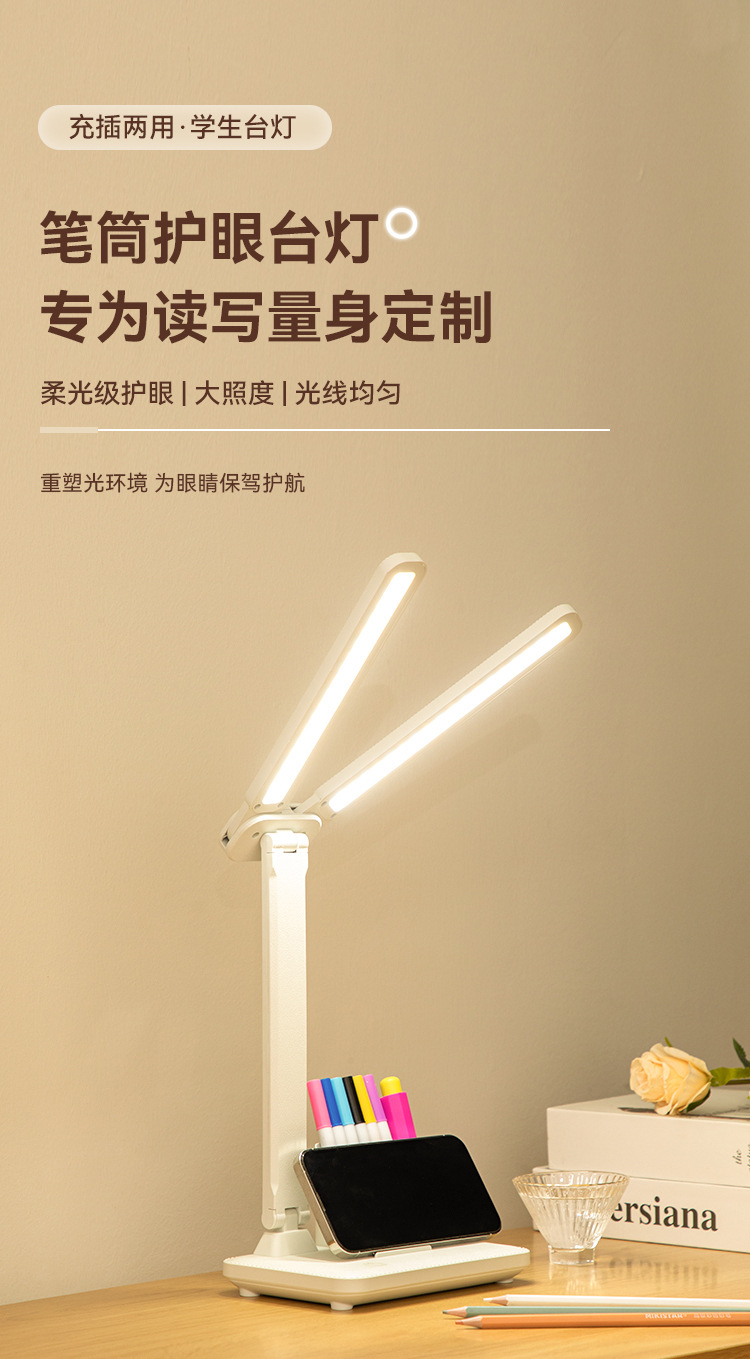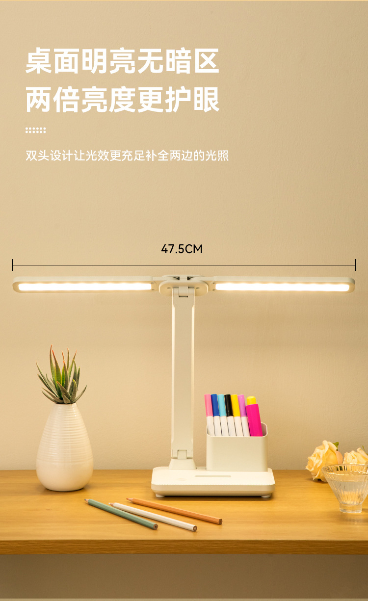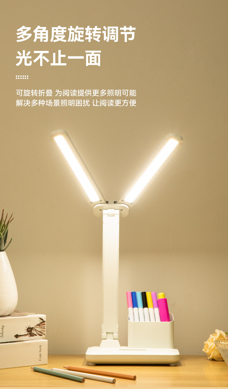 새로운 LED 더블 헤드 USB 충전식 접이식 책상 램프 휴대 전화 홀더 펜 홀더 탁상용 독서 램프 책상 램프 공장