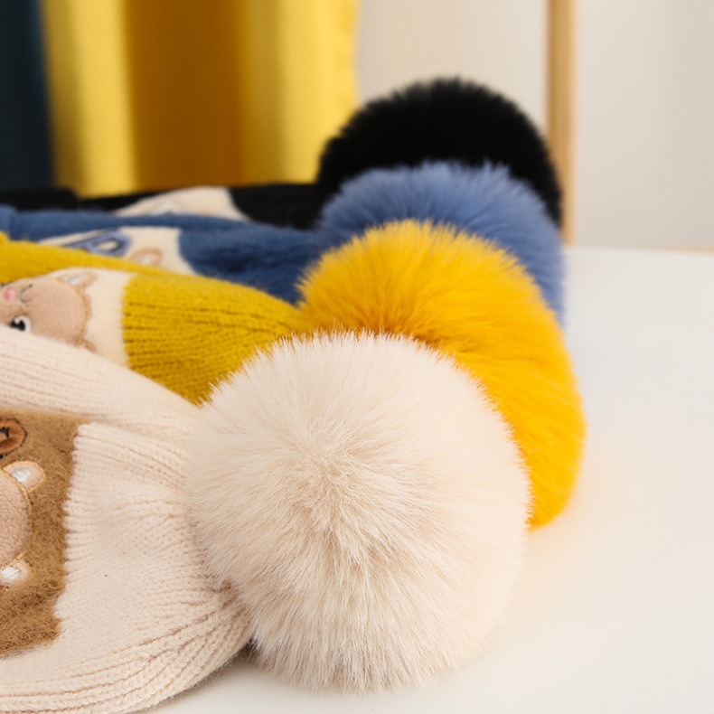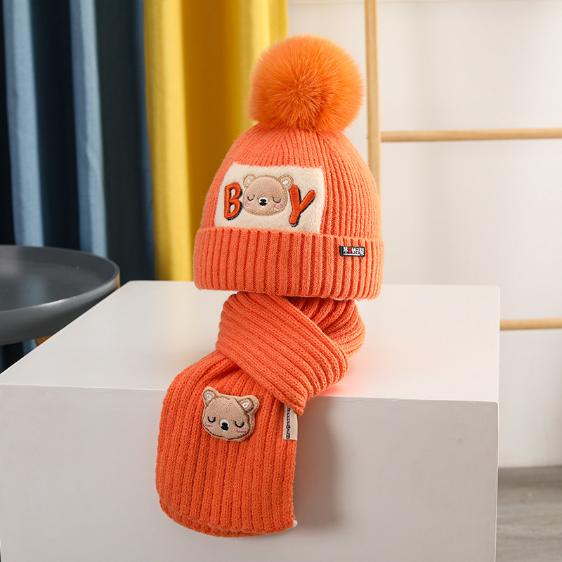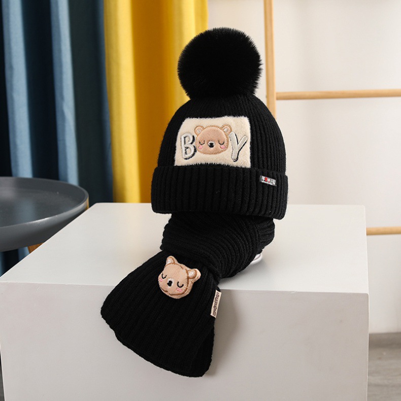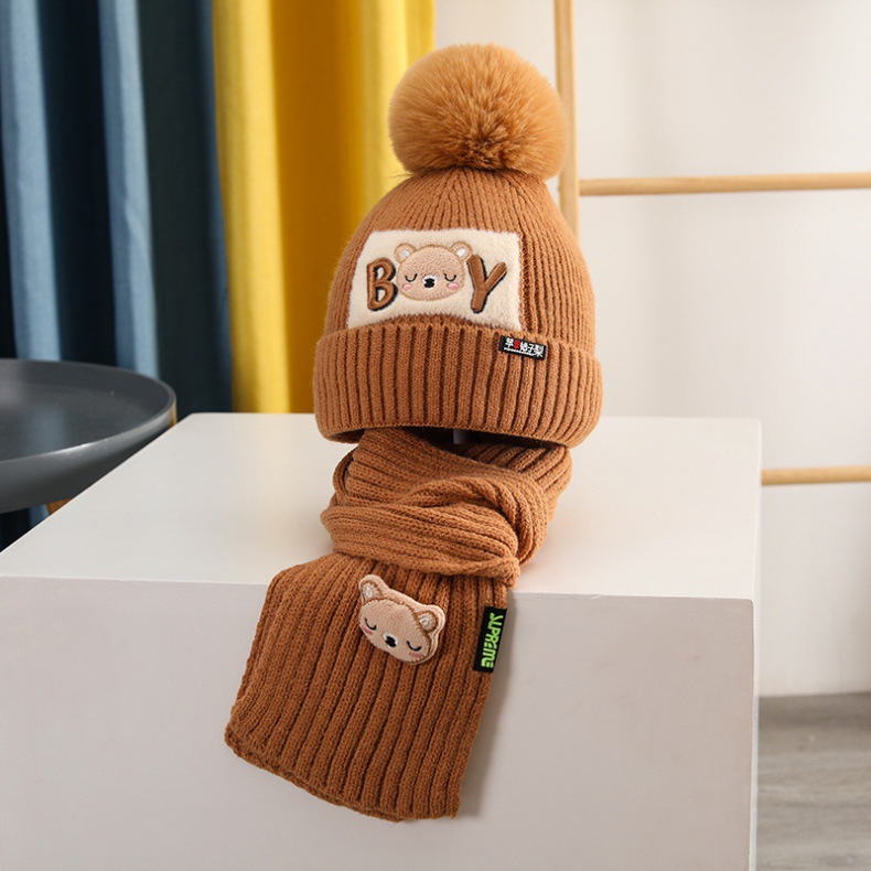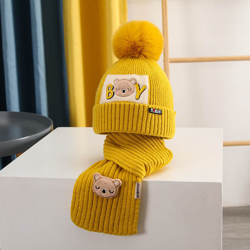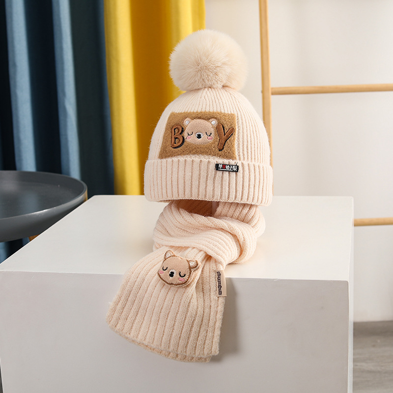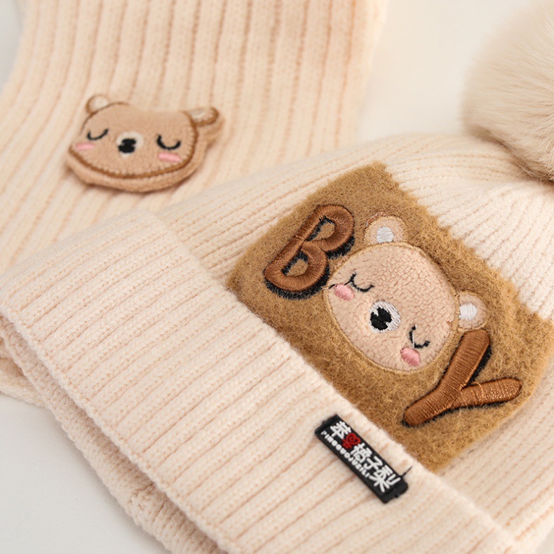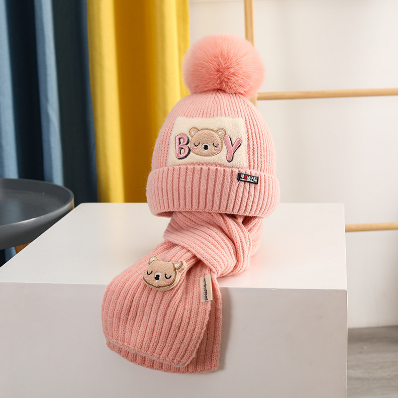 가을과 겨울 어린이 모자 소년 곰 울 모자 소녀 니트 면 따뜻한 중간 및 큰 어린이 모자 스카프 세트