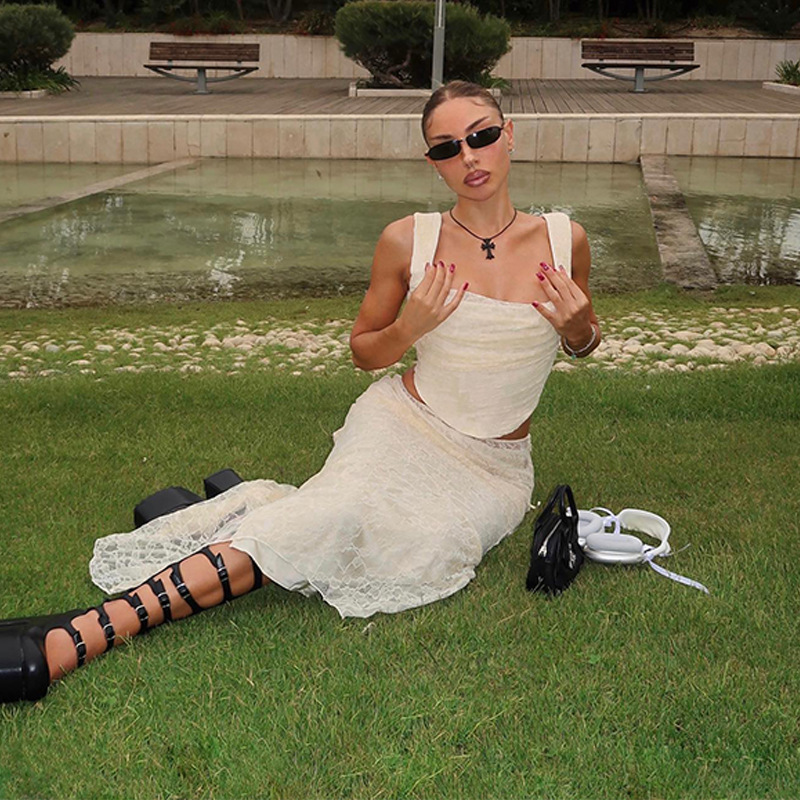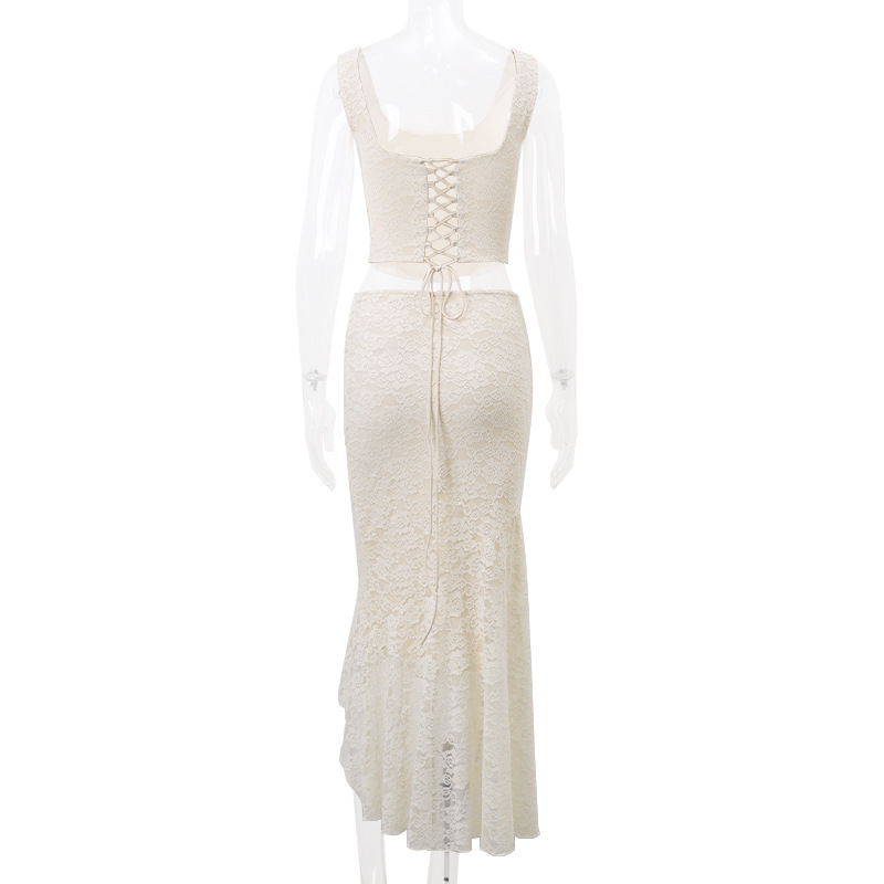 2023秋新品气质抹胸绑带蕾丝上衣/高腰两穿蕾丝鱼尾半裙批发dress