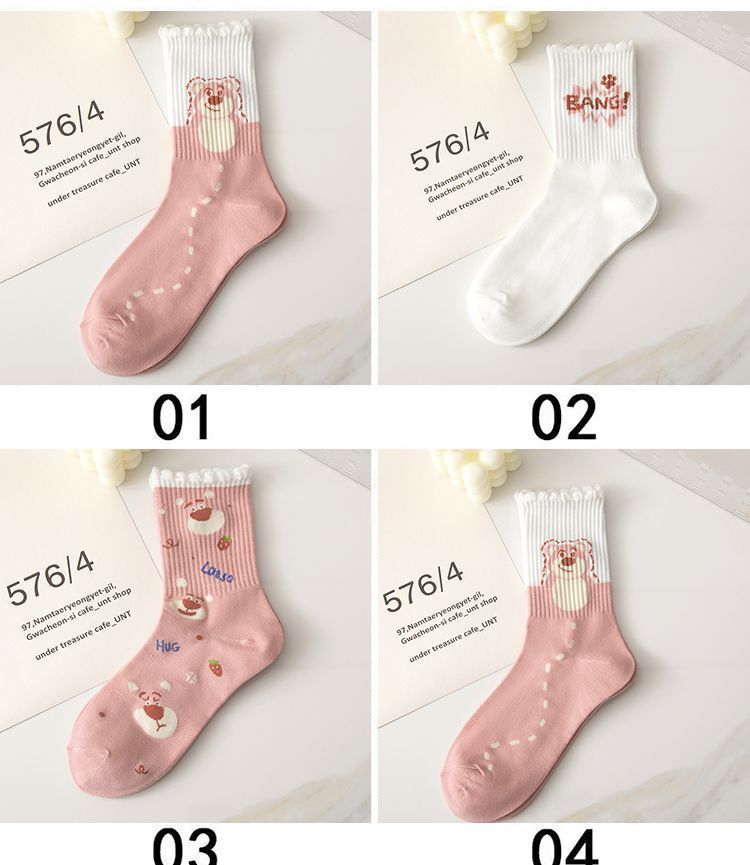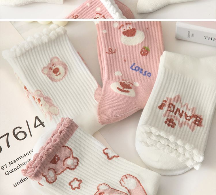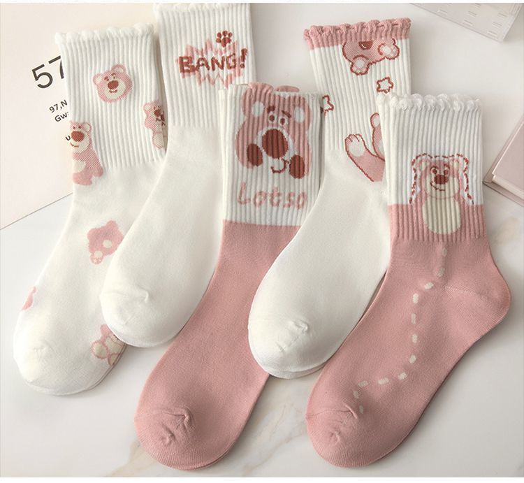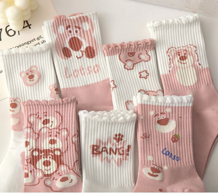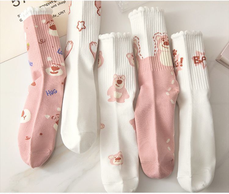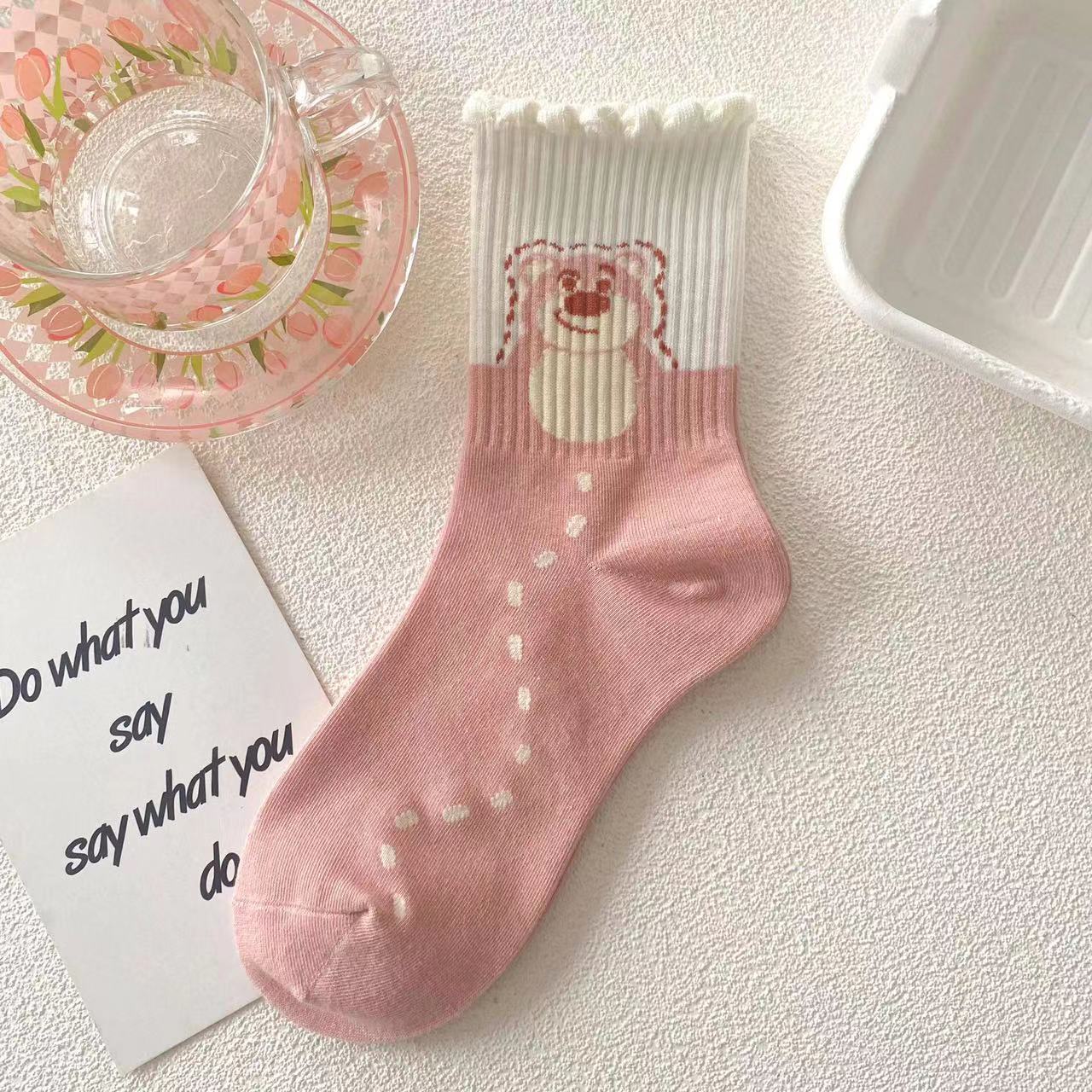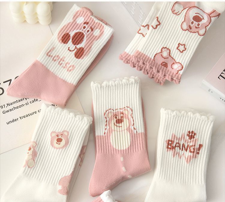 핑크색 양말 여성용 중간 길이 인스타 트렌드 다용도 가을 겨울 한국 귀여운 곰돌이 달콤한 학생 스포츠 양말 내구성스토어 가기