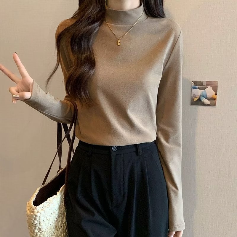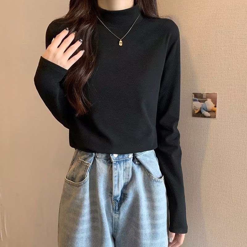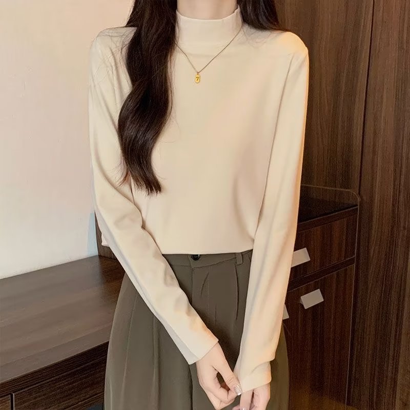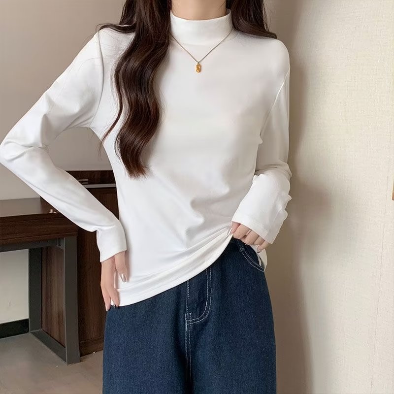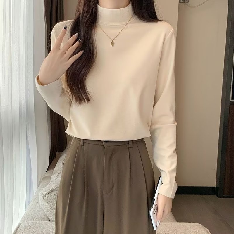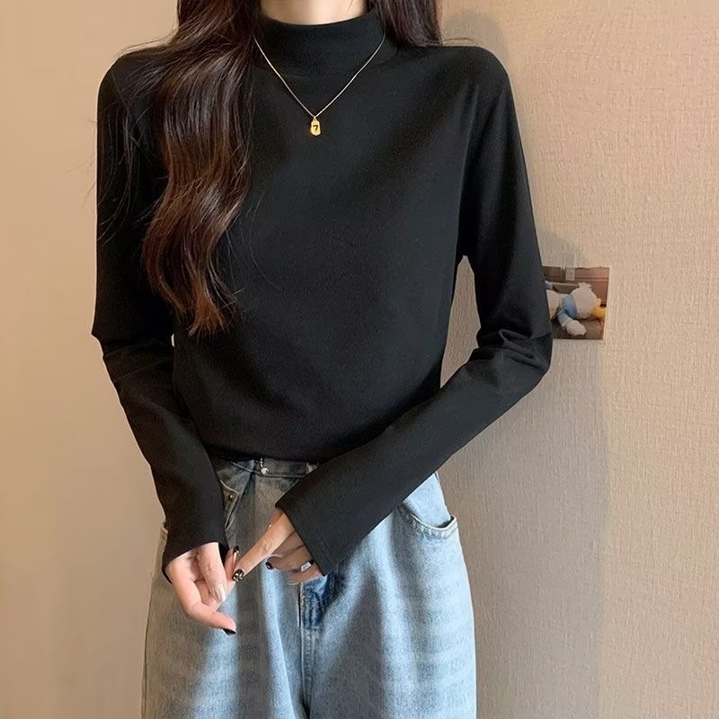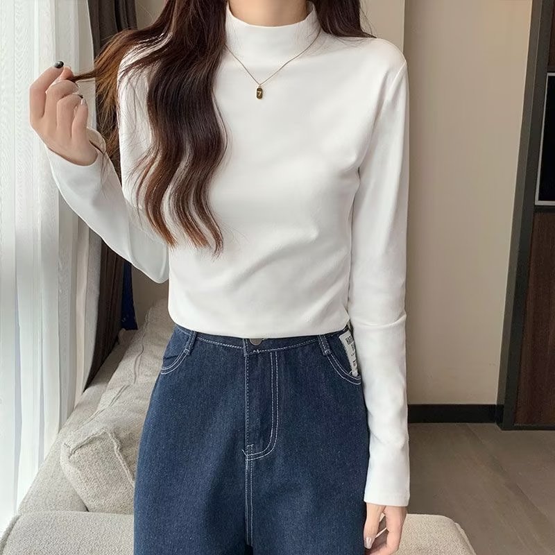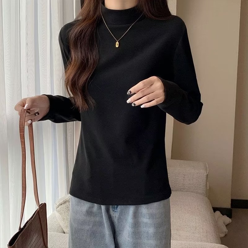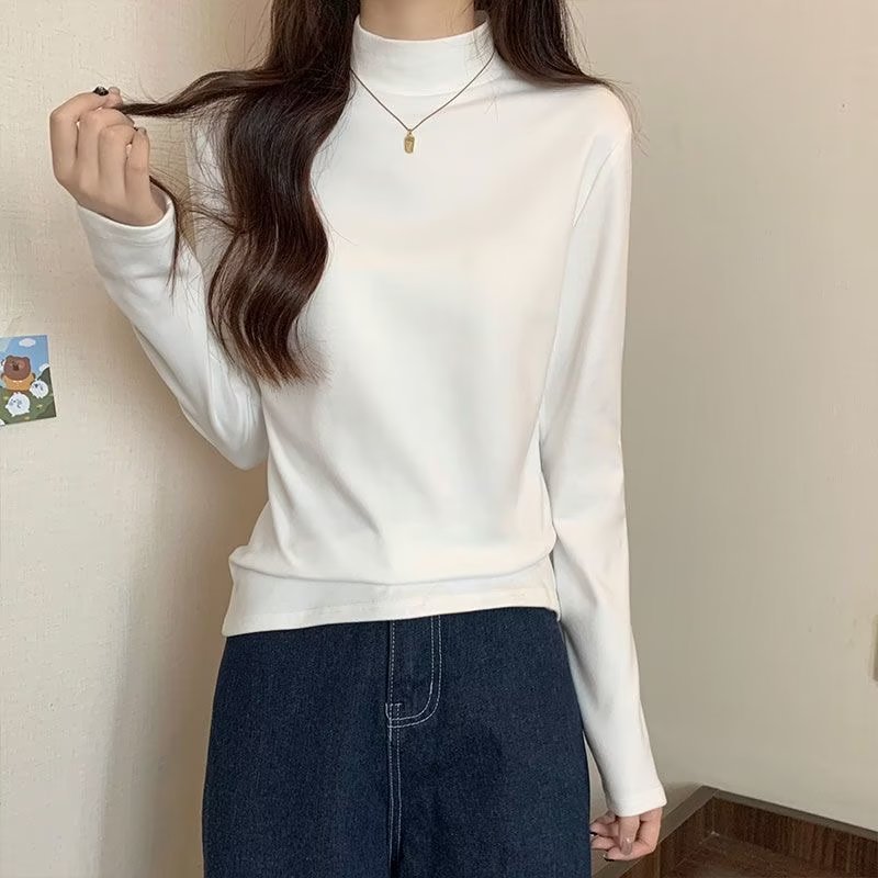 한국식 새로운 슬림핏 슬리밍 심플 긴팔 웜 탑 봄과 가을 올매치 하프 하이 칼라 베이스 내부 긴팔 탑