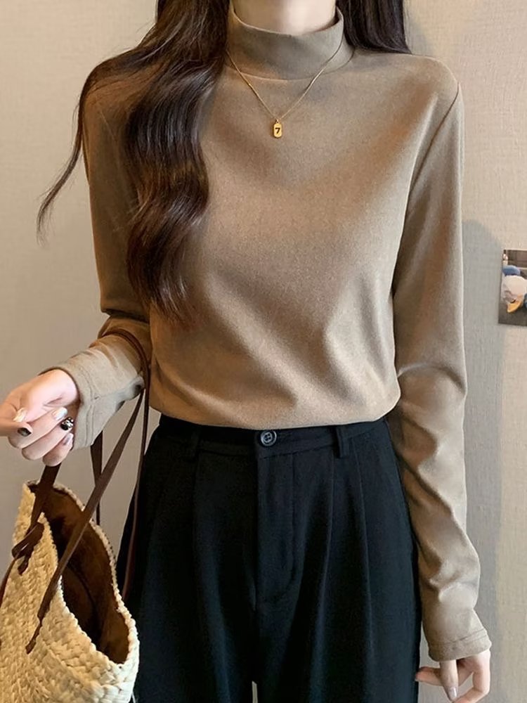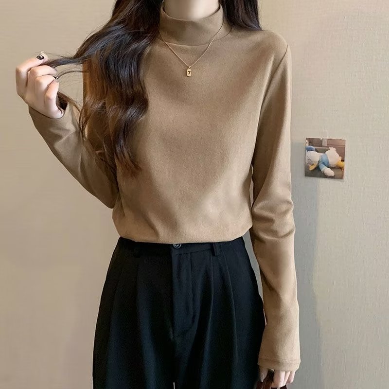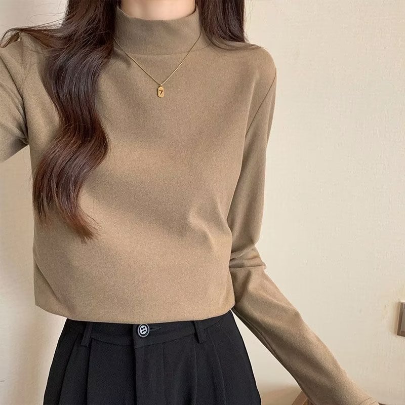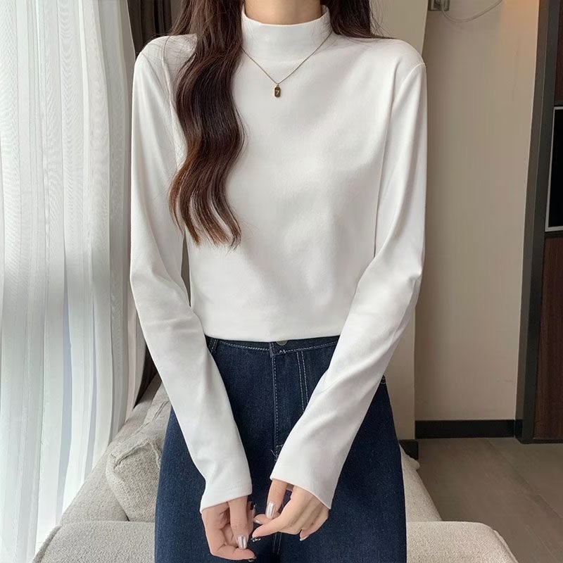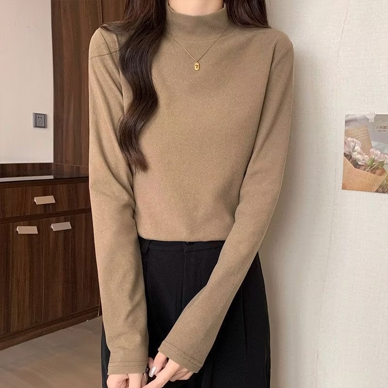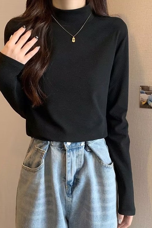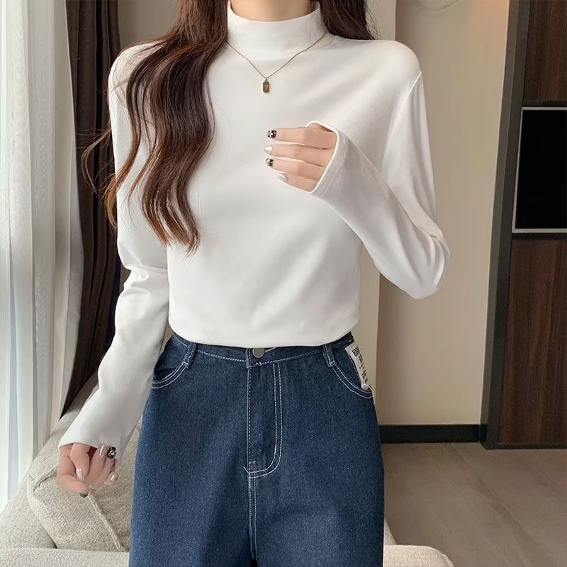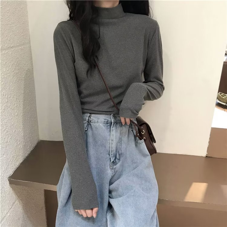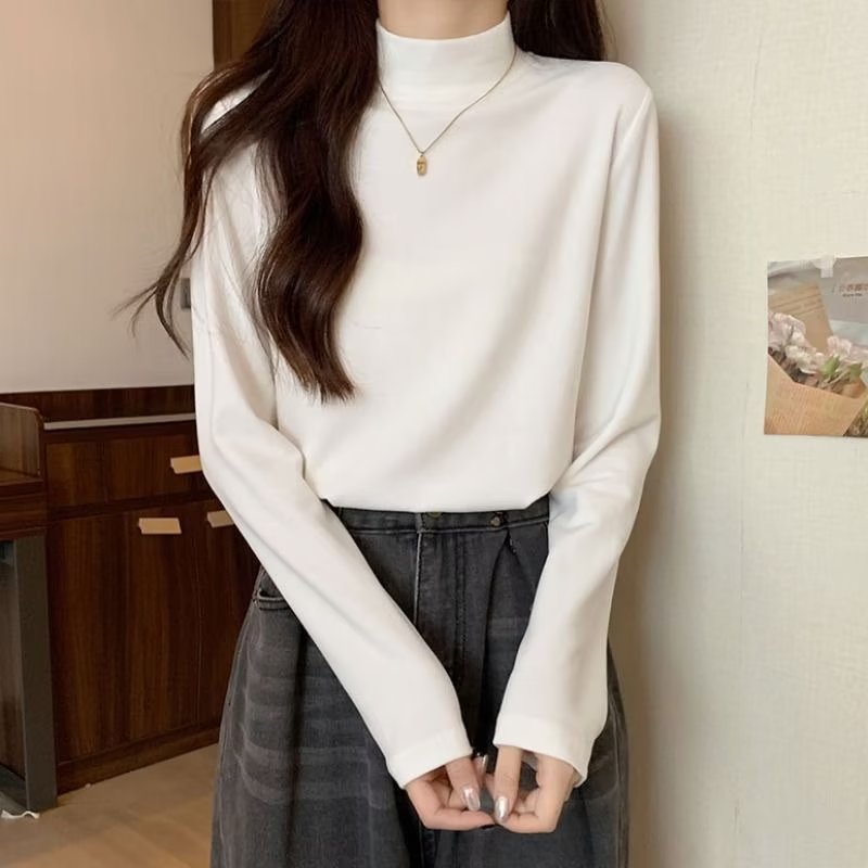 한국식 새로운 슬림핏 슬리밍 심플 긴팔 웜 탑 봄과 가을 올매치 하프 하이 칼라 베이스 내부 긴팔 탑