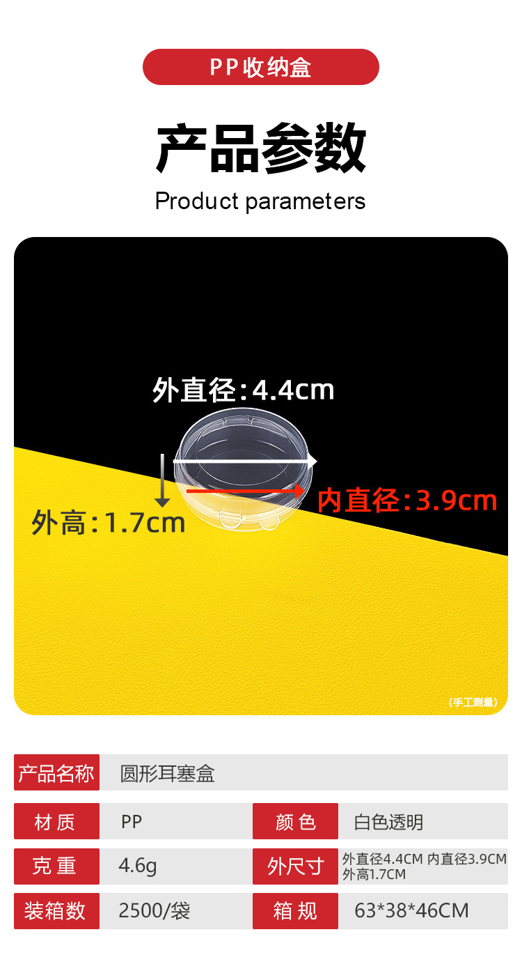 • 둥근 귀마개 상자의 외경은 4.4cm, 내경은 3.9cm, 외경은 1.7cm 입니다.