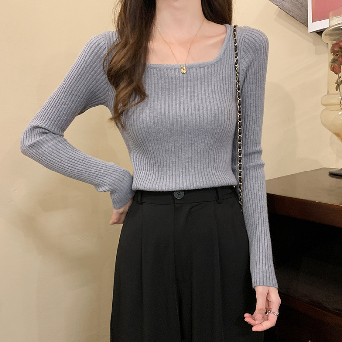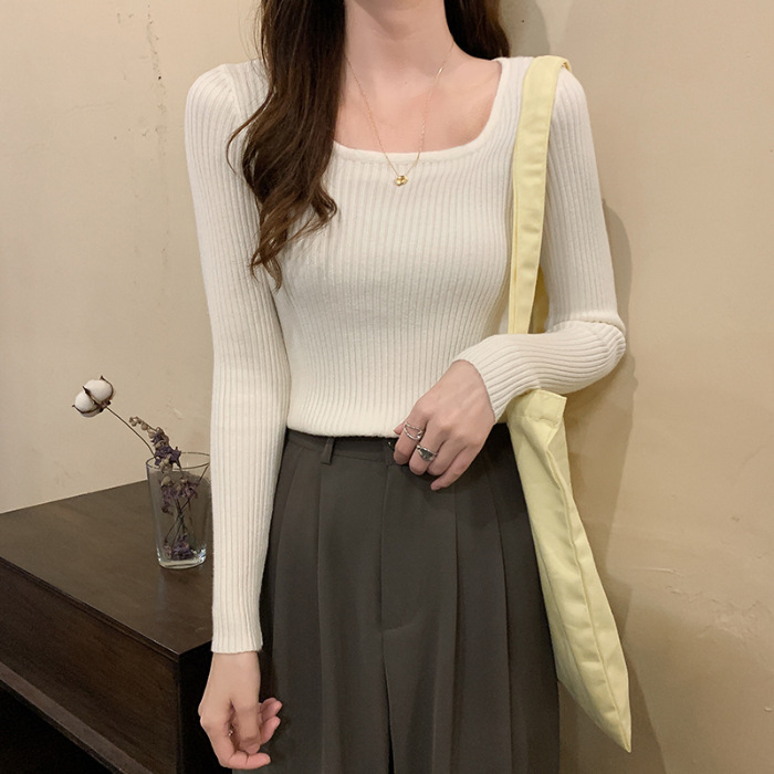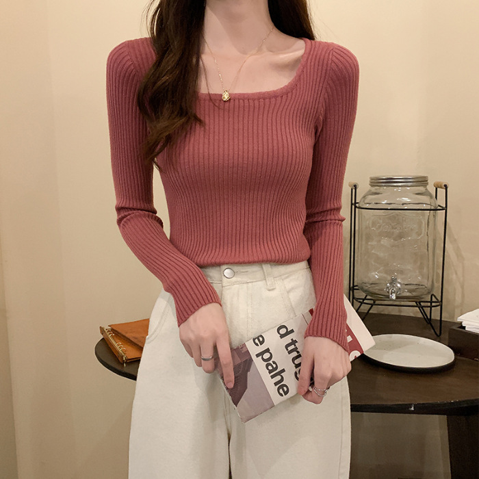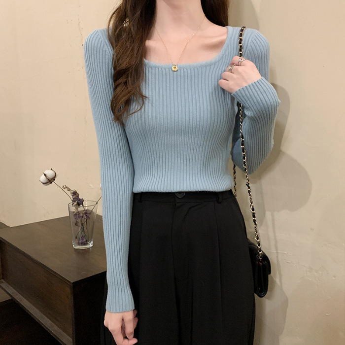 사각 넥라인 슬림핏 긴팔 이너웨어 2025 가을 신상 한국 스타일 로우넥 니트 스웨터 여성용 니트 학생 상의