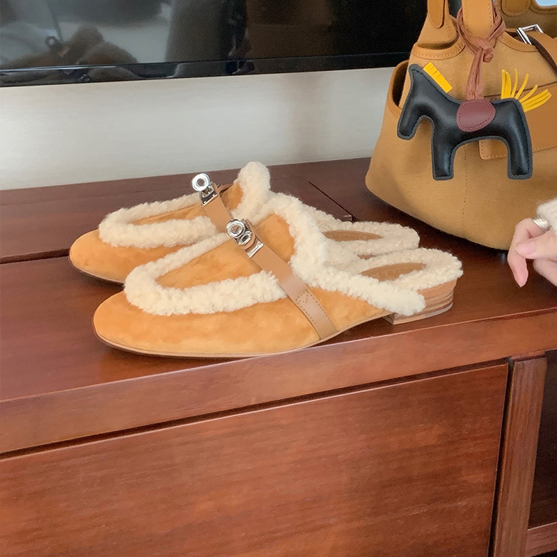 재고 있음~ 포도색 엄마님과 같은 스타일의 양가죽 일체형 뾰족한 둥근 앞코 잠금장치가 있는 털 슬리퍼 여성용 가을 겨울스토어 가기