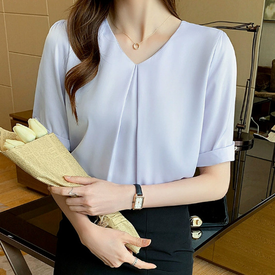 새로운 프랑스 스타일 셔츠 여성용 V-넥 디자인 반팔 틈새 여름 느슨한 일본식 올 매치 새틴 캐주얼 티셔츠