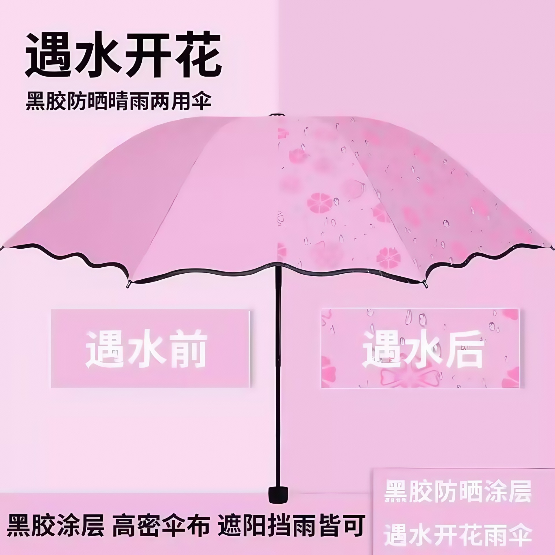 물에 닿으면 꽃이 피는 우산, 비 오나 눈이 오나 사용 가능한 접이식 양산, 창의적인 자외선 차단 광고 우산, 도매 블랙 글로스 우산