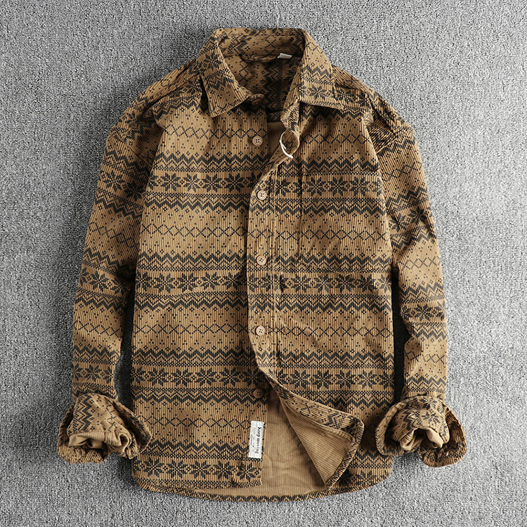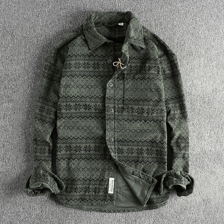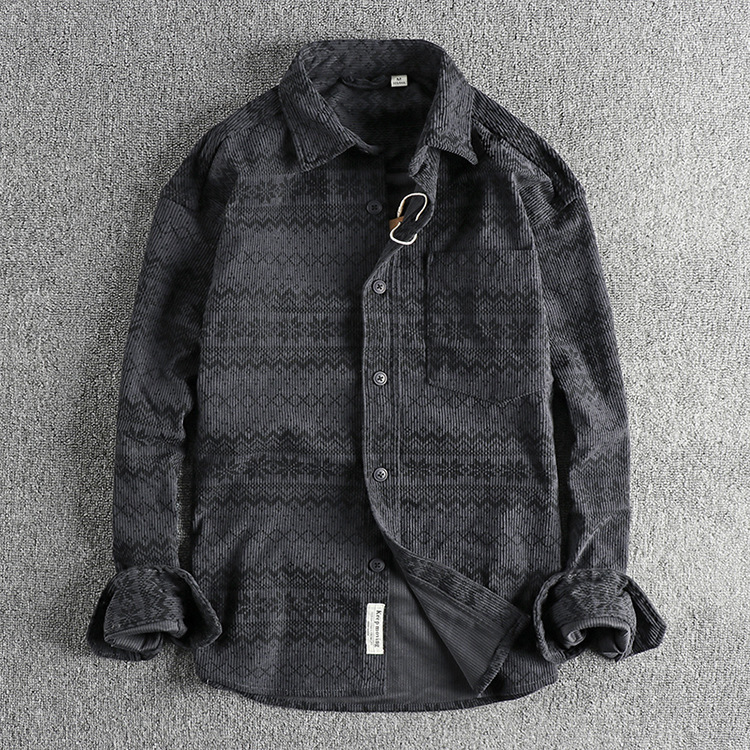 빈티지 토템 인쇄 된 세탁기 코듀로이 긴팔 셔츠 남자의 간단한 포켓 아메리칸 스타일 캐주얼 트렌디 얇은 재킷