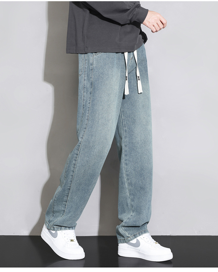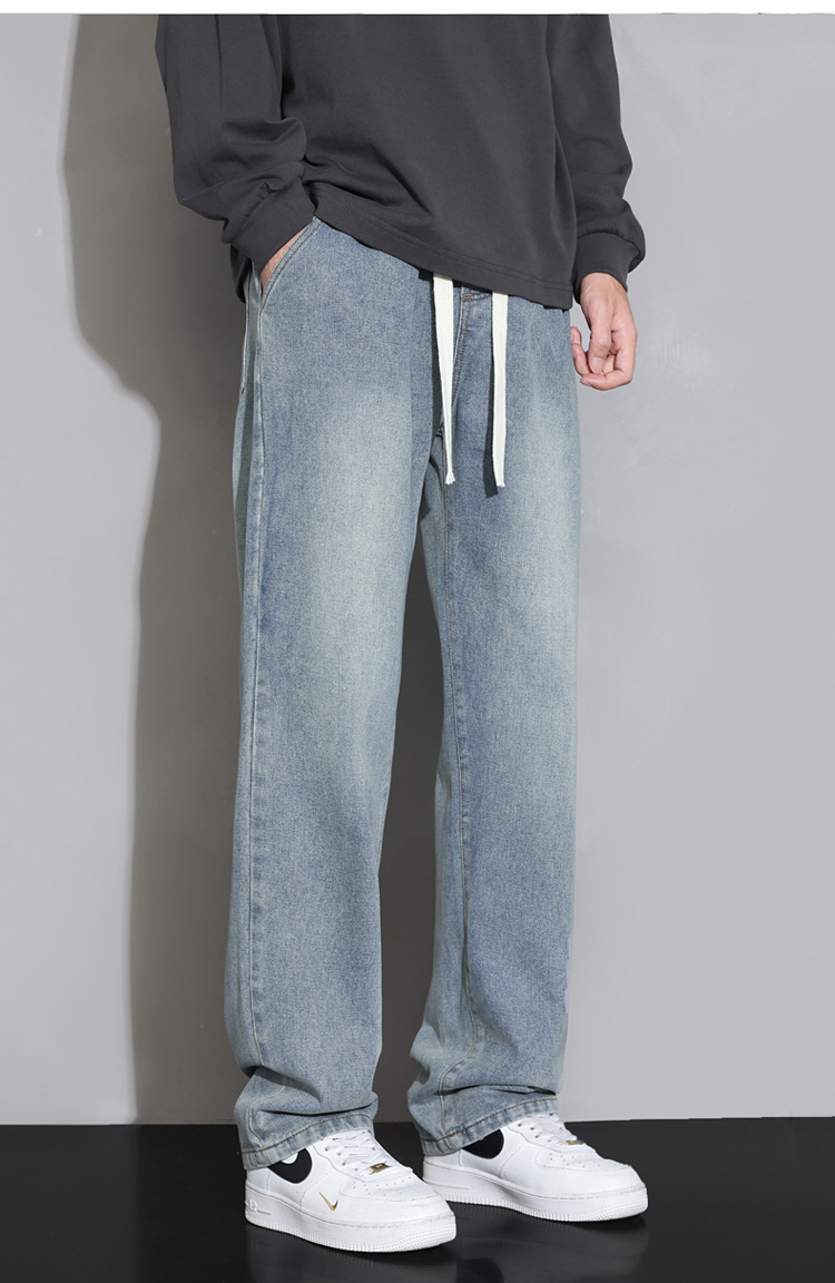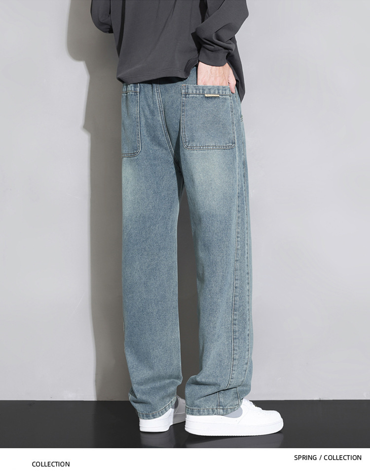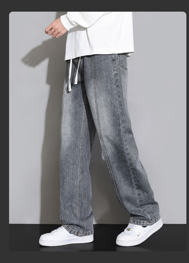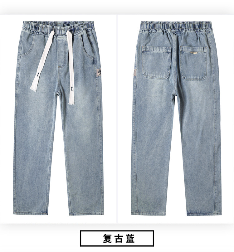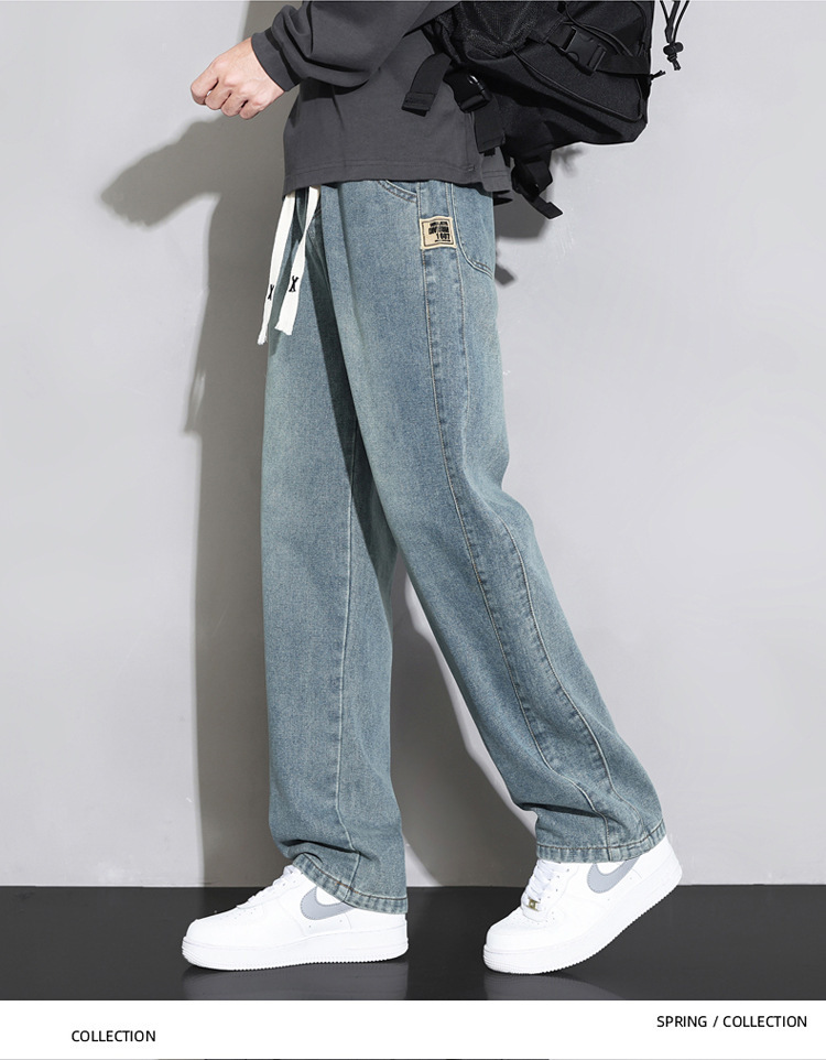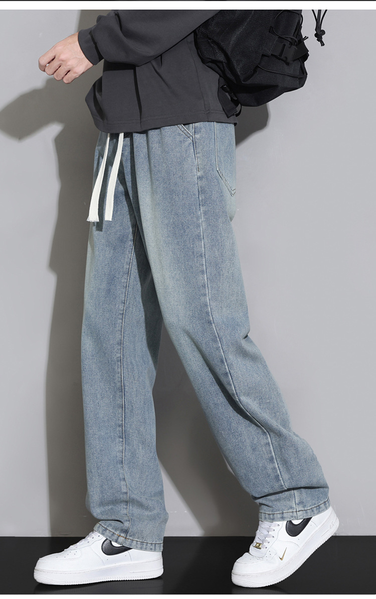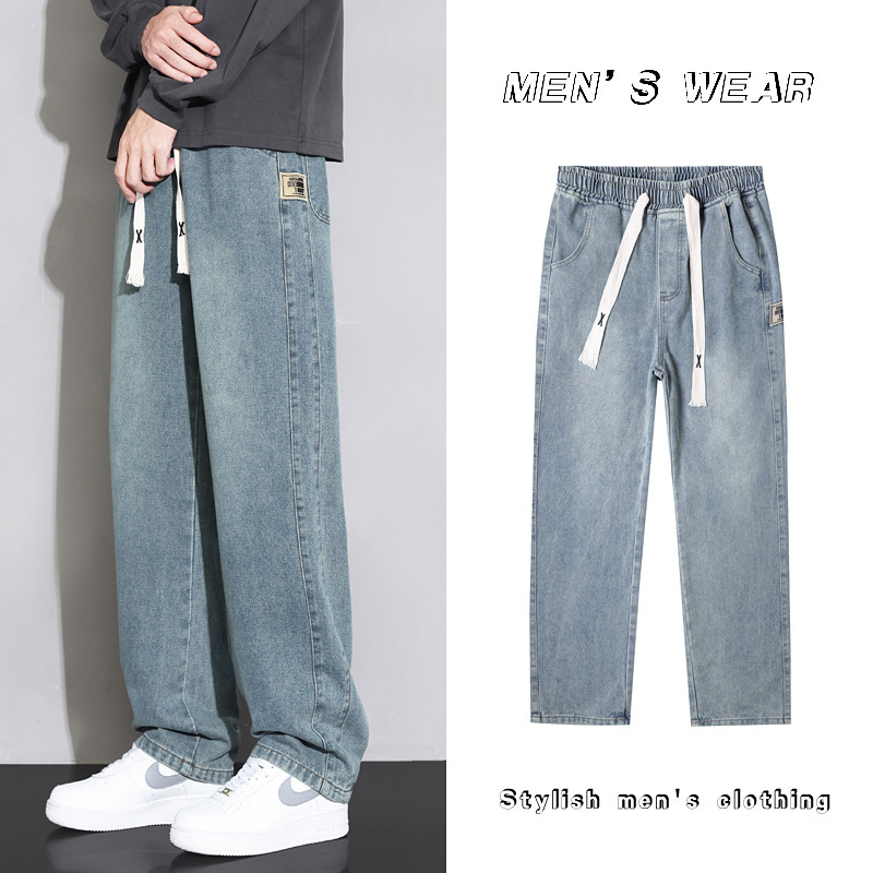 워싱 데님 팬츠 남성용 2025 봄 가을 루즈핏 탄력 허리밴드 아메리칸 하이스트리트 스트레이트 와이드 팬츠 캐주얼 롱 팬츠스토어 가기
