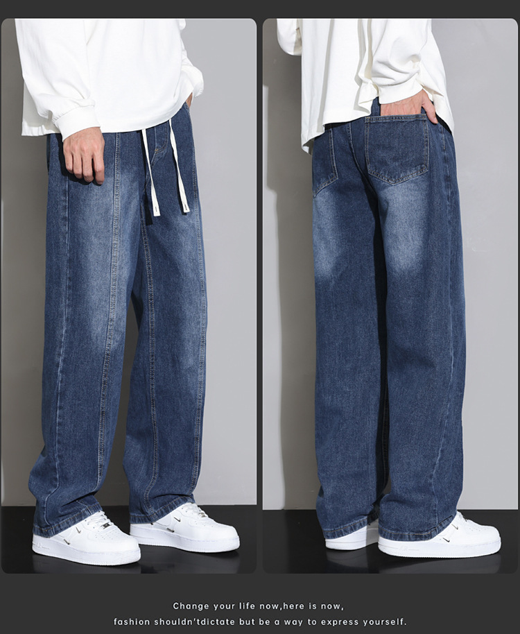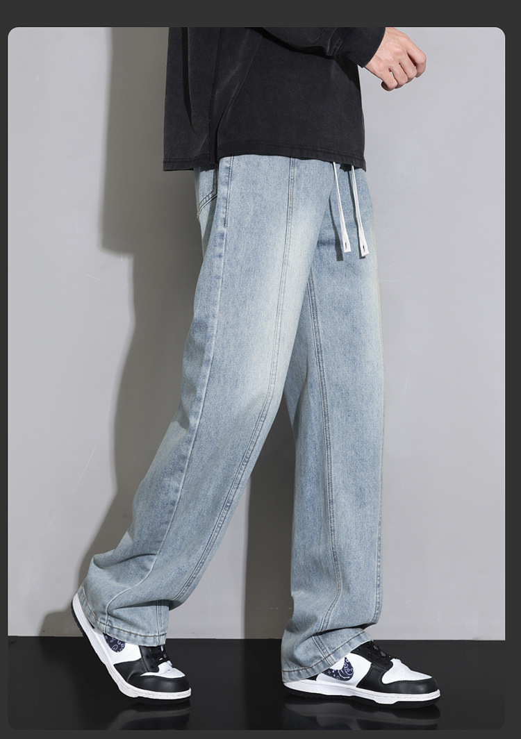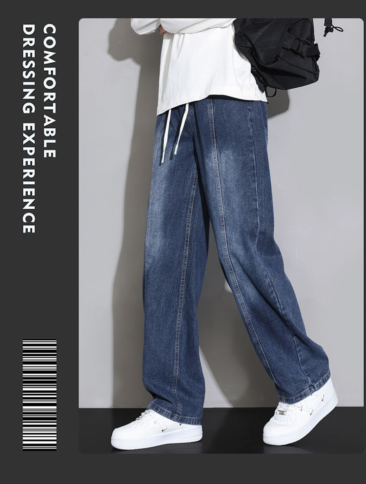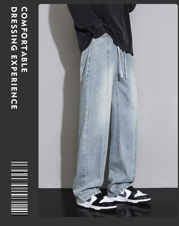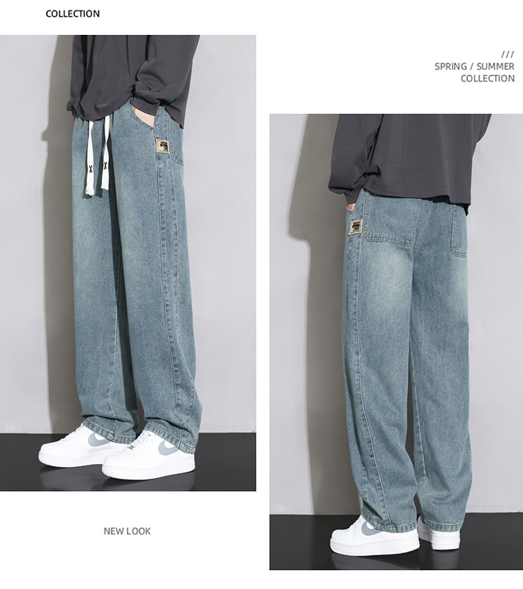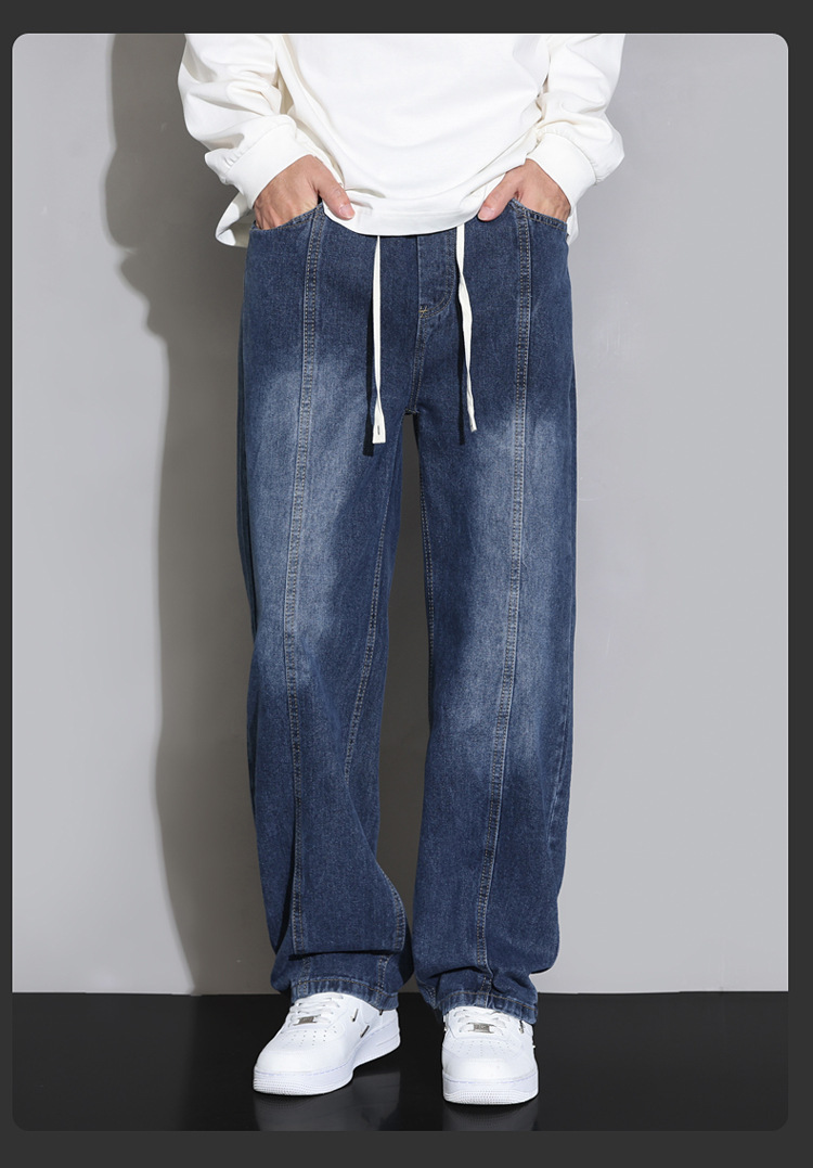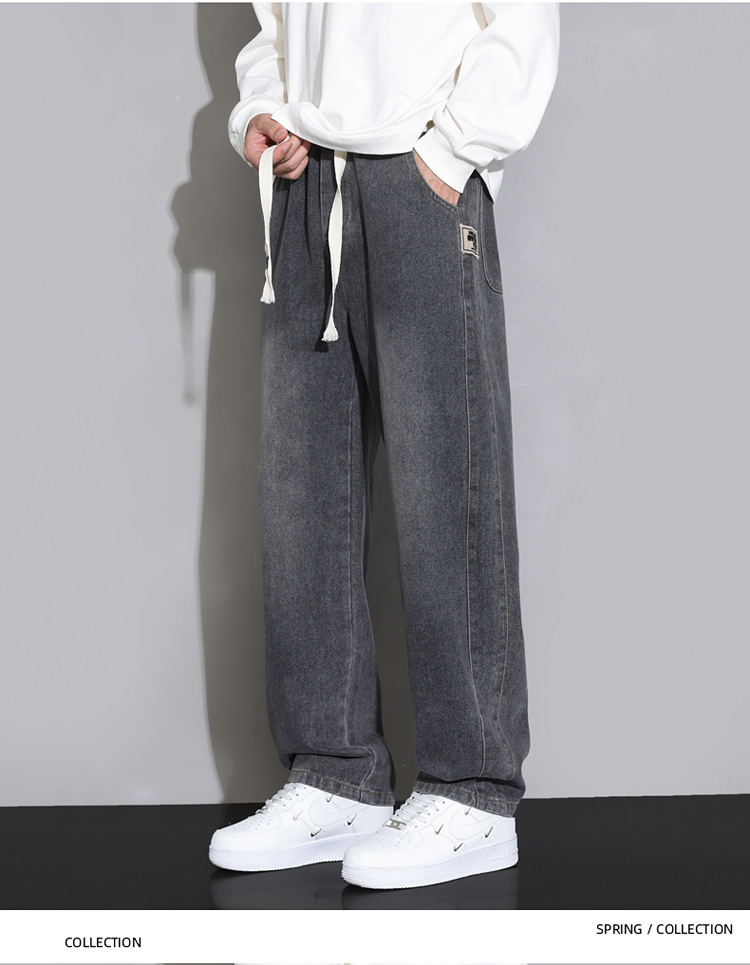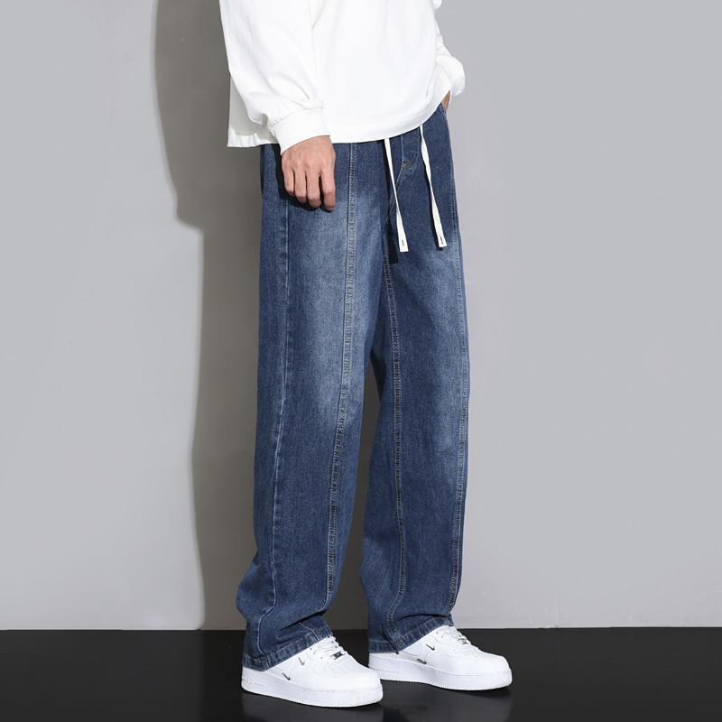워싱 데님 팬츠 남성용 2025 봄 가을 루즈핏 탄력 허리밴드 아메리칸 하이스트리트 스트레이트 와이드 팬츠 캐주얼 롱 팬츠스토어 가기