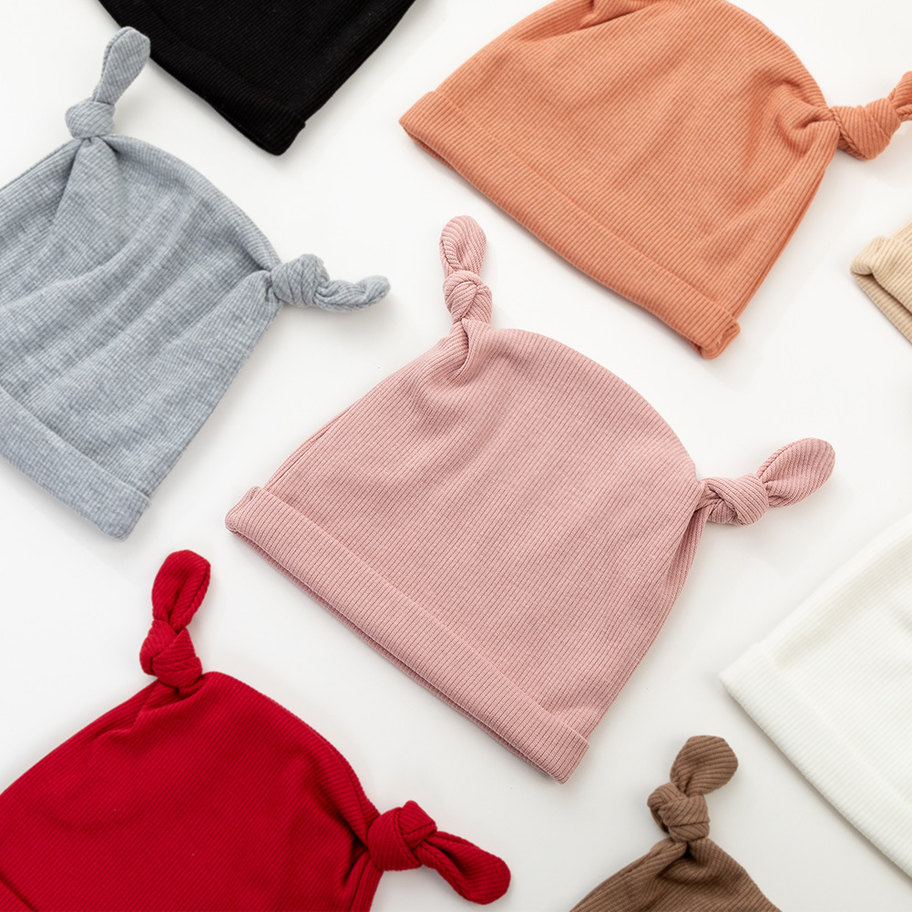 跨境新款纯色儿童套头帽双蝴蝶结宝宝印度帽子坑条棉柔软婴儿胎帽超值价:¥4.7