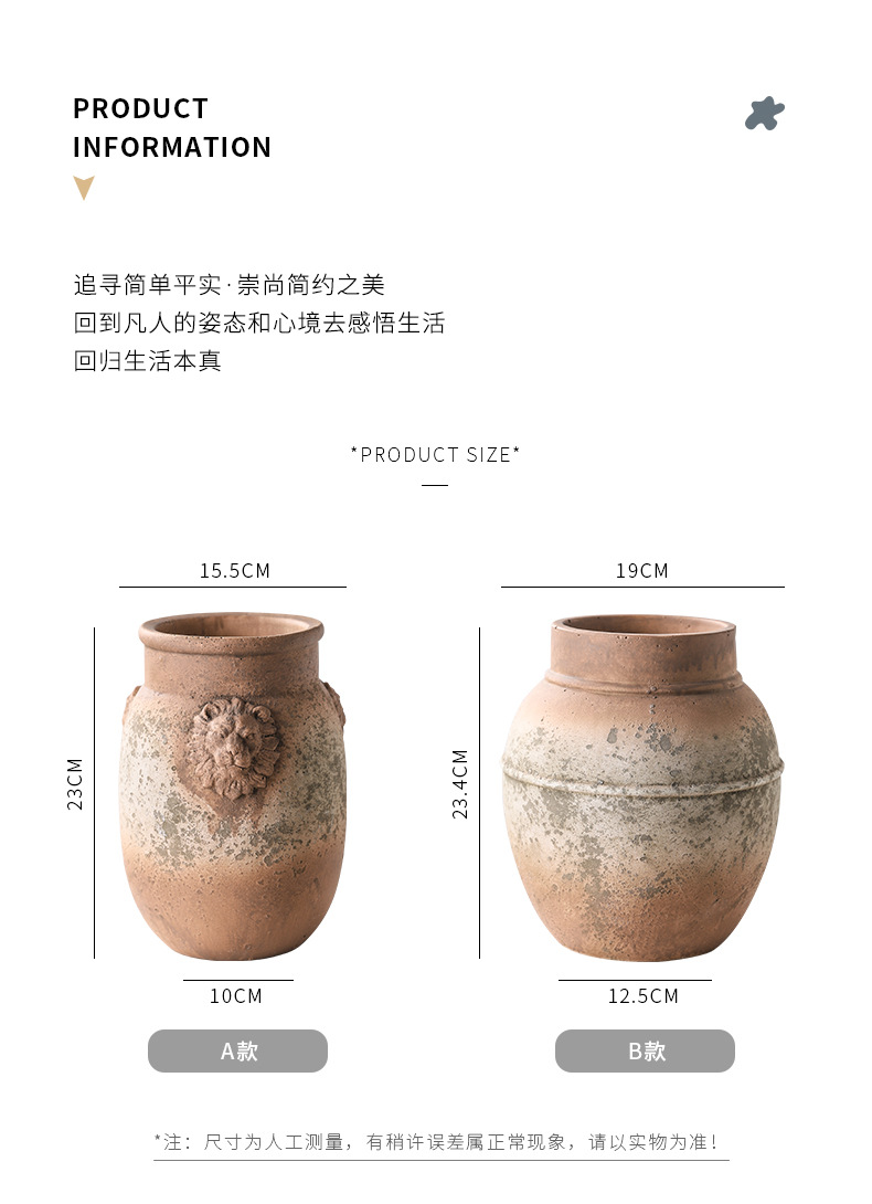 本店是厂家直销,花盆为手工粗陶或水泥材质,尺寸正负0.5公分,以实物为准。