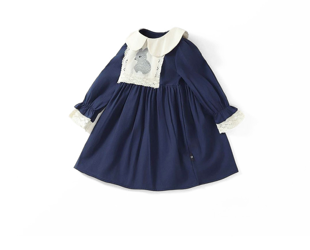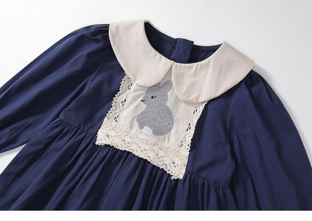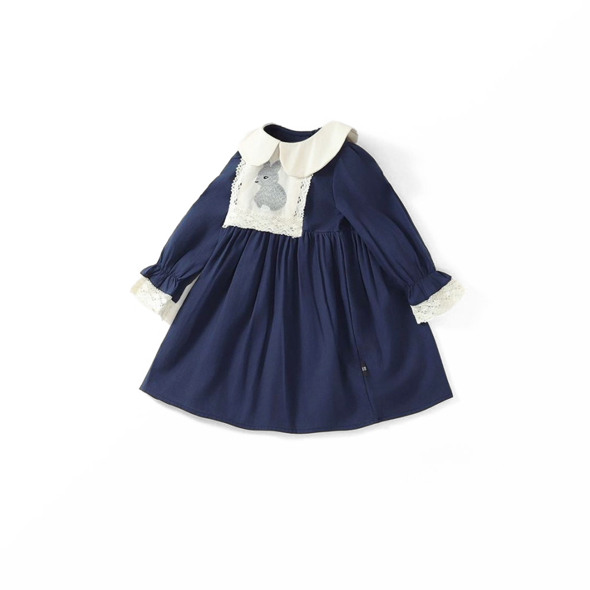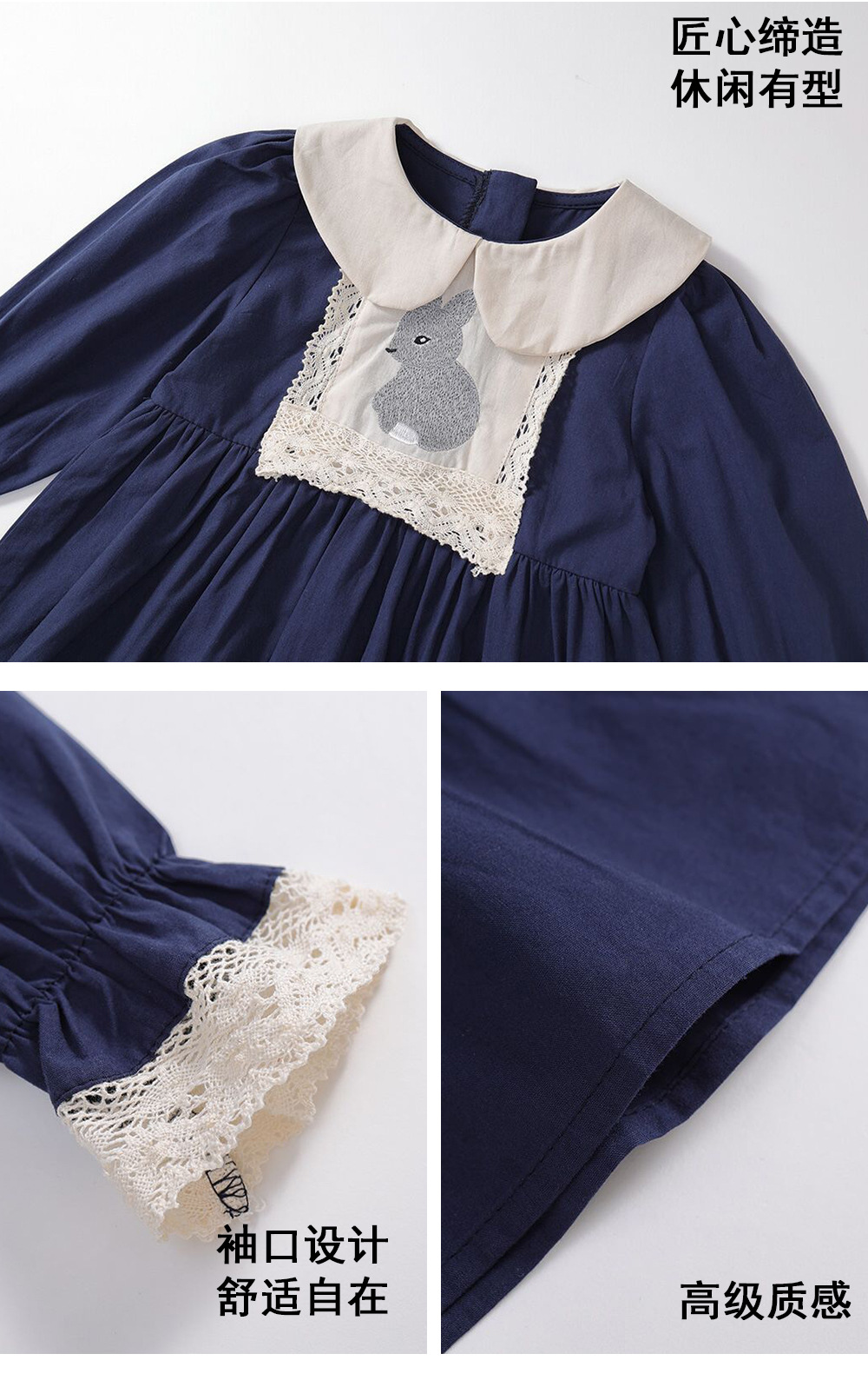 MDD 아기 소녀 프랑스 인형 목걸이 토끼 수 놓은 2024 가을 긴 소매 네이비 대학 스타일 원피스 공주스토어 가기