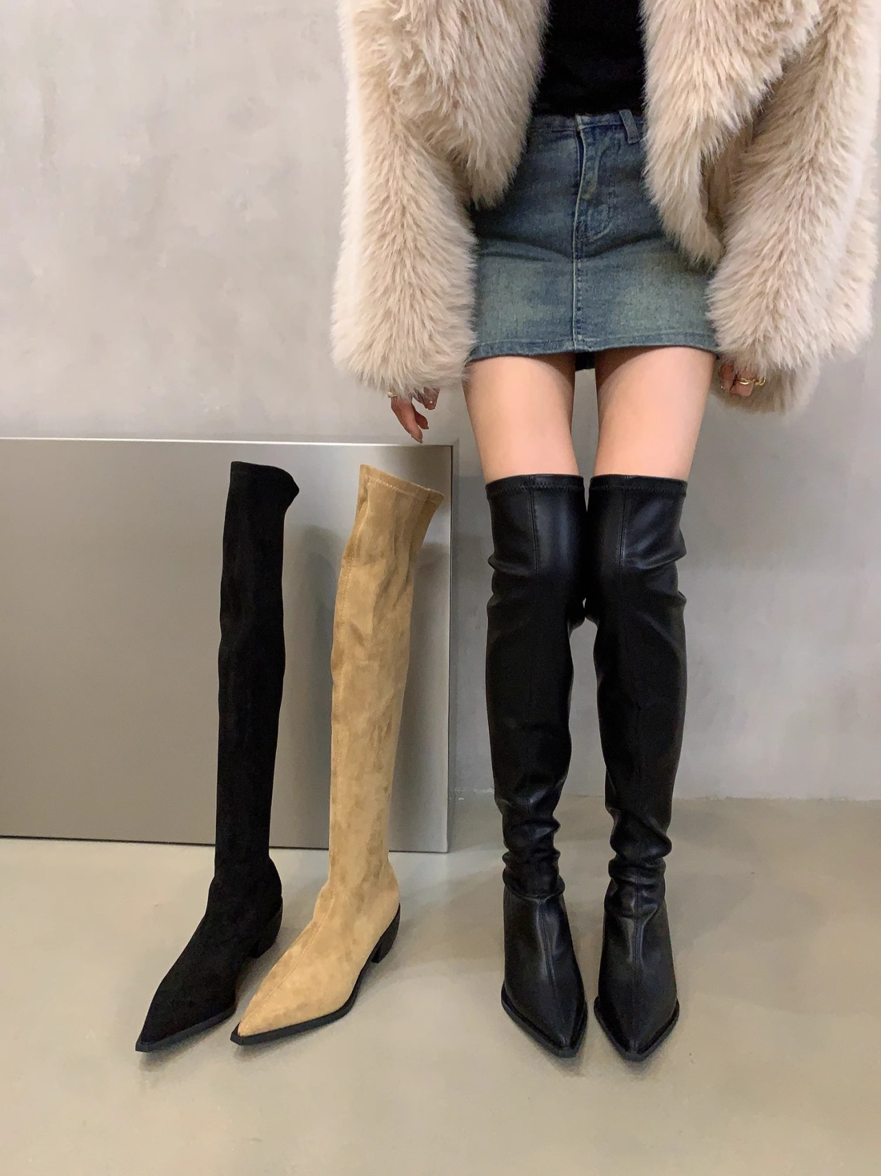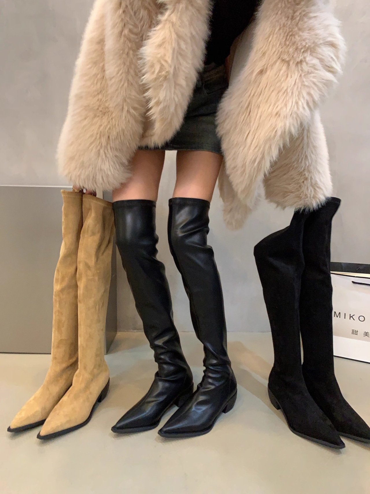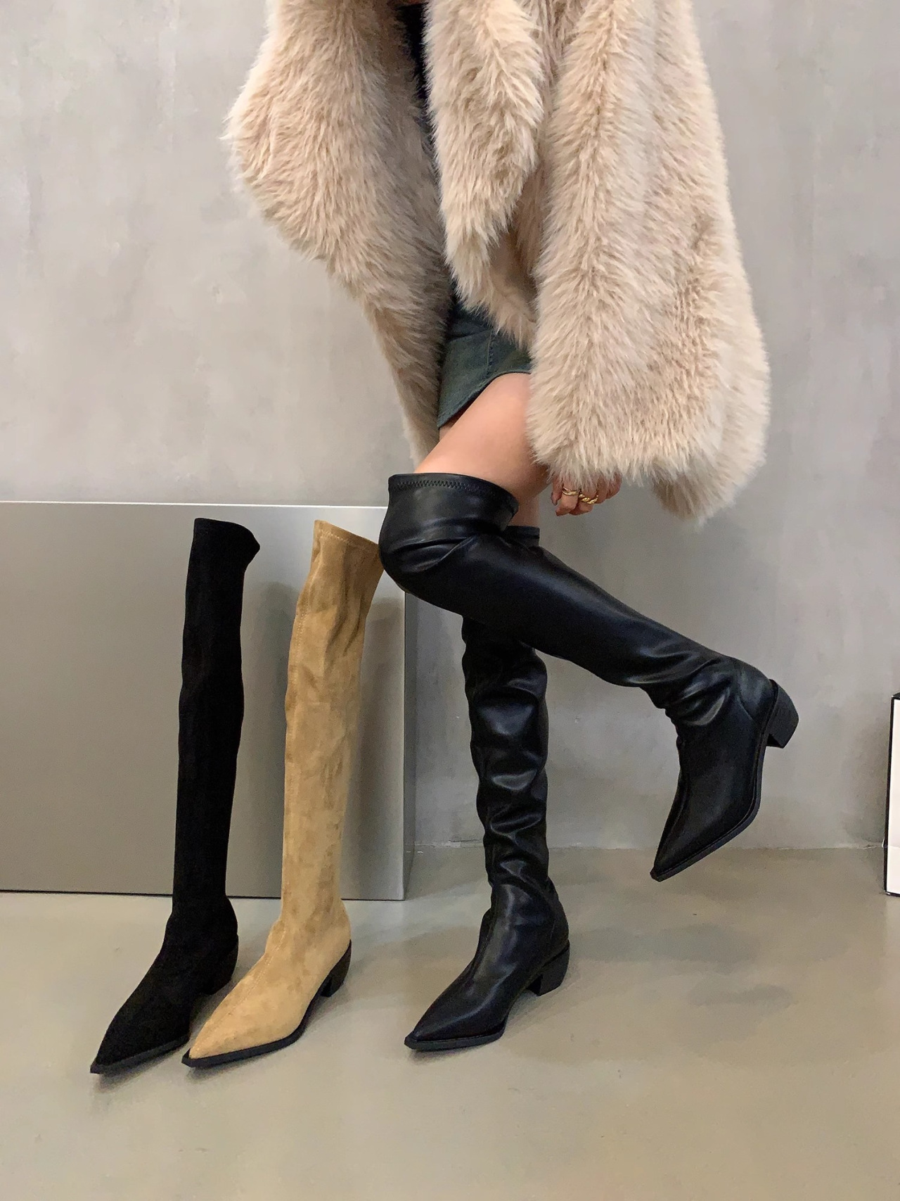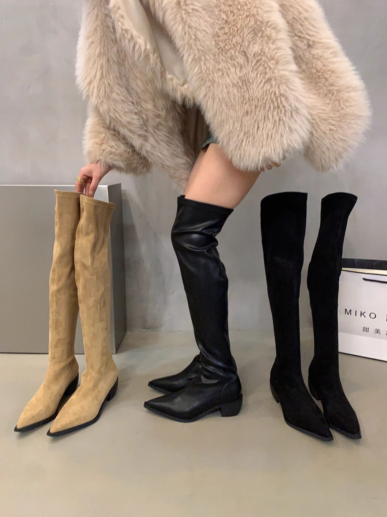 무릎 위 부츠 여성의 새로운 한국 스타일 스퀘어 힐 두꺼운 바닥 뾰족한 패션 부츠 서양 트렌드 패션 기사 부츠 도매스토어 가기