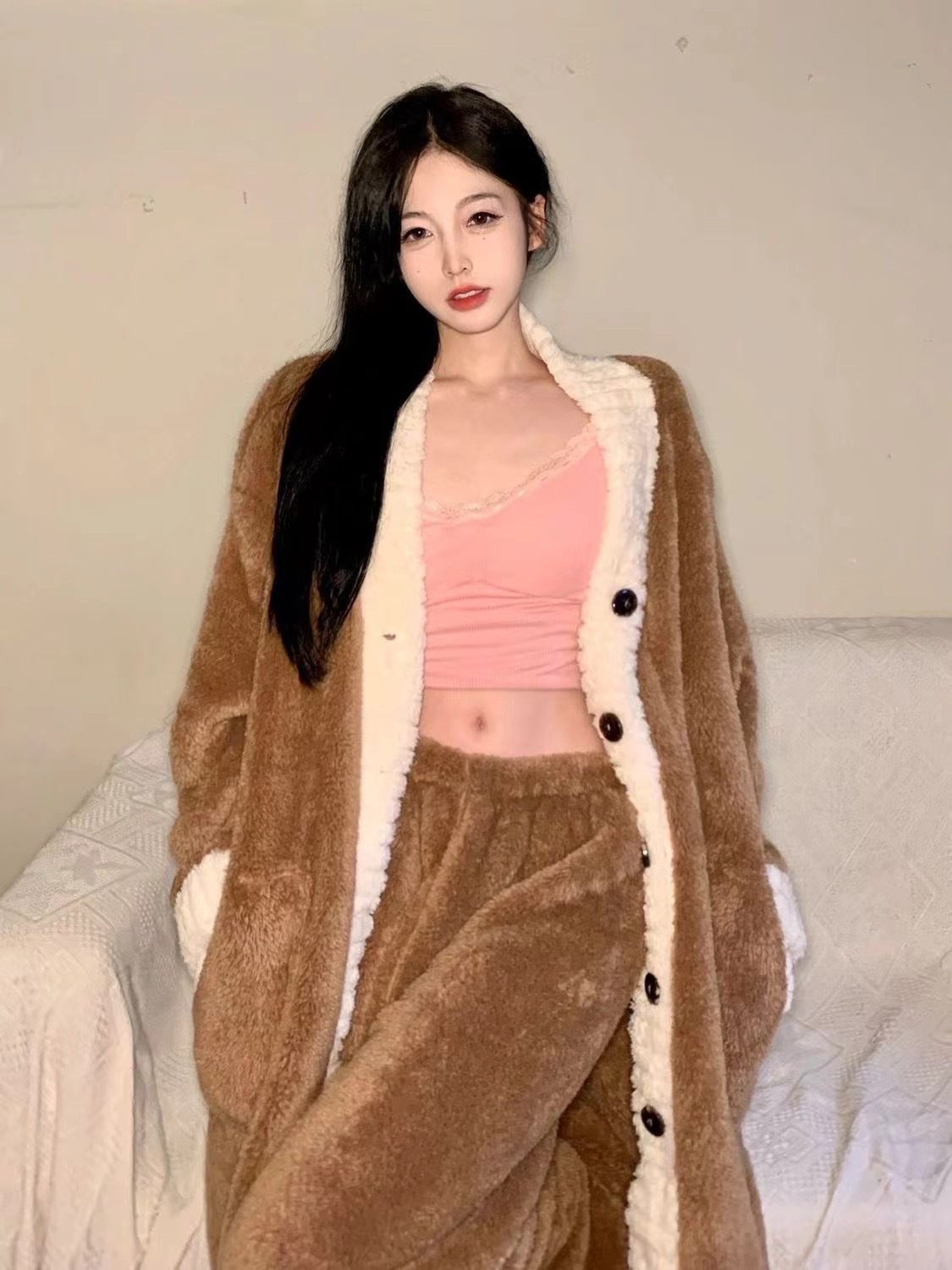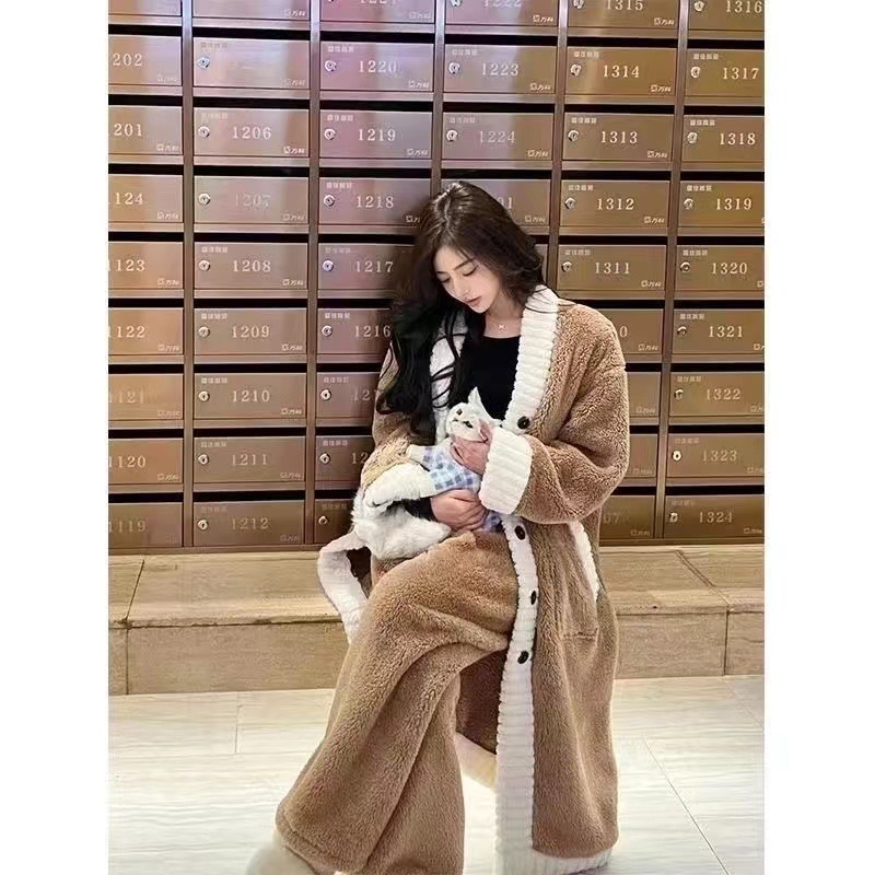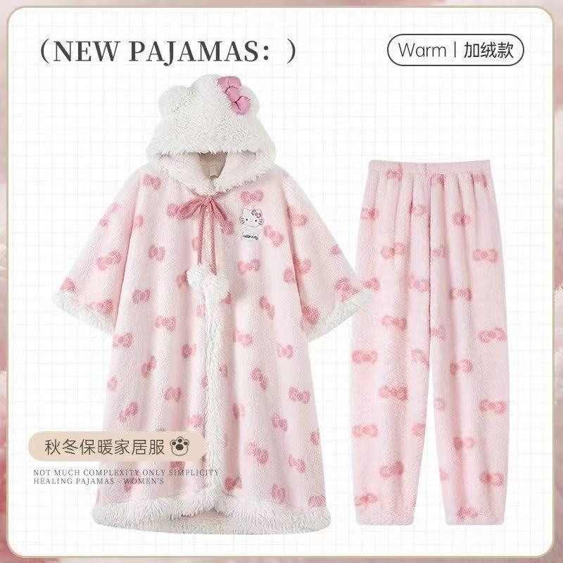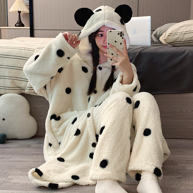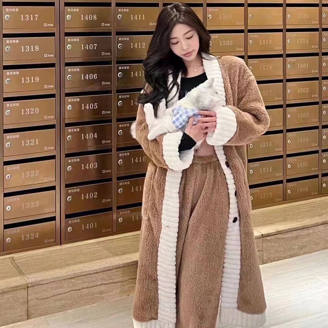 산호 양털 잠옷 여자의 가을과 겨울 새로운 인터넷 연예인 바람 두꺼운 따뜻한 봉제 잠옷 바지 고급 홈 세트