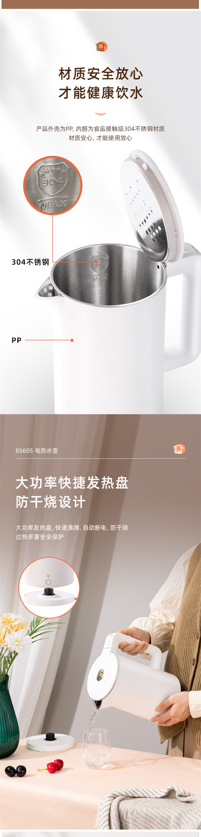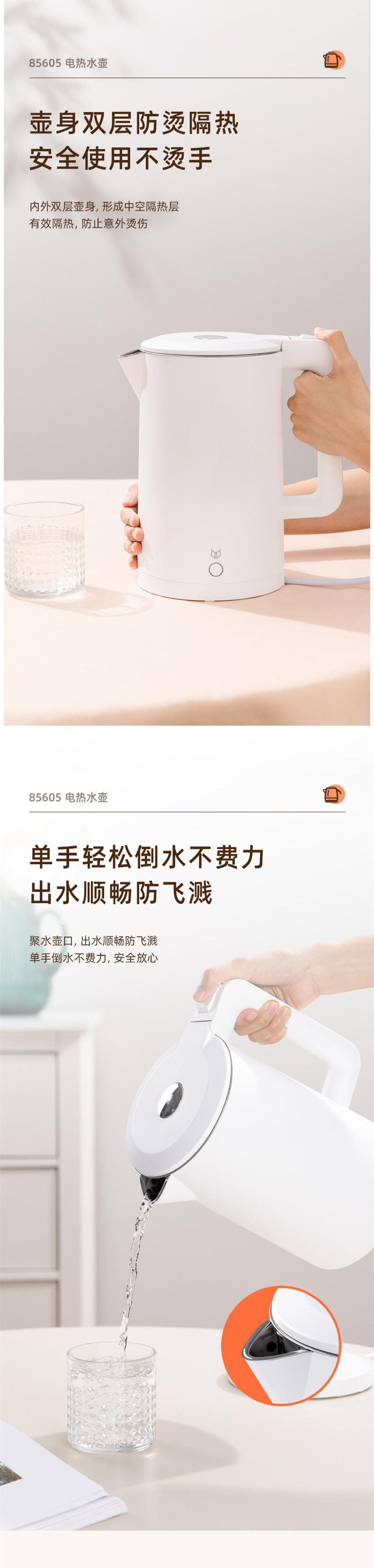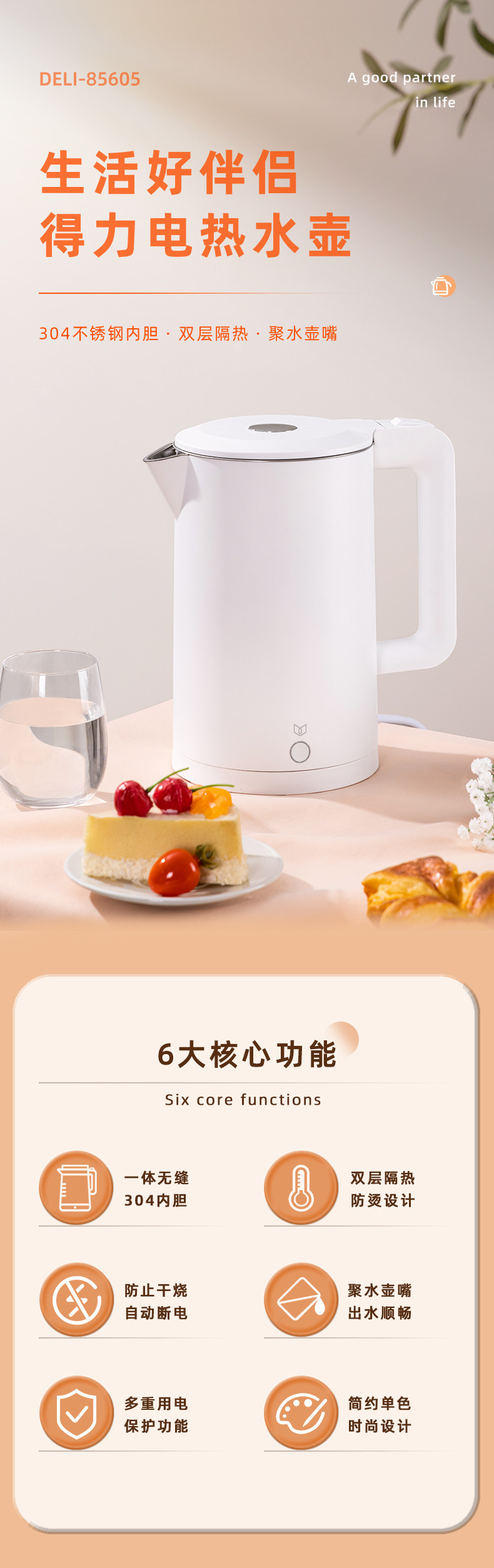 델리 85605 전기 주전자 사무실 가정용 304 스테인레스 스틸 내부 2 층 단열 가열 방지 뜨거운 주전자 도매