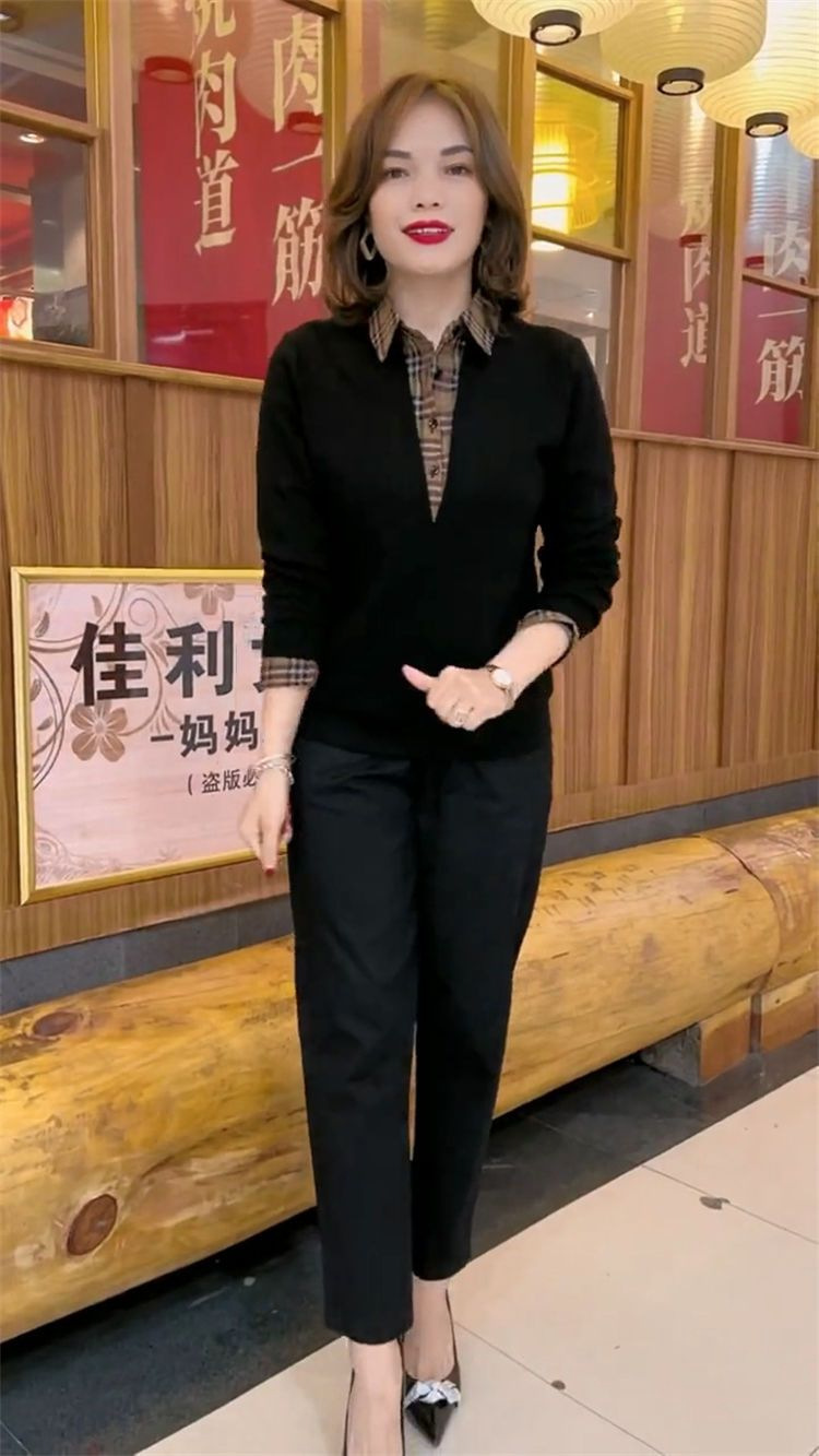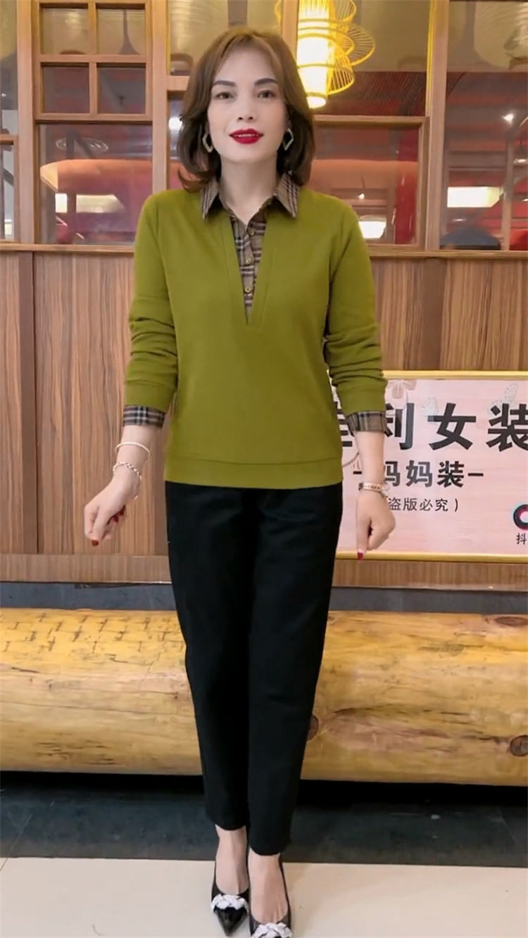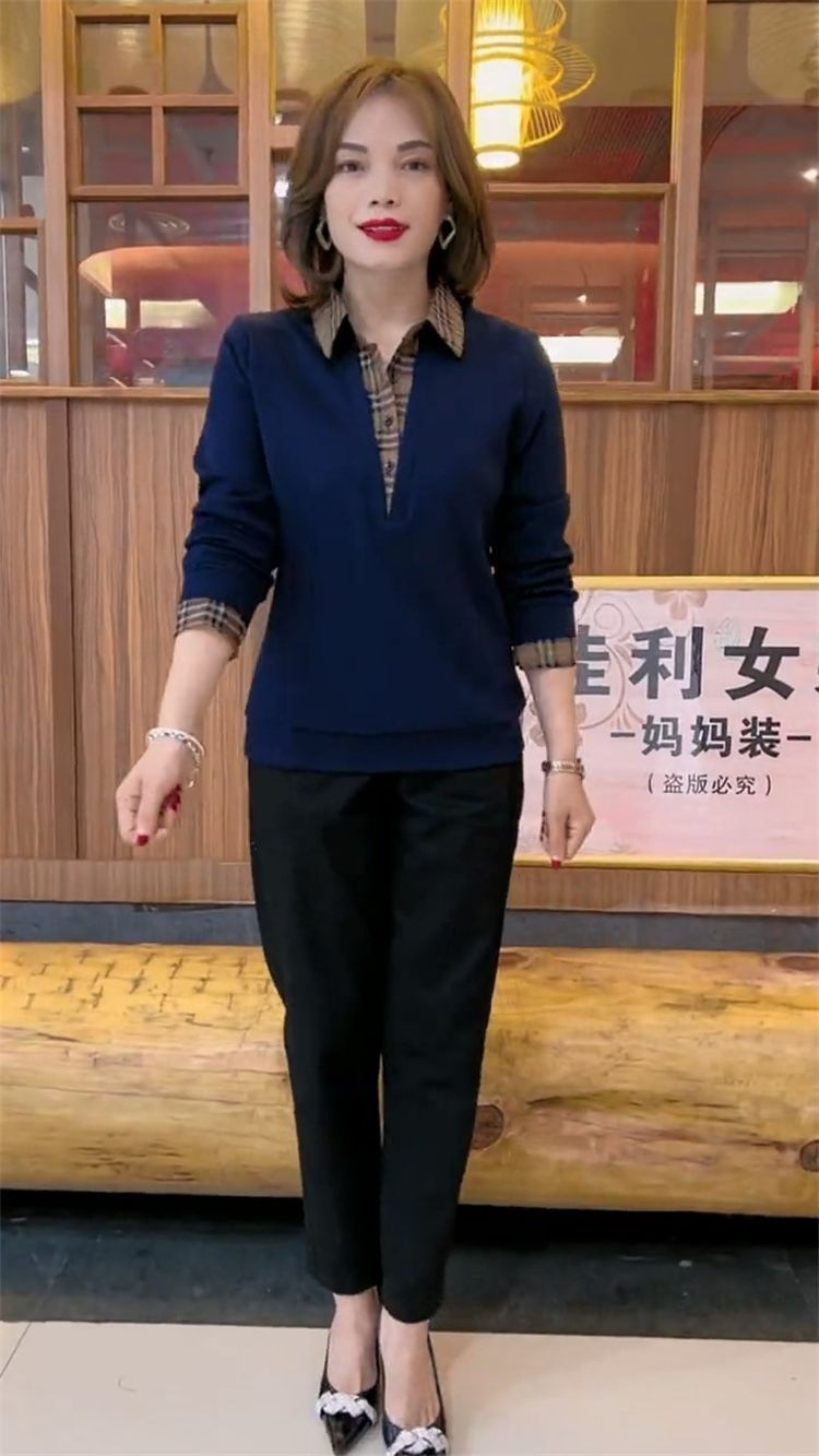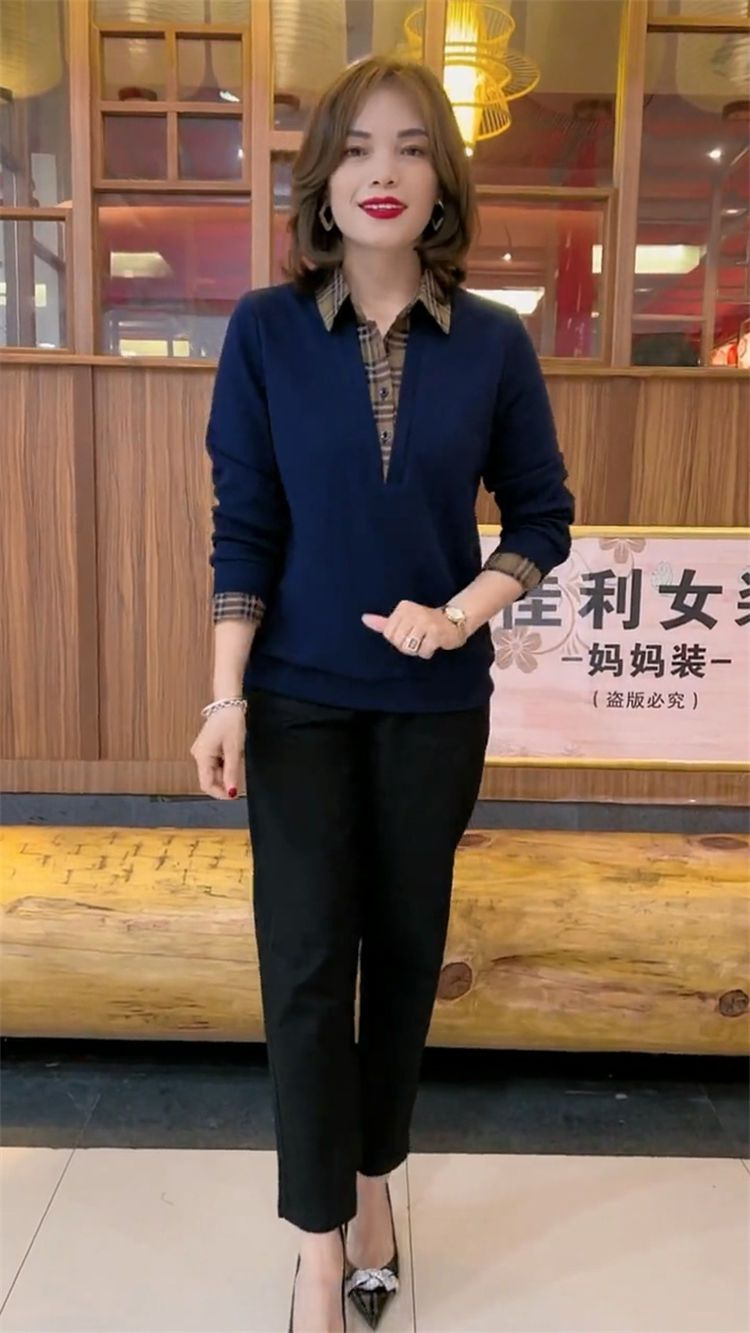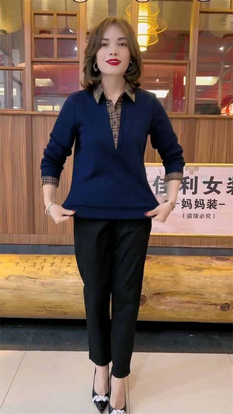 플러스 사이즈 200 진 기모 두꺼운 가짜 투피스 가을과 겨울 패션 셔츠 스티치 스웨터 여성의 느슨한 배꼽 덮개 어머니스토어 가기