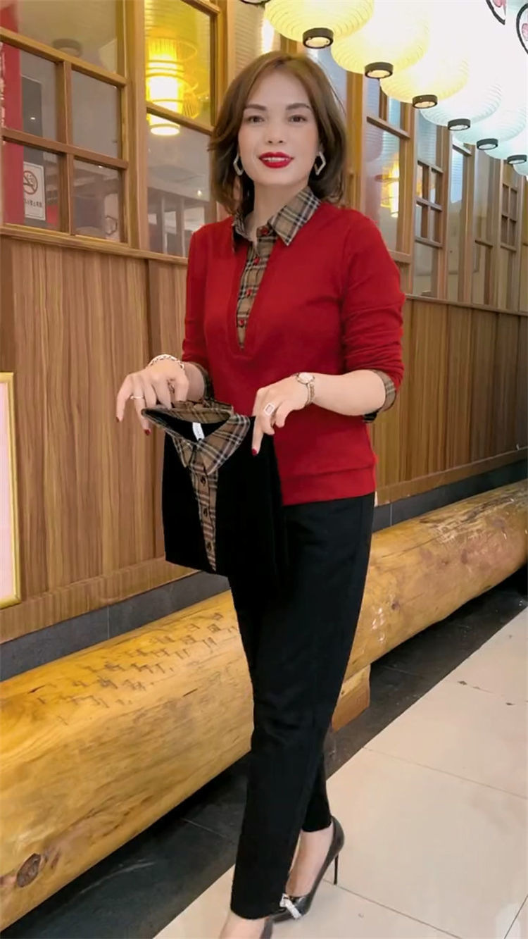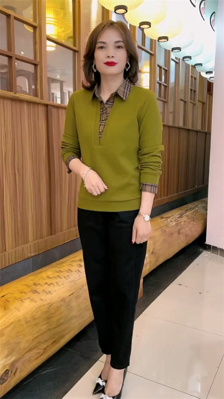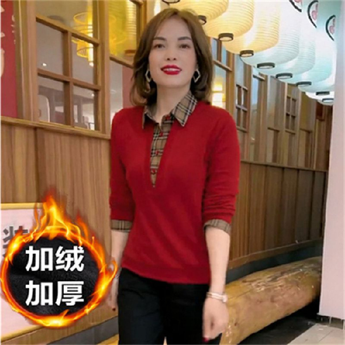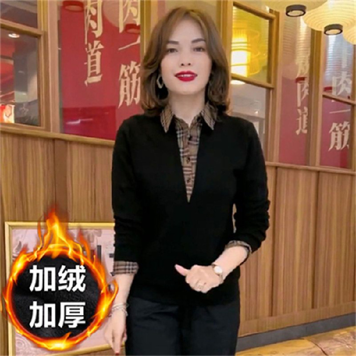 플러스 사이즈 200 진 기모 두꺼운 가짜 투피스 가을과 겨울 패션 셔츠 스티치 스웨터 여성의 느슨한 배꼽 덮개 어머니
