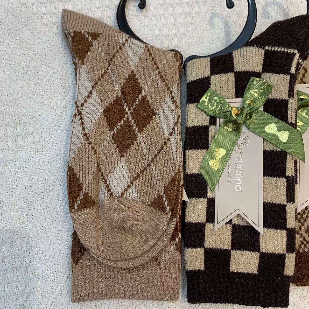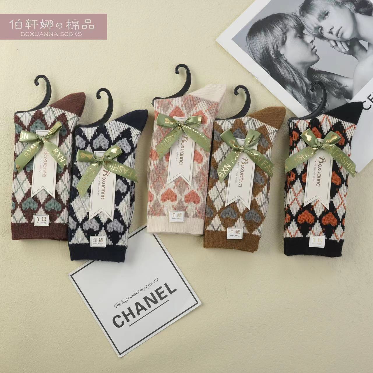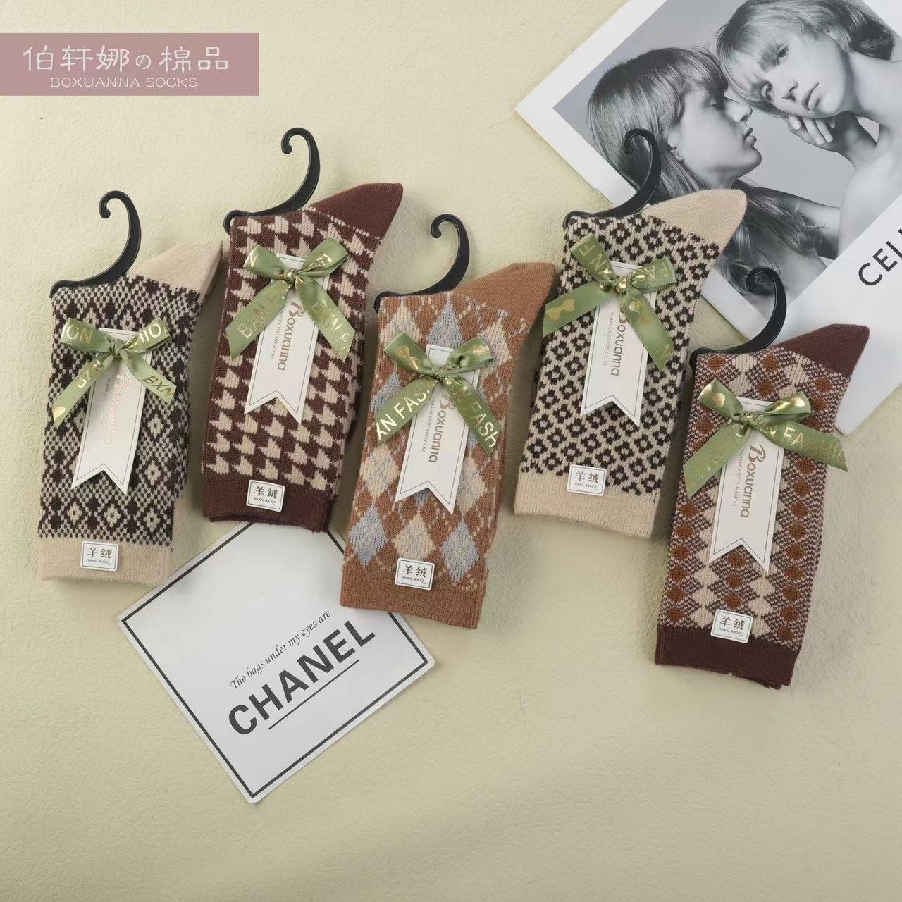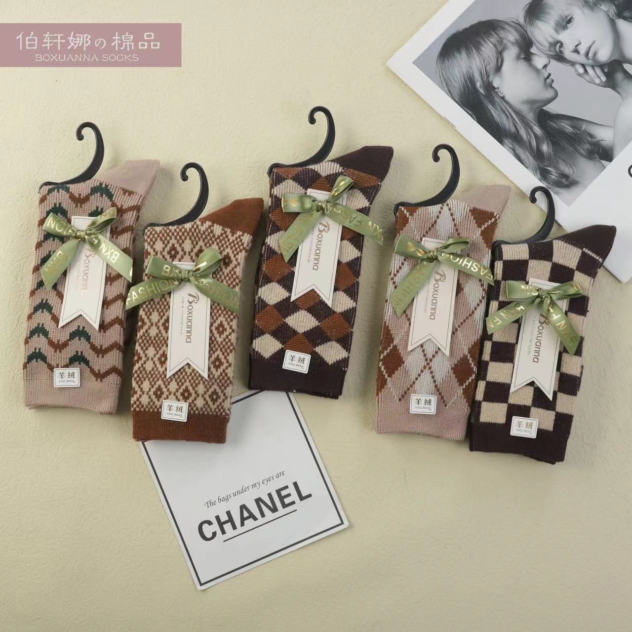 양말 여성 가을과 겨울 새로운 더블 바늘 더블 도로 여성용 캐시미어 양말 쌓인 양말 인터넷 인기있는 높은 스타킹 빈티지 중공업 색상