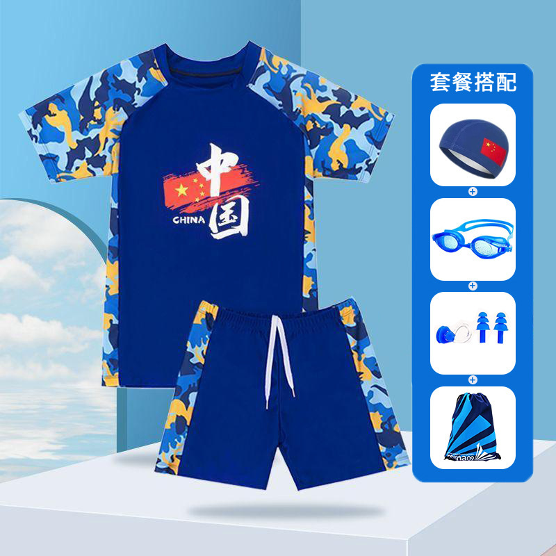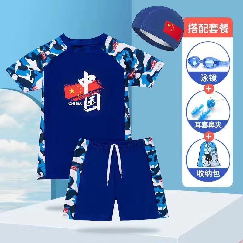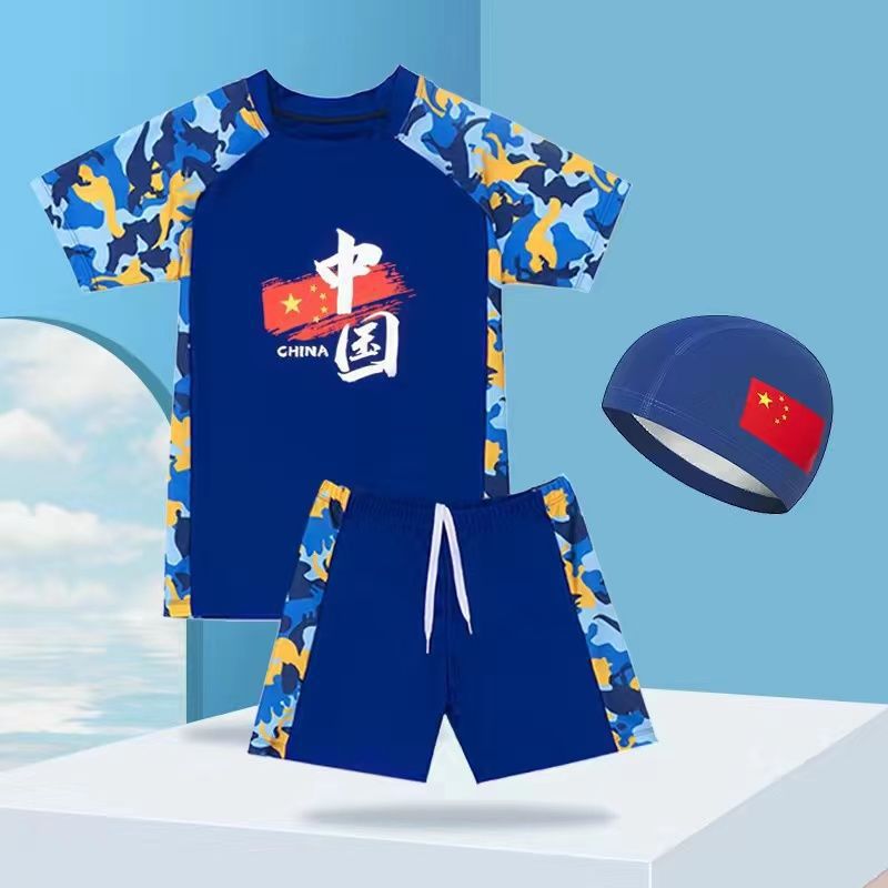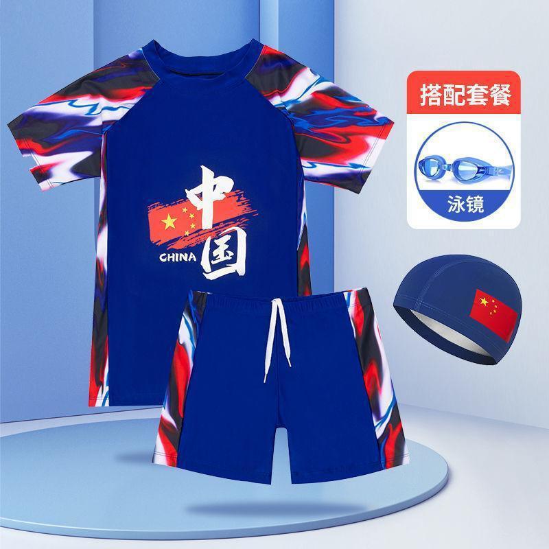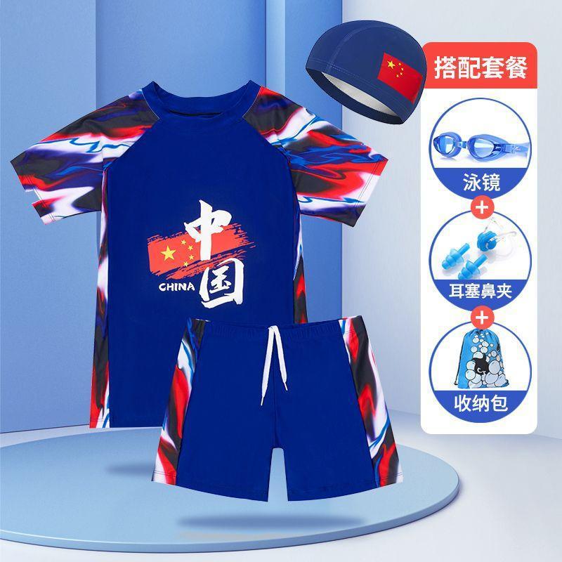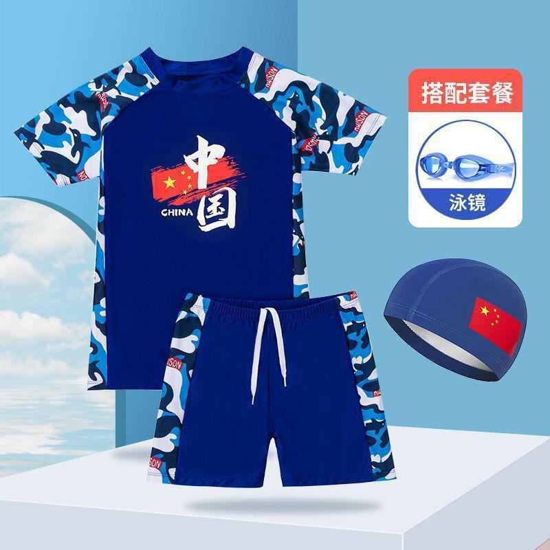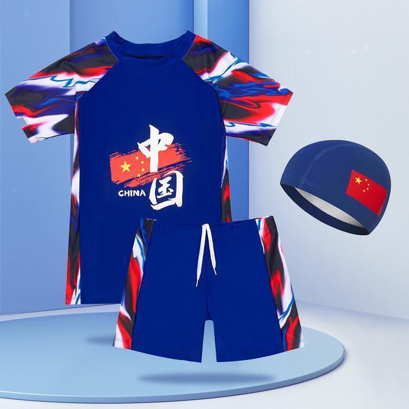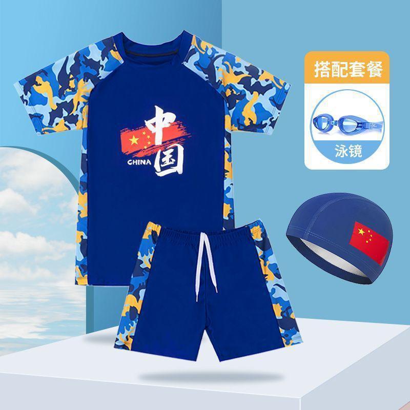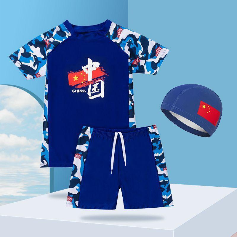 중국 스타일 청소년 수영복 큰 어린이 수영 세트 중학생 어린이 태양 보호 수영복 수영 모자 수영복 소년