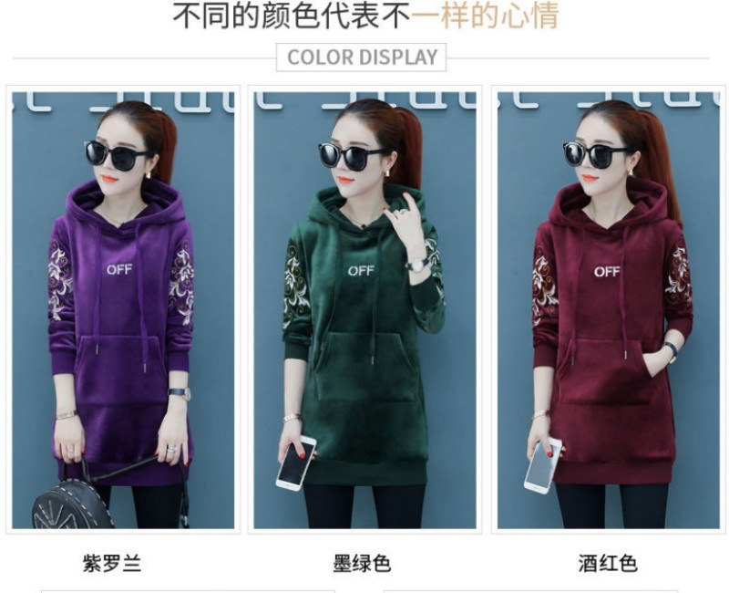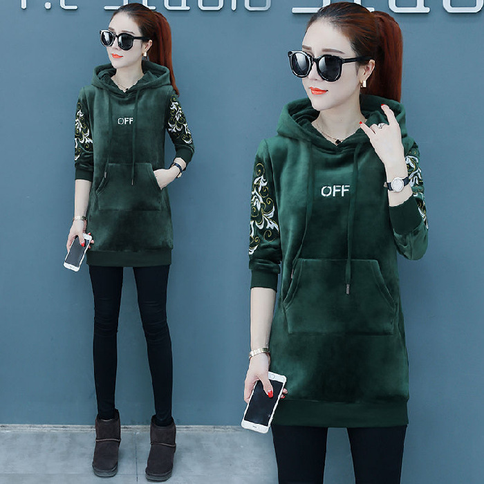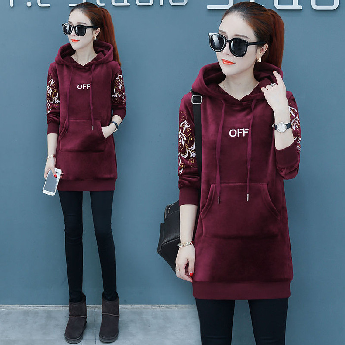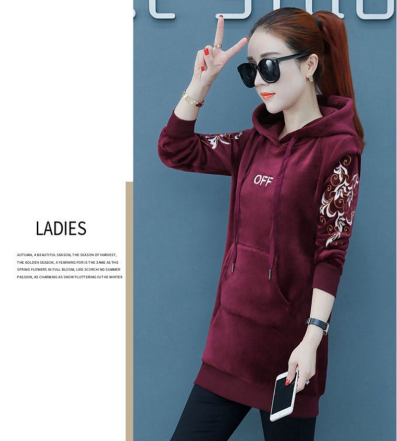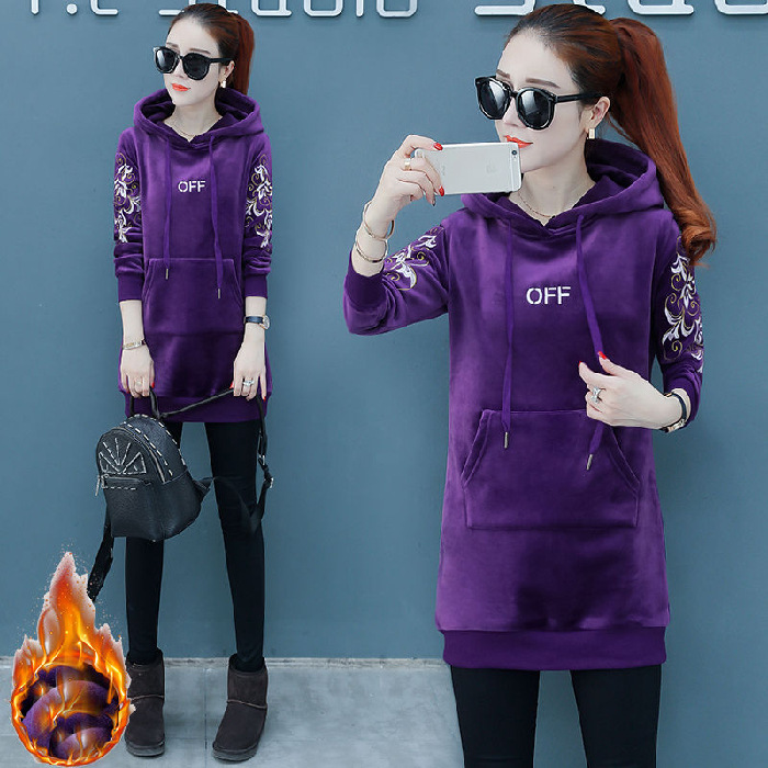 양면 벨벳 중간 길이 풀오버 스웨터 여성 후드 가을과 겨울 골드 벨벳 기모 두꺼운 겨울 따뜻한 탑 유행