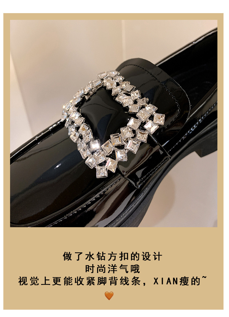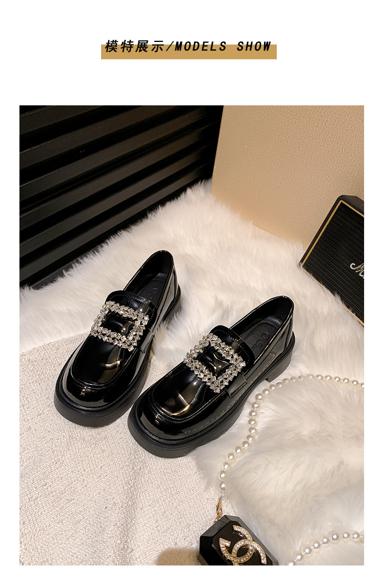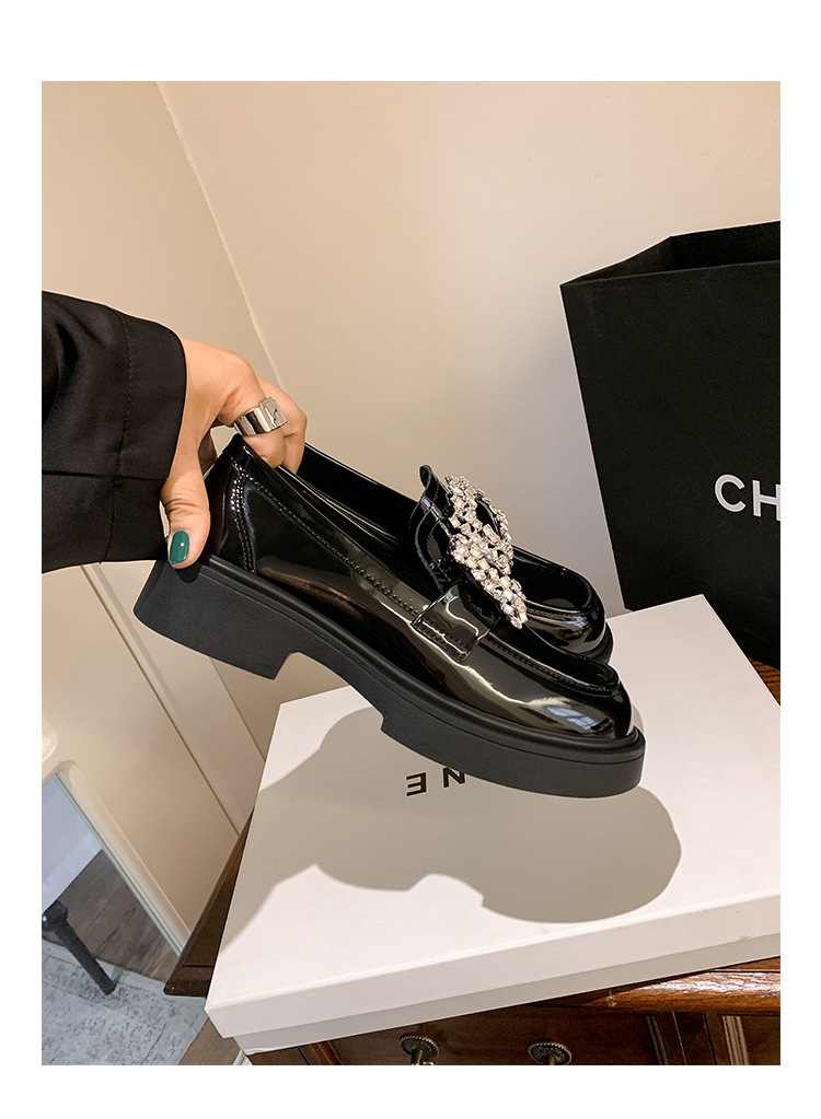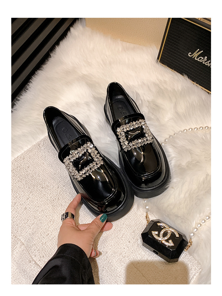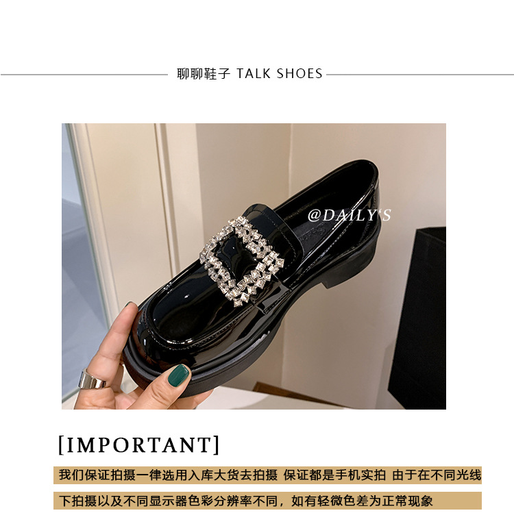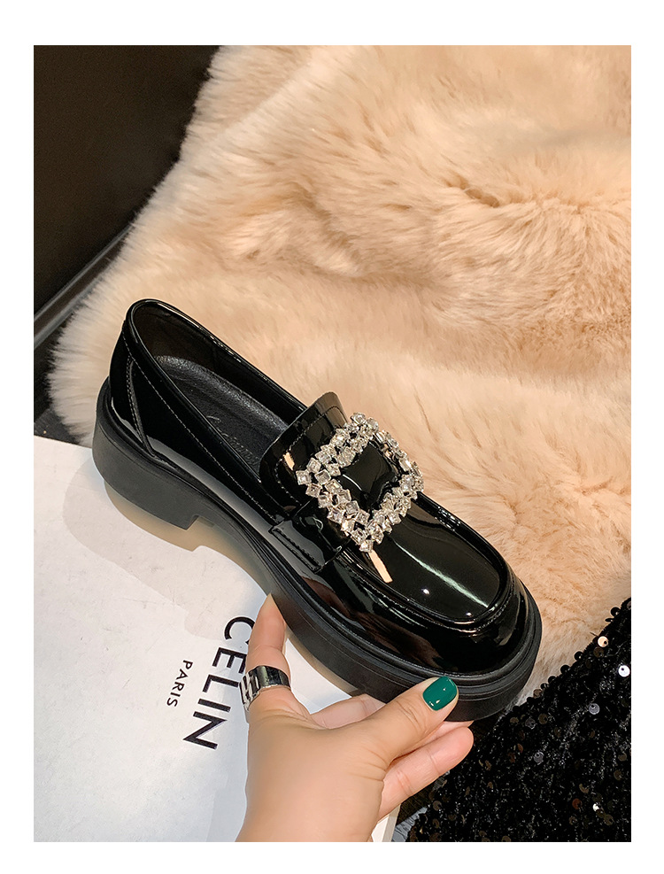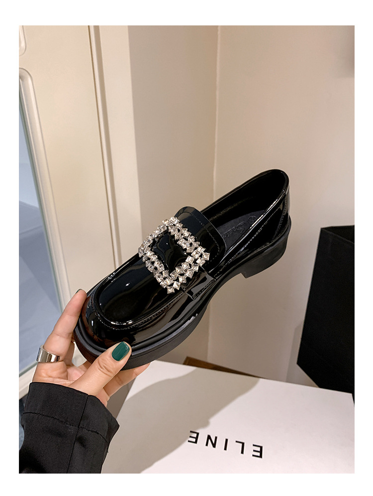 부드러운 가죽 버전 페이턴트 가죽 두꺼운 밑창 로퍼 여성용 가을과 겨울 새로운 라인 석 스퀘어 버클 라운드 토 브리티시 청키 힐 작은 가죽 신발 단층 신발